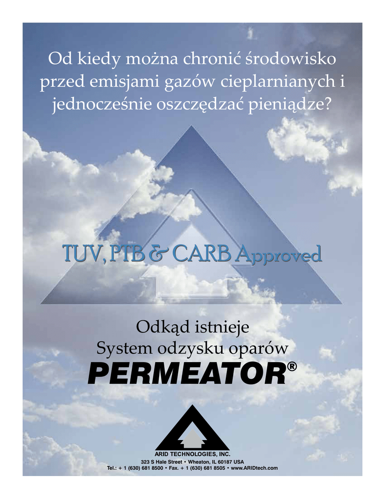 Od kiedy można chronić środowisko przed emisjami gazów cieplarnianych i jednocześnie oszczędzać pieniądze? TUV, PTB & CARB Approved Odkąd istnieje System odzysku oparów PERMEATOR ® 323 S Hale Street • Wheaton, IL 60187 USA Tel.: + 1 (630) 681 8500 • Fax. + 1 (630) 681 8505 • www.ARIDtech.com PERMEATOR® • redukuje straty oparów benzynowych o 99,3% i w ten sposób oszczędzają Państwo pieniądze • chronią środowisko • łatwy montaż na wszystkich istniejących stacjach benzynowych • wydajność potwierdzona na podstawie testów, przeprowadzanych przez niezależnych rzeczoznawców • niezawodność potwierdzona na podstawie ponad 380 instalacji • zezwolenie UL 698A, TUV, PTB • zezwolenie California Air Resources Board (CARB) Przy zastosowaniu z patentowanym systemem membranowym, PERMEATOR zapobiega wydobywaniu się emisji oparów benzynowych (VOC’s) ze zbiorników magazynowych dla benzyny. Od dziesiątków lat stosowany w rafineriach i na bazach paliw, obecnie ARID Technologies oferuje taką samą wytrzymałą technologię również dla stacji benzynowych. GŁÓWNE CECHY URZĄDZENIA PERMEATOR redukuje emisje benzyn powyżej 99%, równocześnie zwiększając ilość sprzedanego produktu w stosunku do 0.5% (5 litrów na 1000 litrów dostarczonej benzyny). PERMEATOR przerabia zwyżkę objętości oparów benzyn (520-1) używając do tego celu opatentowany system membranowy. PERMEATOR może być instalowany bez wykopów i jest prosty w obsłudze. Zwarta w budowie jednostka może być łatwo dostosowana do nowo projektowanych stacji benzynowych, do istniejącego na stacjach drugiego stopnia zmniejszenia emisji oparów (asysta próżniowa lub wahadło) lub zainstalowana na stacjach bez drugiego stopnia odzysku oparów. Na stacjach benzynowych wyposażonych w drugi stopień odzysku oparów PERMEATOR poprawia odzysk oparów w procesie tankowania pojazdów bez pogorszenia wskaźników redukcji emisji ze zbiorników magazynowych. Ponieważ drugi stopień odzysku oparów montowany jest coraz szerzej na stacjach benzynowych Unii Europejskiej, zastosowanie PERMEATOR zwiększy efektywność sprzedaży produktu, a także przyczyni się do zwiększenia stopnia ochrony środowiska. 323 S Hale Street • Wheaton, IL 60187 USA Tel.: + 1 (630) 681 8500 • Fax. + 1 (630) 681 8505 www.ARIDtech.com Zalety Niskie koszty zakupu: ˂ 1-2% ceny budowy nowego, typowego obiektu. Koszty można porównać z nowym MPD (Multiple Product Dispenser). Wysokie zyski z kapitału (ROI) Krótki czas amortyzacji. Odzysk oparów: 2 – 5 litrów na 1000 litrów!! Wysokojakościowy design: • wydajności sprawdzone przez niezależnych rzeczoznawców i dopuszczone do eksploatacji. • zezwolenie California Air Resources Board (CARB*) • UL 698A Approved *znany na świecie, ze względu na szczególnie ostre przepisy Przyjazna dla środowiska technologia: • wysoka wydajność odzysku węglowodorów > 99%! • bez spalania oparów benzyny i tym samym brak wtórnego zanieczyszczenia powietrza. Jedyny w swoim rodzaju opatentowany system membranowy: • obrabia 520-krotny wzrost objętości, wywoływany parowaniem benzyny. • umożliwia selektywne wyłapywanie toksycznych, organicznych związków jak benzen, toluol i MTBE. • umożliwia eksploatację systemów wspieranych próżniowo w wyższych relacjach potoków objętościowych (V/L). Zwiększenie zysku netto. Maksymalna dostępność instalacji. Brak jakichkolwiek trudności. Godne zaufania. Elegancki, zwarty, trwały design: Możliwość zastosowania na wszystkich istniejących stacjach benzynowych, łącznie z instalacjami Stage II. Łatwy montaż bez lub z minimalnym wykopem. Łatwy rozruch. Niskie koszty eksploatacji. Minimalna konserwacja. Okres użytkowania: 15-20 lat. 3 lata gwarancji. Niezawodny design: • Moduł membranowy nie posiada żadnych ruchomych części. • Niezmienny stan na etapie separacji gazu. Wszystkie potoki oparów pozostają w fazie gazowej. • Ponad 380 zainstalowanych systemów. ARIDAS: Arid Remote Data Acquisition System • Możliwość zdalnej diagnostyki i zdalnego przyjmowania danych przy pomocy modemu. • Rejestracja parametrów roboczych przy pomocy czujników, Data-Logger i modemu. Ochrona środowiska. Ochrona ludności i użytkownika. Ochrona zysku netto Państwa firmy. Ochrona środowiska: • Redukcja zanieczyszczeń wody gruntowej węglowodorami. • Eliminacja emisji VOC’s. Wydajność: • Wysoka wydajność zasysania w miejscu styku „zawór czerpalny – pojazd”. Natychmiastowy meldunek przy odchyleniach całego systemu zbiorników magazynowych. Maksymalnie dostępny czas eksploatacji. Obliczenie objętości zaoszczędzonej benzyny.