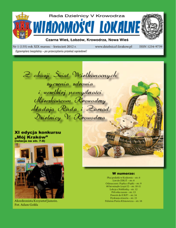 Nr 1 (135) rok XIX marzec - kwiecień 2012 r. www.dzielnica5.krakow.pl ISSN 1234-9739 Z okazji Świąt Wielkanocnych życzenia zdrowia i wszelkiej pomyślności Mieszkańcom Krowodrzy składają Rada i Zarząd Dzielnicy V Krowodrza XI edycja konkursu „Mój Kraków” (relacja na str. 7-8) W numerze: Akordeonista Krzysztof Jamróz. Fot. Adam Gołda Płać podatki w Krakowie – str. 6 List do ZIKiT – str. 6 Odznaczeni: Piątka z Piątki – str. 9 80 lat minęło (część I) – str. 10-11 Lekcja z Noblistką – str. 12 Pół roku razem – str. 13 Powrót do II RP? – str. 14 Dyskusja otwarta – str. 15 Felieton Piotra Klimowicza – str. 16 Z prac Rady i Zarządu Podczas XIV sesji Rady Dzielnicy V Krowodrza, która odbyła się 20 grudnia 2011 r.: - pozytywnie zaopiniowano wniosek o lokalizację kasyna gry w hotelu „Novotel Bronowice” przy ul. Armii Krajowej 11 dla ZPR SA; - ustalono następującą kolejność zadań remontowych chodników na rok 2011: 1. ul. Wrocławska od ul. Prądnickiej do ul. Friedleina (wzdłuż Szpitala Wojskowego), 2. ul. Czarnowiejska od al. Mickiewicza do przystanku MPK i od ul. Konarskiego do nr 39, 3. ul. Zakątek 1 i 3, 4. ul. Lea 75, 5. ul. Biernackiego do stacji trafo i ul. Wyspiańskiego - od ul. Biernackiego do ul. Grottgera (strona parzysta) – remont chodników, 6. ul. Chocimska 20 - do al. Kijowskiej, 7. remont chodnika od skrzyżowania ul. Czarnowiejskiej z ul. Urzędniczą do baru „Żaczek”, 8. podwórko ul. Grottgera 3 – przełożenie trylinki, 9. podwórko ul. Królewska nr 60-70 – przełożenie trylinki, 10. ul. Kazimierza Wielkiego od ul. Przeskok do stacji Orlen – strona nieparzysta od al. Kijowskiej do nr 104 i od ul. Galla do nr 112 – strona parzysta, 11. ul. Odrowąża. Rada Dzielnicy zawnioskowała, aby materiałem użytym do remontów chodników na terenie Dzielnicy V Krowodrza była kostka brukowa bez fazowania. 2 Mając na uwadze zasługi, jakie dla organizacji życia społecznego najmłodszych mieszkańców Miasta Krakowa oddają Młodzieżowe Domy Kultury, Rada Dzielnicy V Krowodrza wyraziła swoje negatywne stanowisko wobec projektu zmian organizacyjnych w tych placówkach. Proponowane przekształcenia Młodzieżowych Domów Kultury z placówek prowadzonych przez Gminę Miejską Kraków na stowarzyszenia działające na podstawie ustawy o stowarzyszeniach i wolontariacie, doprowadzi do likwidacji znacznej części nieodpłatnych i niskopłatnych zajęć przeznaczonych dla dzieci i młodzieży, zmieniając charakter Młodzieżowych Domów Kultury ze społecznego na komercyjny i rynkowy. Zawnioskowano zatem do Prezydenta Miasta Krakowa o podjęcie wszelkich możliwych działań, nie dopuszczających do zmniejszenia środków przeznaczonych na funkcjonowanie Młodzieżowych Domów Kultury, co spowoduje zmniejszenie ich różnorodnej i bogatej oferty edukacyjnej i kulturalnej. Z uwagi na powyższe argumenty, zaapelowano do radnych Miasta Krakowa o zajęcie negatywnego stanowiska i odrzucenie wszelkich projektów uchwał zmierzających do likwidacji Młodzieżowych Domów Kultury. Zawnioskowano do Biura Planowania Przestrzennego o wprowadzenie do tworzonego miejscowego planu zagospodarowania przestrzennego dla obszaru „Młynówka Królewska-Grottgera” następujących postulatów: 1. niedogęszczanie zabudowy w rejonie parku na działkach nr: 251/17 obr. 4 Krowodrza , 490/18, 490/19, 490/20, 490/21, 490/22, 490/23, 490/24, 490/25, 490/26, 490/27, 490/28, 490/29 – obr. 4 Krowodrza, 493/3, 265, 266, 267, 260, 261/2, 263/1, 526/4 – obr. 3 Krowodrza, 6/11, 6/7, 6/13 – obr. 4 Krowodrza, 19 obr. 4 Krowodrza, 93 obr. 46 Krowodrza, 34 obr. 4 Krowodrza 58/1, 58/2, 60/3, 48 obr. 4 Krowodrza251/4, 251/3 obr. 4 Krowodrza 107/1, 109/3, 108/3, 108/4, 724/2, 308, 545/2, 560/2, 560/3, 560/5, 241/1, 240/6, 570/3, 240/9, 241/8, 560/1, 244/7, 243/4, 243/5, 244/16, 243/9, 244/10, 244/11, 243/10, 243/7 obr. 3 Krowodrza, 2. utrzymanie istniejącej zieleni parkowej (załącznik nr 1 ZP), 3. objęcie ochroną przed zabudową terenu – działka nr 848/2 obr. 4 Krowodrza - przeznaczonego na Rynek Krowoderski przy skrzyżowaniu al. Kijowskiej a ul. Królewską i ul. Nowowiejską (załącznik nr 1 RK). Mając na uwadze potrzebę zachowania, ochrony i rozwoju miejsc szczególnie ważnych dla mieszkańców naszej dzielnicy i miasta, doceniając unikalny i historyczny charakter zabytków, zieleni parkowej oraz przestrzeni urbanistycznej całej Młynówki Królewskiej, Rada Dzielnicy V Krowodrza zawnioskowała do Prezydenta Miasta Krakowa o podjęcie niezbędnych działań, zmierzających do utworzenia parku kulturowego, w myśl przepisów zawartych w ustawie z dnia 23 lipca 2003 r. o ochronie zabytków i opiece nad zabytkami, na terenie Parku Młynówka Królewska. Zawnioskowano też do Rady Miasta Krakowa o zaangażowanie się w proces przygotowywania i tworzenia parku kulturowego na terenie Młynówki Królewskiej. Zawnioskowano do Prezydenta Miasta Krakowa, aby uwolnione w wyniku „racjonalizacji siatki placówek oświatowych” budynki na terenie Dzielnicy V Krowodrza przeznaczyć na potrzeby placówek przedszkolnych, których brak jest bardzo odczuwalny przez mieszkańców Krakowa. W przypadku pozostawania takiego dyspozycyjnego budynku na terenie Dzielnicy V Krowodrza, zawnioskowano również o przygotowanie planu inwestycyjnego służącego dostosowaniu budynku do potrzeb przedszkolaków. Podczas XV sesji Rady Dzielnicy V Krowodrza, która odbyła się 24 stycznia 2012 r.: - pozytywnie zaopiniowano wniosek o lokalizację kasyna gry w hotelu „Novotel Bronowice” przy ul. Armii Krajowej 11 dla „Finkorp” sp. z o.o.; - uchwalono plan wydatków rzeczowo-finansowych na rok 2012 wg załącznika nr 1 do niniejszej uchwały: - w związku ze złożonym 20 stycznia 2012 r. pisemnym zrzeczeniem się mandatu Rada Dzielnicy V Krowodrza stwierdziła wygaśnięcie mandatu radnej Dzielnicy V Krowodrza – Beaty Pojnar. Zmieniono zakres 