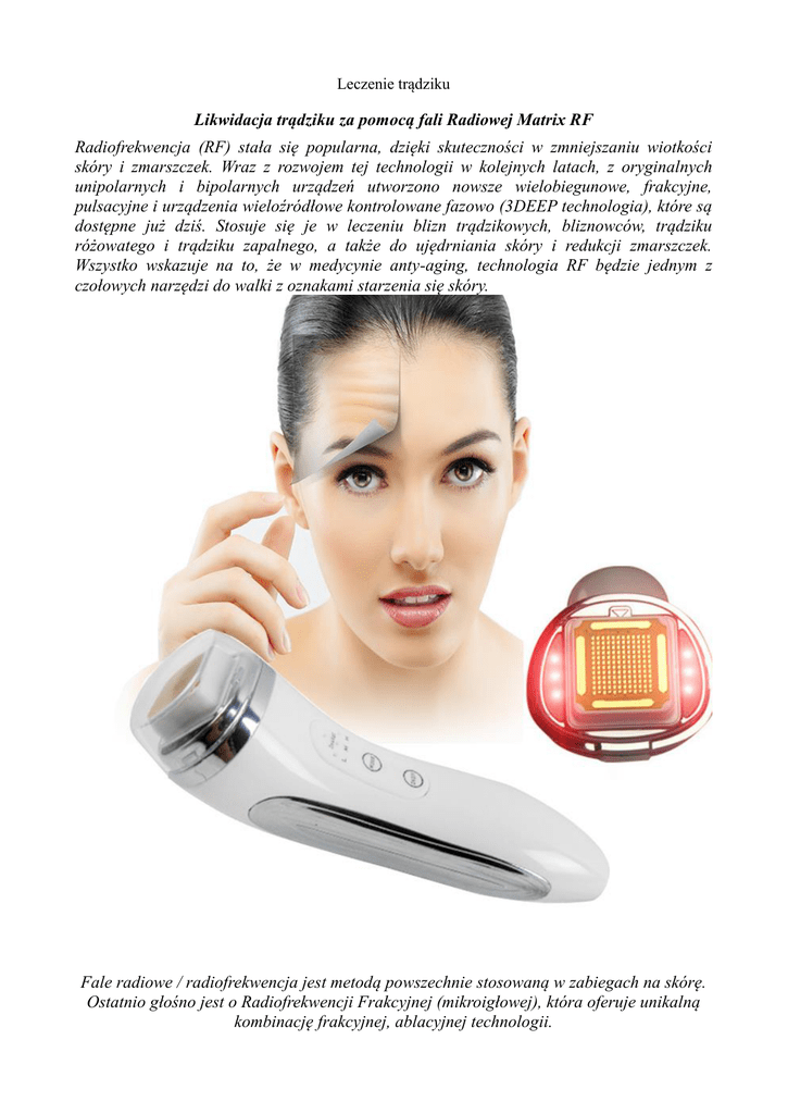 Leczenie trądziku Likwidacja trądziku za pomocą fali Radiowej Matrix RF Radiofrekwencja (RF) stała się popularna, dzięki skuteczności w zmniejszaniu wiotkości skóry i zmarszczek. Wraz z rozwojem tej technologii w kolejnych latach, z oryginalnych unipolarnych i bipolarnych urządzeń utworzono nowsze wielobiegunowe, frakcyjne, pulsacyjne i urządzenia wieloźródłowe kontrolowane fazowo (3DEEP technologia), które są dostępne już dziś. Stosuje się je w leczeniu blizn trądzikowych, bliznowców, trądziku różowatego i trądziku zapalnego, a także do ujędrniania skóry i redukcji zmarszczek. Wszystko wskazuje na to, że w medycynie anty-aging, technologia RF będzie jednym z czołowych narzędzi do walki z oznakami starzenia się skóry. Fale radiowe / radiofrekwencja jest metodą powszechnie stosowaną w zabiegach na skórę. Ostatnio głośno jest o Radiofrekwencji Frakcyjnej (mikroigłowej), która oferuje unikalną kombinację frakcyjnej, ablacyjnej technologii. Energia prądu RF wytwarza w skórze efekt frakcyjny, czyli punktową ablację skóry i silne podgrzanie stymulujące reakcje gojenia, zachowując wokół zdrową nietknięta tkankę. Skóra stymulowana przez ciepło ulega przebudowie, co prowadzi do pogrubienia i regeneracji tkanki łącznej, oraz realnego odmłodzenia jej wyglądu. Rezultat Radiofrekwencji Frakcyjnej (mikroigłowej) ablacji naskórka i głębszych warstw skóry, daje podobne efekty jak frakcyjny laser CO2 i pozostałe metody i lasery nie ablacyjne. To połączenie: frakcyjne podgrzanie głębszych warstw skóry z efektem ablacji naskórka nazywane jest Sublative Resurfacing. Wykazano, iż to połączenie ablacji naskórka i ogrzewania skóry falami o częstotliwości radiowej jest bezpieczne dla wszystkich typów skóry, wykorzystuje się je do poprawy wiotkości skóry, redukcji zmarszczek, powiększonych porów, przebarwień, trądziku, teleangiektazji oraz blizn powstałych w wyniku urazów lub trądziku. Okres rekonwalescencji pacjenta jest znacznie krótszy niż w przypadku ablacji laserowych, a ewentualne działania niepożądane są niewielkie. Wstępne badania oceniające skuteczność kliniczną urządzenia Matrix RF (Syneron, Irvine, CA, Stany Zjednoczone) wykonujące frakcyjną ablację o częstotliwości radiowej, które przeprowadzono na dwóch grupach wykazały, iż 2 dni po leczeniu zaobserwowano całkowite wygojenie ran po abdominoplastyce, zwiększoną syntezą nowego, gęstego kolagenu w skórze. Większość uczestników, którzy poddali się zabiegom na twarz, była zadowolona z wyników leczenia. Osoby te stwierdziły, iż zabieg powoduje minimalny ból, nie pozostawia trwałych skutków ubocznych oraz znacznych przestojów. Po 1 miesiącu, zaobserwowano ogólną poprawę u ponad 80% uczestników w stanie skóry twarzy, tj. gładsza, jaśniejsza i bardziej napięta skóra. W innym badaniu przeanalizowano skuteczność urządzenia Fractora (Invasix, Irvine, CA USA) do ablacji falami radiowymi. Wyniki ujawniły ogólne podnoszenie jakości skóry po 36 miesięcy po zabiegu oraz znaczną poprawę w obrębie zmarszczek, wiotkości, pigmentacji, napięcia skóry i blizn potrądzikowych we wszystkich typów skóry. U większości badanych wystąpił obrzęk i rumień w pierwszych 7 dniach po leczeniu z rezolucją po 2 tygodniach. Ponownie epitelizację naskórka zaobserwowano w ciągu 4-7 dni, bez zaobserwowanych przypadków opóźnionego gojenia lub działań niepożądanych. Badanie klinicznie trzeciego urządzenia, działającego na tej samej zasadzie, EndyMed PRO (EndyMed Medical, Caesarea, Izrael), również potwierdziło jego skuteczność w redukcji zmarszczek i zwiotczenia skóry.