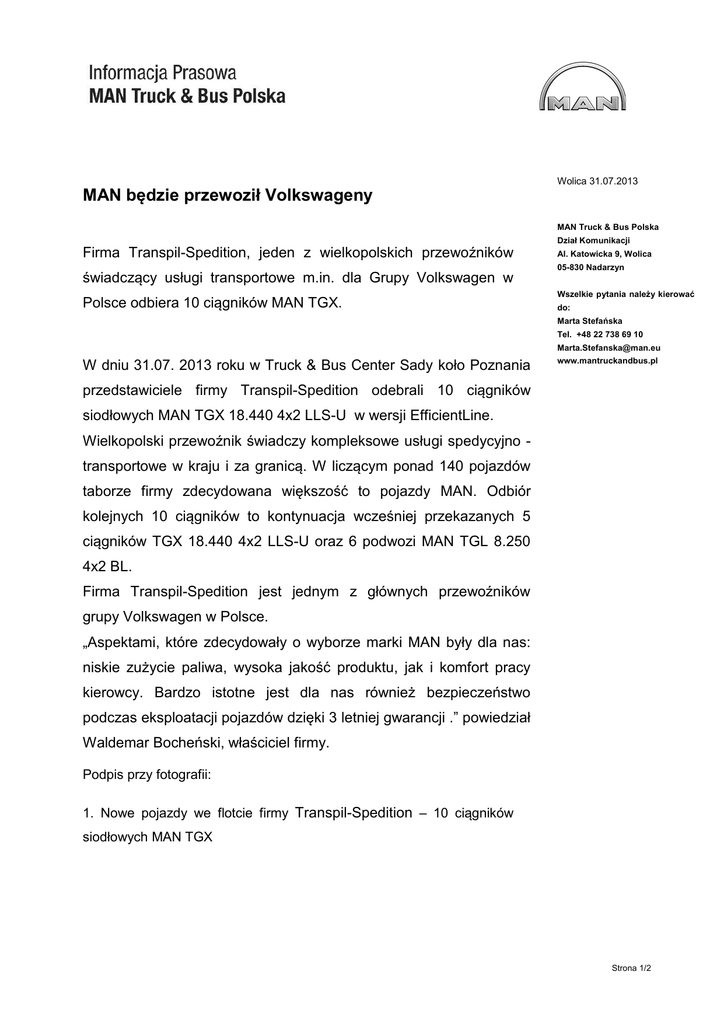 MAN będzie przewoził Volkswageny Wolica 31.07.2013 MAN Truck & Bus Polska Firma Transpil-Spedition, jeden z wielkopolskich przewoźników świadczący usługi transportowe m.in. dla Grupy Volkswagen w Polsce odbiera 10 ciągników MAN TGX. Dział Komunikacji Al. Katowicka 9, Wolica 05-830 Nadarzyn Wszelkie pytania należy kierować do: Marta Stefańska Tel. +48 22 738 69 10 [email protected] W dniu 31.07. 2013 roku w Truck & Bus Center Sady koło Poznania www.mantruckandbus.pl przedstawiciele firmy Transpil-Spedition odebrali 10 ciągników siodłowych MAN TGX 18.440 4x2 LLS-U w wersji EfficientLine. Wielkopolski przewoźnik świadczy kompleksowe usługi spedycyjno transportowe w kraju i za granicą. W liczącym ponad 140 pojazdów taborze firmy zdecydowana większość to pojazdy MAN. Odbiór kolejnych 10 ciągników to kontynuacja wcześniej przekazanych 5 ciągników TGX 18.440 4x2 LLS-U oraz 6 podwozi MAN TGL 8.250 4x2 BL. Firma Transpil-Spedition jest jednym z głównych przewoźników grupy Volkswagen w Polsce. „Aspektami, które zdecydowały o wyborze marki MAN były dla nas: niskie zużycie paliwa, wysoka jakość produktu, jak i komfort pracy kierowcy. Bardzo istotne jest dla nas również bezpieczeństwo podczas eksploatacji pojazdów dzięki 3 letniej gwarancji .” powiedział Waldemar Bocheński, właściciel firmy. Podpis przy fotografii: 1. Nowe pojazdy we flotcie firmy Transpil-Spedition – 10 ciągników siodłowych MAN TGX Strona 1/2 Program zwiększania efektywności transportu firmy MAN Truck & Bus Transport i ruch na drogach europejskich wciąż wzrasta. Jednocześnie malejące zasoby energii sprawiają, że transport w dalszej perspektywie będzie coraz droższy. Jako jeden z czołowych producentów pojazdów ciężarowych i autobusów na świecie firma MAN Truck & Bus wnosi istotny wkład w ciągłe zwiększanie efektywności transportu. Firma MAN oferuje szeroki program obniżania ogólnych kosztów eksploatacji (Total Cost of Ownership). Efektywność transportu, uwarunkowana czynnikami, takimi jak technologia, serwis, kierowcy i badania rozwojowe, przyczynia się do ochrony środowiska i przedstawia dodatkową wartość dla naszych klientów. Grupa MAN jest jednym z wiodących europejskich przedsiębiorstw przemysłowych działających w dziedzinie inżynierii związanej z transportem, osiągającym obrót około 15,8 mld € (2012 r.). Jako dostawca ciężarówek, autobusów, silników Diesla, turbozespołów oraz specjalistycznych przekładni firma MAN zatrudnia około 54 300 pracowników na całym świecie. Firma zajmuje wiodące pozycje na rynku we wszystkich obszarach swej działalności biznesowej. Strona 2/2