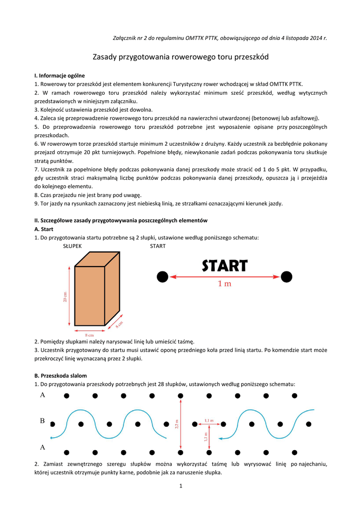 Załącznik nr 2 do regulaminu OMTTK PTTK, obowiązującego od dnia 4 listopada 2014 r. Zasady przygotowania rowerowego toru przeszkód I. Informacje ogólne 1. Rowerowy tor przeszkód jest elementem konkurencji Turystyczny rower wchodzącej w skład OMTTK PTTK. 2. W ramach rowerowego toru przeszkód należy wykorzystać minimum sześć przeszkód, według wytycznych przedstawionych w niniejszym załączniku. 3. Kolejność ustawienia przeszkód jest dowolna. 4. Zaleca się przeprowadzenie rowerowego toru przeszkód na nawierzchni utwardzonej (betonowej lub asfaltowej). 5. Do przeprowadzenia rowerowego toru przeszkód potrzebne jest wyposażenie opisane przy poszczególnych przeszkodach. 6. W rowerowym torze przeszkód startuje minimum 2 uczestników z drużyny. Każdy uczestnik za bezbłędnie pokonany przejazd otrzymuje 20 pkt turniejowych. Popełnione błędy, niewykonanie zadań podczas pokonywania toru skutkuje stratą punktów. 7. Uczestnik za popełnione błędy podczas pokonywania danej przeszkody może stracić od 1 do 5 pkt. W przypadku, gdy uczestnik straci maksymalną liczbę punktów podczas pokonywania danej przeszkody, opuszcza ją i przejeżdża do kolejnego elementu. 8. Czas przejazdu nie jest brany pod uwagę. 9. Tor jazdy na rysunkach zaznaczony jest niebieską linią, ze strzałkami oznaczającymi kierunek jazdy. II. Szczegółowe zasady przygotowywania poszczególnych elementów A. Start 1. Do przygotowania startu potrzebne są 2 słupki, ustawione według poniższego schematu: SŁUPEK START 2. Pomiędzy słupkami należy narysować linię lub umieścić taśmę. 3. Uczestnik przygotowany do startu musi ustawić oponę przedniego koła przed linią startu. Po komendzie start może przekroczyć linię wyznaczaną przez 2 słupki. B. Przeszkoda slalom 1. Do przygotowania przeszkody potrzebnych jest 28 słupków, ustawionych według poniższego schematu: A B A 2. Zamiast zewnętrznego szeregu słupków można wykorzystać taśmę lub wyrysować linię po najechaniu, której uczestnik otrzymuje punkty karne, podobnie jak za naruszenie słupka. 1 3. Konkurencja polega na przejechaniu pomiędzy każdym z 10 słupków ustawionych w szeregu w linii B bez najechania, przewrócenia, ominięcia słupków tworzących element zarówno linii A jak i B. 4. Punktacja: 1) za przewrócenie słupka – strata 1 punktu, 2) za ominięcie słupka – strata 1 punktu, 3) za każdą podpórkę nogą – strata 1 punktu, 4) za wyjechanie poza slalom – strata 1 punktu, 5) maksymalnie za slalom można stracić 5 punktów. C. Przeszkoda ósemka 1. Do przygotowania tej przeszkody potrzebnych jest 50 słupków, ustawionych według poniższego schematu: 2. Ósemkę można wymalować. W takim przypadku stratę punktu liczy się za każde najechanie na linię wyznaczającą przeszkodę. 3. Konkurencja polega na przejechaniu rowerem toru, oznaczonego przez wnętrze i zewnętrzne okręgi wyznaczające przeszkodę ósemki, bez przewrócenia słupków (lub najechania na linię). 4. Punktacja: 1) za przewrócenie słupka (najechanie na linię) – strata 1 punktu, 2) za każdą podpórkę nogą – strata 1 punktu, 3) za wyjechanie poza ósemkę obydwoma kołami – strata 1 punktu, 4) maksymalnie za ósemkę można stracić 5 punktów. D. Przeszkoda jazda na wprost 1. Do przygotowania tej przeszkody potrzebna jest deska o długości od 4 do 8 metrów, szerokości około 20 cm. 2. Konkurencja polega na wjechaniu na deskę i przejechaniu wzdłuż całej jej długości. Pokonanie przeszkody liczy się od momentu wjazdu pierwszego koła do opuszczenia przeszkody przez tylne koło. 3. Punktacja: 1) za zjechanie z deski jednym kołem – strata 1 punktu, 2) za zjechanie z deski dwoma kołami – strata 2 punktów, 3) maksymalnie za jazdę na wprost można stracić 2 punkty. 2 E. Przeszkoda przenoszenie przedmiotu 1. Do przygotowania tej przeszkody potrzebne są dwa krzesła i jeden słupek, ustawione według poniższego schematu: 2. Konkurencja polega na przewiezieniu przedmiotu z jednego krzesła i umieszczeniu go na drugim krześle. 3. Punktacja: 1) upuszczenie słupka w trakcie przenoszenia – strata 1 punktu, 2) przewrócenie słupka w trakcie ustawiania na drugim krześle – strata 1 punktu, 3) podpórka nogą podczas chwytania bądź stawiania słupka – strata 1 punktu, 4) maksymalnie za przenoszenie przedmiotu można stracić 2 punkty. F. Przeszkoda rzut piłką do celu 1. Do przygotowania tej przeszkody potrzebne są krzesło, piłka tenisowa oraz kosz, ustawione według poniższego schematu. Kosz i krzesło ustawione są bezpośrednio na powierzchni, po której porusza się rowerzysta. Kosz powinien być ustawiony w odległości 3 merów od toru jazdy. 2. Konkurencja polega na podniesieniu przedmiotu z krzesła i umieszczeniu go w koszu. 3. Punktacja: 1) upuszczenie piłki – strata 1 punku, 2) nietrafienie piłką do kosza – strata 1 punktu, 3) każda podpórka nogą podczas wykonywania zadania – strata 1 punktu, 4) maksymalnie za rzut piłką do celu można stracić 3 punkty. 3 G. Przeszkoda garaż 1. Do przygotowania przeszkody potrzebne są trzy tyczki, z tego dwie na stojakach, ustawione według poniższego schematu. 2. Konkurencja polega na przejechaniu przez bramkę bez strącenia poziomej tyczki oraz potrącenia tyczek stojących. 2. Punktacja: 1) strącenie tyczki – strata 1 punktu, 2) strącenie tyczki, przewrócenie tyczki lub tyczek na stojakach – strata 2 punktów, 3) maksymalnie za garaż można stracić 2 punkty. H. Przeszkoda bramka 1. Do przygotowania przeszkody potrzebna jest bramka wykonana według schematu, dwie tyczki do zawieszenia oraz dwa słupki. 2. Konkurencja polega na przejechaniu przez bramkę w ten sposób, aby koło roweru przeszło pomiędzy słupkami stojącymi na ziemi, a rowerzysta zmieścił się pomiędzy wiszącymi tyczkami, bez ich poruszenia. 3. Punktacja: 1) poruszenie kołem słupka stającego na ziemi – strata 1 punktu 2) ominięcie słupkó