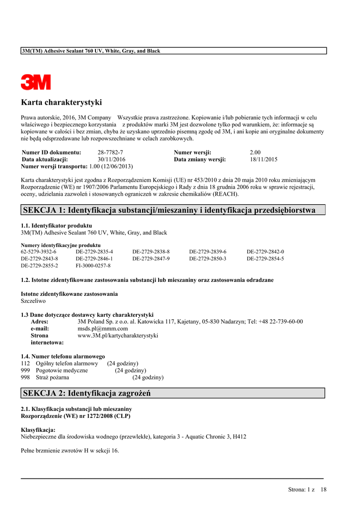 3M(TM) Adhesive Sealant 760 UV, White, Gray, and Black Karta charakterystyki Prawa autorskie, 2016, 3M Company Wszystkie prawa zastrzeżone. Kopiowanie i/lub pobieranie tych informacji w celu właściwego i bezpiecznego korzystania z produktów marki 3M jest dozwolone tylko pod warunkiem, że: informacje są kopiowane w całości i bez zmian, chyba że uzyskano uprzednio pisemną zgodę od 3M, i ani kopie ani oryginalne dokumenty nie będą odsprzedawane lub rozpowszechniane w celach zarobkowych. Numer ID dokumentu: 28-7782-7 Data aktualizacji: 30/11/2016 Numer wersji transportu: 1.00 (12/06/2013) Numer wersji: Data zmiany wersji: 2.00 18/11/2015 Karta charakterystyki jest zgodna z Rozporządzeniem Komisji (UE) nr 453/2010 z dnia 20 maja 2010 roku zmieniającym Rozporządzenie (WE) nr 1907/2006 Parlamentu Europejskiego i Rady z dnia 18 grudnia 2006 roku w sprawie rejestracji, oceny, udzielania zazwoleń i stosowanych ograniczeń w zakresie chemikaliów (REACH). SEKCJA 1: Identyfikacja substancji/mieszaniny i identyfikacja przedsiębiorstwa 1.1. Identyfikator produktu 3M(TM) Adhesive Sealant 760 UV, White, Gray, and Black Numery identyfikacyjne produktu 62-5279-3932-6 DE-2729-2835-4 DE-2729-2843-8 DE-2729-2846-1 DE-2729-2855-2 FI-3000-0257-8 DE-2729-2838-8 DE-2729-2847-9 DE-2729-2839-6 DE-2729-2850-3 DE-2729-2842-0 DE-2729-2854-5 1.2. Istotne zidentyfikowane zastosowania substancji lub mieszaniny oraz zastosowania odradzane Istotne zidentyfikowane zastosowania Szczeliwo 1.3 Dane dotyczące dostawcy karty charakterystyki Adres: 3M Poland Sp. z o.o. al. Katowicka 117, Kajetany, 05-830 Nadarzyn; Tel: +48 22-739-60-00 e-mail: [email protected] Strona www.3M.pl/kartycharakterystyki internetowa: 1.4. Numer telefonu alarmowego 112 Ogólny telefon alarmowy (24 godziny) 999 Pogotowie medyczne (24 godziny) 998 Straż pożarna (24 godziny) SEKCJA 2: Identyfikacja zagrożeń 2.1. Klasyfikacja substancji lub mieszaniny Rozporządzenie (WE) nr 1272/2008 (CLP) Klasyfikacja: Niebezpieczne dla środowiska wodnego (przewlekłe), kategoria 3 - Aquatic Chronic 3, H412 Pełne brzmienie zwrotów H w sekcji 16. __________________________________________________________________________________________ Strona: 1 z 18 3M(TM) Adhesive Sealant 760 UV, White, Gray, and Black 2.2. Elementy oznakowania Rozporządzenie (WE) nr 1272/2008 (CLP) Zwroty H412 wskazujące rodzaj zagrożenia: Działa szkodliwie na organizmy wodne, powodując długotrwałe skutki. Zwroty wskazujące środki ostrożności: Usuwanie: P501 Zawartość/pojemnik usuwać zgodnie z miejscowymi/regionalnymi/krajowymi/międzynarodowymi przepisami. Informacje uzupełniające: Informacje uzupełniające o zagrożeniach: EUH208 Zawiera: Cyna,dioktylu bis (2,4-pentanodionato-kappa.O2, kappa.O4) . | N-(3-(trimetoksysililo)propyl)etylenodiamina. Może powodować wystąpienie reakcji alergicznej. Wskazówki dotyczące oznakowania: Na podstawie testów nie sklasyfikowany jako niebezpieczny dla oczu. Specyficzne stężenie graniczne dla tlenku wapnia (CAS: 1305-78-8): >= 50% Skin Corr. 1C; >= 10-<50% Skin Irrit. 2. 2.3. Inne zagrożenia U osób nadwrażliwych (alergików) uczulonych na działanie amin może wystąpić reakcja krzyżowa na inne aminy. SEKCJA 3: Skład/informacja o składnikach Nazwa substancji Aminy z zawadą przestrzenną Nr CAS 63843-89-0 Nr WE 264-513-3 Stężenie % < 0,2 Węglan wapnia 471-34-1 207-439-9 25 - Ditlenek tytanu 13463-67-7 236-675-5 0 - 15 Węglan wapnia 1317-65-3 215-279-6 1 - 15 DI-C9-11-rozgałęzione estry alkilowe kwasu ftalowego, bogate w C10 (Numer rejestracji REACH:01-2119422347-43) Tlenek wapnia 68515-49-1 271-091-4 1 - 15 1305-78-8 215-138-9 1- 5 Sulfonian fenolowo-alkilowy Tajemnica handlowa 0- 5 45 Klasyfikacja Aquatic Chronic 1, H410,M=10 (Dostawca) Acute Tox. 4, H302 (Klasyfikacja 3M) Substancja z określoną na poziomie Wspólnoty wartością najwyższego dopuszczalnego stężenia w środowisku pracy Substancja z określoną na poziomie Wspólnoty wartością najwyższego dopuszczalnego stężenia w środowisku pracy Substancja niesklasyfikowana jako niebezpieczna Substancja niesklasyfikowana jako niebezpieczna EUH071; Skin Corr. 1C, H314 (Klasyfikacja 3M) Substancja niesklasyfikowana jako niebezpieczna __________________________________________________________________________________________ Strona: 2 z 18 3M(TM) Adhesive Sealant 760 UV, White, Gray, and Black Tlenek żeaza 1317-61-9 215-277-5 0- 5 N-(3(trimetoksysililo)propyl)etylenodiamina 1760-24-3 217-164-6 0,1 - Pyły sadzy technicznej 1333-86-4 215-609-9 0- 1 Cyna,dioktylu bis (2,4-pentanodionatokappa.O2, kappa.O4) - 54068-28-9 0,1 - 1 Polieter Tajemnica handlowa 20 - 35 1 Substancja niesklasyfikowana jako niebezpieczna Acute Tox. 4, H332; Acute Tox. 4, H302; Eye Dam. 1, H318; Skin Sens. 1, H317; STOT SE 3, H335 (Klasyfikacja 3M) Substancja z określoną na poziomie Wspólnoty wartością najwyższego dopuszczalnego stężenia w środowisku pracy Skin Sens. 1B, H317; Repr. 2, H361d; Aquatic Chronic 2, H411 (Klasyfikacja 3M) Substancja niesklasyfikowana jako niebezpieczna W sekcji 16 znajduje się pełny tekst zwrotów H użytych w powyższej tabeli. Informacje dotyczące najwyższych dopuszczalnych stężeń i substancji PBT i vPvB znajdują się w sekcji 8 i 12 karty charakterystyki. SEKCJA 4: Środki pierwszej pomocy 4.1. Opis środków pierwszej pomocy Drogi oddechowe Jeżeli objawy narażenia wystąpią, wyprowadzić poszkodowanego na świeże powietrze. Jeżeli objawy podrażnienia nie ustępują, wezwać lekarza. Kontakt ze skórą Natychmiast przemyć dużą ilością wody z mydłem. Zanieczyszczone ubranie i buty wyczyścić przed ponownym użyciem. Jeżeli objawy narażenia wystąpią, skontaktować się z lekarzem. Kontakt z oczami Wypłukać dużą ilością wody. Usunąć szkła kontaktowe. Nadal płukać. Jeżeli objawy nie ustępują, skontaktować się z lekarzem. W przypadku połknięcia: Wypłukać usta. Jeżeli objawy podrażnienia nie ust