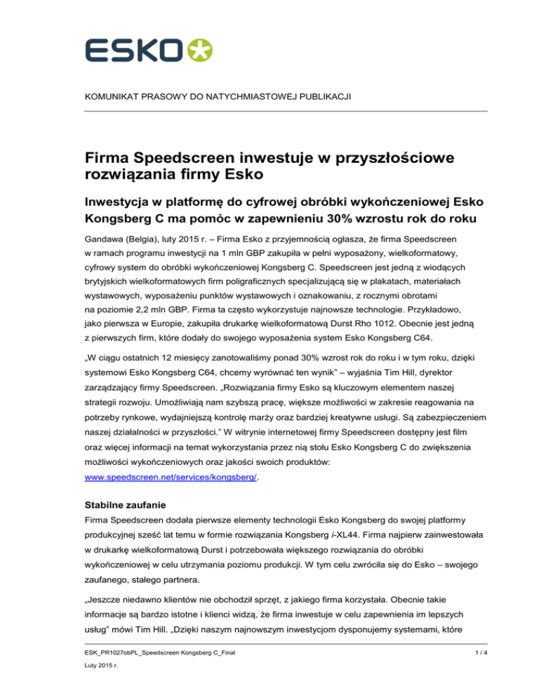 KOMUNIKAT PRASOWY DO NATYCHMIASTOWEJ PUBLIKACJI Firma Speedscreen inwestuje w przyszłościowe rozwiązania firmy Esko Inwestycja w platformę do cyfrowej obróbki wykończeniowej Esko Kongsberg C ma pomóc w zapewnieniu 30% wzrostu rok do roku Gandawa (Belgia), luty 2015 r. – Firma Esko z przyjemnością ogłasza, że firma Speedscreen w ramach programu inwestycji na 1 mln GBP zakupiła w pełni wyposażony, wielkoformatowy, cyfrowy system do obróbki wykończeniowej Kongsberg C. Speedscreen jest jedną z wiodących brytyjskich wielkoformatowych firm poligraficznych specjalizującą się w plakatach, materiałach wystawowych, wyposażeniu punktów wystawowych i oznakowaniu, z rocznymi obrotami na poziomie 2,2 mln GBP. Firma ta często wykorzystuje najnowsze technologie. Przykładowo, jako pierwsza w Europie, zakupiła drukarkę wielkoformatową Durst Rho 1012. Obecnie jest jedną z pierwszych firm, które dodały do swojego wyposażenia system Esko Kongsberg C64. „W ciągu ostatnich 12 miesięcy zanotowaliśmy ponad 30% wzrost rok do roku i w tym roku, dzięki systemowi Esko Kongsberg C64, chcemy wyrównać ten wynik” – wyjaśnia Tim Hill, dyrektor zarządzający firmy Speedscreen. „Rozwiązania firmy Esko są kluczowym elementem naszej strategii rozwoju. Umożliwiają nam szybszą pracę, większe możliwości w zakresie reagowania na potrzeby rynkowe, wydajniejszą kontrolę marży oraz bardziej kreatywne usługi. Są zabezpieczeniem naszej działalności w przyszłości.” W witrynie internetowej firmy Speedscreen dostępny jest film oraz więcej informacji na temat wykorzystania przez nią stołu Esko Kongsberg C do zwiększenia możliwości wykończeniowych oraz jakości swoich produktów: www.speedscreen.net/services/kongsberg/. Stabilne zaufanie Firma Speedscreen dodała pierwsze elementy technologii Esko Kongsberg do swojej platformy produkcyjnej sześć lat temu w formie rozwiązania Kongsberg i-XL44. Firma najpierw zainwestowała w drukarkę wielkoformatową Durst i potrzebowała większego rozwiązania do obróbki wykończeniowej w celu utrzymania poziomu produkcji. W tym celu zwróciła się do Esko – swojego zaufanego, stałego partnera. „Jeszcze niedawno klientów nie obchodził sprzęt, z jakiego firma korzystała. Obecnie takie informacje są bardzo istotne i klienci widzą, że firma inwestuje w celu zapewnienia im lepszych usług” mówi Tim Hill. „Dzięki naszym najnowszym inwestycjom dysponujemy systemami, które ESK_PR1027obPL_Speedscreen Kongsberg C_Final Luty 2015 r. 1/4 KOMUNIKAT PRASOWY DO NATYCHMIASTOWEJ PUBLIKACJI wykorzystują najnowsze technologie. Pod tym względem jesteśmy na pierwszym miejscu w Wielkiej Brytanii. Rozwiązania, jakimi dysponujemy, sprawiają, że przychodzą do nas nowi klienci. Poza zdobywaniem nowych klientów inwestycje te w znacznym stopniu utrwalają również nasze relacje z dotychczasowymi klientami.” Firma Speedscreen zainwestowała również w oprogramowanie do projektowania opakowań strukturalnych Esko ArtiosCAD oraz w rozwiązanie i-cut Suite do inspekcji wstępnej i zarządzania procesami roboczymi w druku wielkoformatowym. „Te pakiety oprogramowania pomagają nam ułatwić zarządzanie procesami roboczymi oraz zaoszczędzić czas na etapie projektowania. Poza tym możemy lepiej zaplanować impozycję i zagnieżdżanie projektów, co umożliwia najbardziej ekonomiczne wykorzystanie materiałów. Będziemy w stanie również lepiej rozwinąć aspekt projektowy naszej działalności, np. o tworzenie opakowań zewnętrznych” – wyjaśnia Tim Hill. Obsługa materiałów wielkoformatowych o rzeczywistych wymiarach 3,2 m System Kongsberg C64 obsługuje materiały o wymiarach 3210 mm x 3200 mm, dzięki czemu jest idealnym uzupełnieniem drukarek wielkoformatowych, co było ważnym kryterium firmy Speedscreen przy tej inwestycji. „Drukarka Durst zapewniła nam znaczne zwiększenie wydajności pracy i szybko okazało się, że obróbka wykończeniowa będzie naszym wąskim gardłem” – opowiada Tim Hill. „Rozważaliśmy szereg różnych rozwiązań. Esko Kongsberg C64 był jedynym stołem zapewniającym obszar roboczy obejmujący całe 3,2 m. Inne rozwiązania, które braliśmy pod uwagę, oferowały dwa osobne obszary robocze, lecz nie były w stanie obsługiwać materiałów o pełnych wymiarach 3,2 m x 3,2 m. System Kongsberg jest również przygotowany do pracy w trudnych warunkach oraz wyposażony w wydajną frezarkę 3 kW. Ogólnie rzecz biorąc, była to opcja o wiele korzystniejsza niż inne rozwiązania dostępne na rynku. Cieszyliśmy się również, że będziemy mogli zostać przy rozwiązaniach firmy Esko, które sprawdziły się w przeszłości.” „Projekty cyfrowe stają się coraz dłuższe i potrzebowaliśmy rozwiązania do cyfrowej obróbki wykończeniowej, które było je w stanie obsłużyć, pozwalając nam na ich kompletną realizację w firmie, bez konieczności angażowania podwykonawców. System Kongsberg C64 idealnie spełnia nasze potrzeby” – kontynuuje Tim Hill. „Różnicę zauważyliśmy od razu po instalacji systemu. Zadanie, które na stole Zünd zajmowało nam 32 minuty na arkusz, w systemie Kongsberg jest realizowane tylko w 12 minut. Taka wydajność pracy mówi sama za siebie. Możemy teraz szybciej wykonywać zadania i zwiększyć marżę dzięki prędkości pracy oraz kompletnej realizacji zleceń wewnątrz firmy. W rezultacie jesteśmy bardziej konkurencyjni.” ESK_PR1027obPL_Speedscreen Kongsberg C_Final Luty 2015 r. 2/4 KOMUNIKAT PRASOWY DO NATYCHMIASTOWEJ PUBLIKACJI System Esko Kongsberg C64 zapewnia również korzyści operacyjne przy przetwarzaniu rolek podłoża. Jak twierdzi Tim Hill: „Możemy rozwijać nośniki bezpośrednio ze stołu, dzięki czemu nie musimy ich oddzielać. W efekcie proces roboczy jest o wiele płynniejszy, co zwiększa naszą wydajność pracy. Możemy nawet obsługiwać dwie rolki obok siebie, przez co codziennie osiągamy m