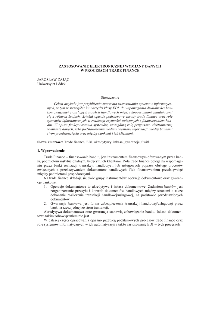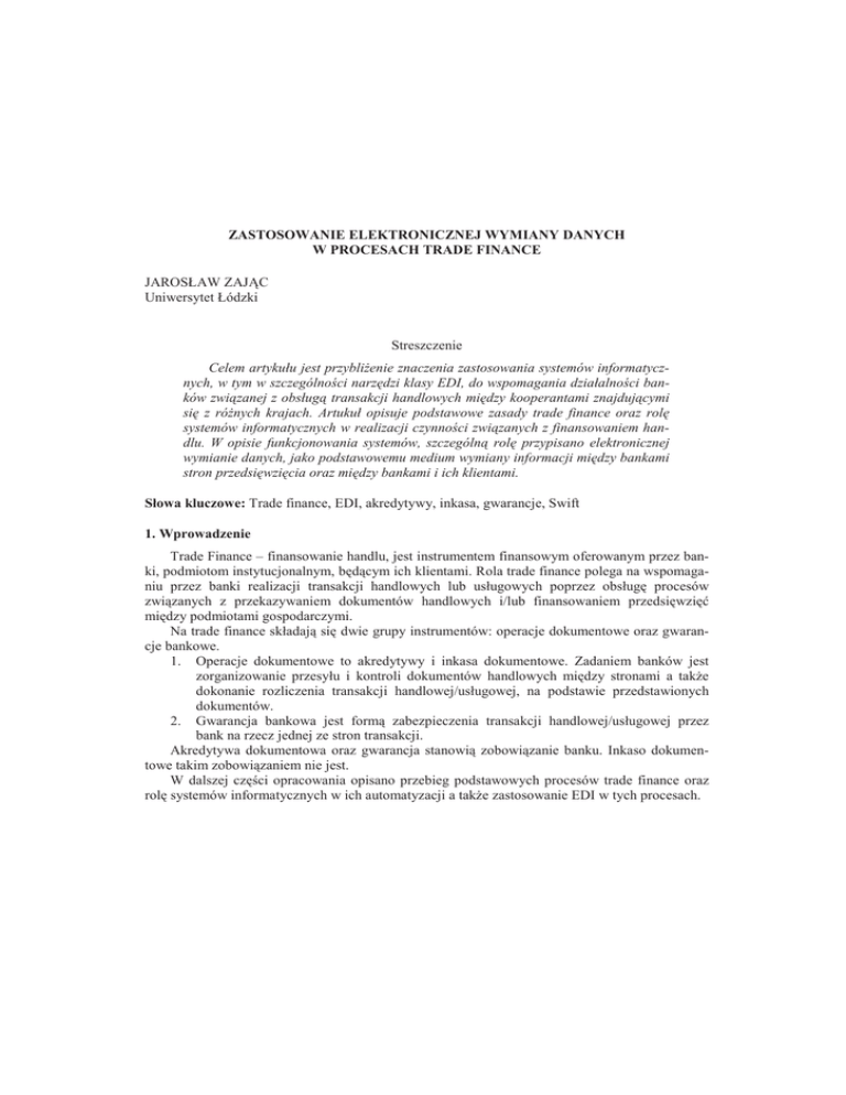ZASTOSOWANIE ELEKTRONICZNEJ WYMIANY DANYCH W PROCESACH TRADE FINANCE JAROSŁAW ZAJC Uniwersytet Łódzki Streszczenie Celem artykułu jest przybliĪenie znaczenia zastosowania systemów informatycznych, w tym w szczególnoĞci narzĊdzi klasy EDI, do wspomagania działalnoĞci banków związanej z obsługą transakcji handlowych miĊdzy kooperantami znajdującymi siĊ z róĪnych krajach. Artukuł opisuje podstawowe zasady trade finance oraz rolĊ systemów informatycznych w realizacji czynnoĞci związanych z finansowaniem handlu. W opisie funkcjonowania systemów, szczególną rolĊ przypisano elektronicznej wymianie danych, jako podstawowemu medium wymiany informacji miĊdzy bankami stron przedsiĊwziĊcia oraz miĊdzy bankami i ich klientami. Słowa kluczowe: Trade finance, EDI, akredytywy, inkasa, gwarancje, Swift 1. Wprowadzenie Trade Finance – finansowanie handlu, jest instrumentem finansowym oferowanym przez banki, podmiotom instytucjonalnym, bdcym ich klientami. Rola trade finance polega na wspomaganiu przez banki realizacji transakcji handlowych lub usługowych poprzez obsług procesów zwizanych z przekazywaniem dokumentów handlowych i/lub finansowaniem przedsiwzi midzy podmiotami gospodarczymi. Na trade finance składaj si dwie grupy instrumentów: operacje dokumentowe oraz gwarancje bankowe. 1. Operacje dokumentowe to akredytywy i inkasa dokumentowe. Zadaniem banków jest zorganizowanie przesyłu i kontroli dokumentów handlowych midzy stronami a take dokonanie rozliczenia transakcji handlowej/usługowej, na podstawie przedstawionych dokumentów. 2. Gwarancja bankowa jest form zabezpieczenia transakcji handlowej/usługowej przez bank na rzecz jednej ze stron transakcji. Akredytywa dokumentowa oraz gwarancja stanowi zobowizanie banku. Inkaso dokumentowe takim zobowizaniem nie jest. W dalszej czci opracowania opisano przebieg podstawowych procesów trade finance oraz rol systemów informatycznych w ich automatyzacji a take zastosowanie EDI w tych procesach. Jarosław Zając Zastosowanie elektronicznej wymiany danych w procesach trade finance 159 2. Procesy w Trade Finance 'RNXPHQW\ D=DSáDWD =OHFHQLHRWZDUFLDDNUHG\W\Z\ 3U]\MĊFLH]DEH]SLHF]HĔ =DZDUFLHXPRZ\ $ZL]RZDQLHDNUHG\W\Z\ 3U]HND]DQLHGRNXPHQWyZ E=DSáDWD Operacje dokumentowe Operacje dokumentowe składaj si z podobnych procesów, std zaklasyfikowane zostały do jednej grupy instrumentów finansowych. Jak wspomniano wczeniej, na instrumenty te składaj si inkasa dokumentowe i akredytywy dokumentowe. Schemat akredytywy/inkasa Rys. 1. Schemat działania akredytywy dokumentowe ródło: Opracowanie własne. Akredytywa dokumentowa ma na celu wspomoenie przez banki importera i eksportera operacji zwizanych z przekazaniem towaru oraz zapłat za towar. Usługa ta pozwala stronom kontraktu na przeprowadzenie procesu handlowego zgodnie z wymogami handlu midzynarodowego oraz stanowi zabezpieczenie, dla obu stron, prawidłowego wykonania transakcji i jej rozliczenia. Jak wida na powyszym rysunku, w realizacji akredytywy dokumentowej, udział bior cztery strony: • Zleceniodawca akredytywy – importer (kupujcy) • Beneficjent akredytywy – eksporter (sprzedajcy) • Bank importera – bank, obsługujcy akredytyw od strony importera • Bank eksportera (bank poredniczcy) – bank obsługujcy akredytyw od strony eksportera. Najogólniej ujmujc proces akredytywy dokumentowej przebiega w sposób nastpujcy: Na bazie kontraktu (1.), zawartego midzy kupujcym a sprzedajcym, kupujcy (importer) zwraca si do swojego banku (banku importera) z wnioskiem o otwarcie akredytywy dokumentowej (3.). Na podstawie wniosku, po przeprowadzeniu poprawnej weryfikacji, bank importera otwiera akredytyw dokumentow, rejestrujc odpowiednie limity. Informacja o otwartej akredy- 160 POLSKIE STOWARZYSZENIE ZARZĄDZANIA WIEDZĄ Seria: Studia i Materiały, nr 29, 2010 tywie przesyłana jest do banku eksportera (3.). Na podstawie informacji o otwarciu akredytywy, bank eksportera dokonuje zarejestrowania akredytywy i jej awizacji (przedstawienia) eksporterowi (4.). Zarejestrowana akredytywa jest podstaw do wysłania przez eksportera towarów, bdcych przedmiotem transakcji handlowej (5.). Towar z reguły nie trafia bezporednio do importera, gdy, aby go odebra, importer musi by w posiadaniu dokumentów przewozowo-spedycyjnych. Dokumenty te przekazane zostaje przez eksportera do swojego banku (6.), za nastpnie przez bank eksportera, wraz z tzw. listem przewodnim (wykazem dokumentów) do banku importera (7.). W banku importera dokumenty podlegaj kontroli pod wzgldem zgodnoci z warunkami akredytywy. W sytuacji, gdy dokumenty s niezgodne bank prezentuje je importerowi, który moe zgodzi si na realizacj akredytywy (dokonanie zapłaty za towar), na podstawie dokumentów niezgodnych. Jeeli dokumenty s zgodne lub importer wyraził zgod na realizacj akredytywy, dokonywana jest płatno za transakcj. Płatno dokonuje najpierw importer na rzecz banku importera (8a.) za nastpnie bank importera do banku eksportera na rzecz eksportera (8.). Bank eksportera po otrzymaniu zapłaty, przekazuj j eksporterowi (8b.). Po dokonaniu płatnoci, bank importera przesyła importerowi oryginały dokumentów (9.), które s podstaw do odbioru towaru przez importera. Procesy zwizane z obsługa inkas dokumentowych Poniszy rysunek prezentuje schemat działania inkasa. Inkaso jest generalnie instrumentem podobnym do akredytywy. Główne rónice polegaj na tym, i w inkasie stron inicjujc proces jest eksporter oraz to, e aden z banków (importera i eksportera) nie musi traktowa inkasa jako zobowizania. Fakt ten wpływa na brak funkcji gwarancyjnych tego instrumentu. Schemat działania inkasa Rys. 2. Schemat działania inkasa ródło: Opracowanie własne. Jarosław Zając Zastosowanie elektronicznej wymiany danych w procesach trade finance 161 Gwarancje Gwarancje s instrumentem finansowym, mogcym stanowi zabezpieczenie pod zakup towarów, wykonanie towaru lub usługi, spłaty zadłuenia i innych czynnoci. 
