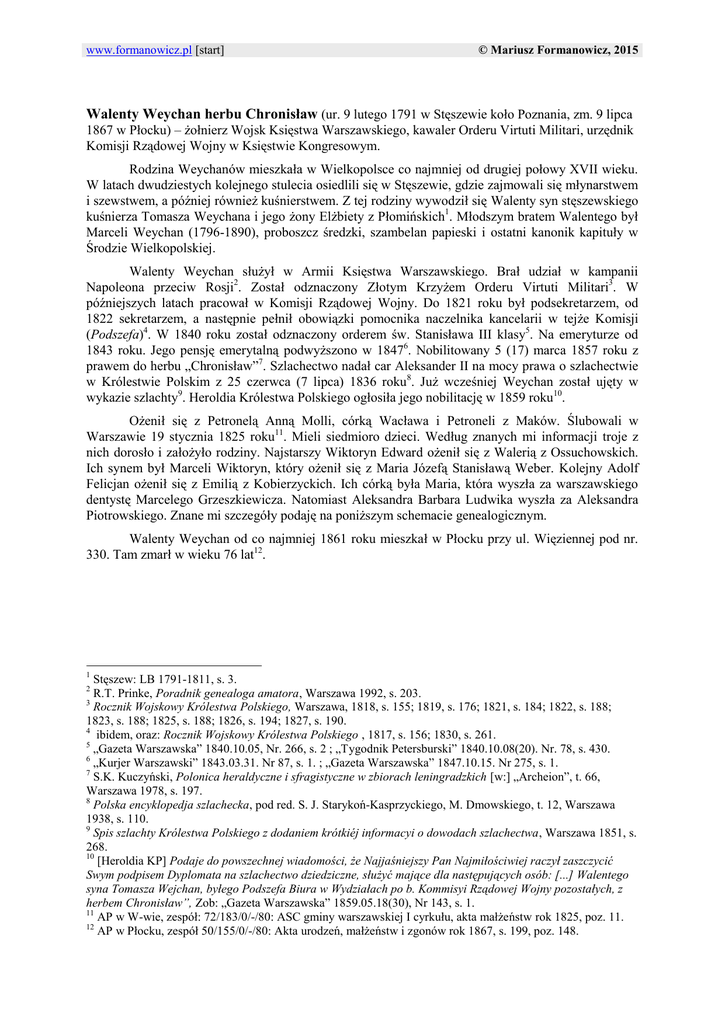 www.formanowicz.pl [start] © Mariusz Formanowicz, 2015 Walenty Weychan herbu Chronisław (ur. 9 lutego 1791 w Stęszewie koło Poznania, zm. 9 lipca 1867 w Płocku) – żołnierz Wojsk Księstwa Warszawskiego, kawaler Orderu Virtuti Militari, urzędnik Komisji Rządowej Wojny w Księstwie Kongresowym. Rodzina Weychanów mieszkała w Wielkopolsce co najmniej od drugiej połowy XVII wieku. W latach dwudziestych kolejnego stulecia osiedlili się w Stęszewie, gdzie zajmowali się młynarstwem i szewstwem, a później również kuśnierstwem. Z tej rodziny wywodził się Walenty syn stęszewskiego kuśnierza Tomasza Weychana i jego żony Elżbiety z Płomińskich1. Młodszym bratem Walentego był Marceli Weychan (1796-1890), proboszcz średzki, szambelan papieski i ostatni kanonik kapituły w Środzie Wielkopolskiej. Walenty Weychan służył w Armii Księstwa Warszawskiego. Brał udział w kampanii Napoleona przeciw Rosji2. Został odznaczony Złotym Krzyżem Orderu Virtuti Militari3. W późniejszych latach pracował w Komisji Rządowej Wojny. Do 1821 roku był podsekretarzem, od 1822 sekretarzem, a następnie pełnił obowiązki pomocnika naczelnika kancelarii w tejże Komisji (Podszefa)4. W 1840 roku został odznaczony orderem św. Stanisława III klasy5. Na emeryturze od 1843 roku. Jego pensję emerytalną podwyższono w 18476. Nobilitowany 5 (17) marca 1857 roku z prawem do herbu „Chronisław”7. Szlachectwo nadał car Aleksander II na mocy prawa o szlachectwie w Królestwie Polskim z 25 czerwca (7 lipca) 1836 roku8. Już wcześniej Weychan został ujęty w wykazie szlachty9. Heroldia Królestwa Polskiego ogłosiła jego nobilitację w 1859 roku10. Ożenił się z Petronelą Anną Molli, córką Wacława i Petroneli z Maków. Ślubowali w Warszawie 19 stycznia 1825 roku11. Mieli siedmioro dzieci. Według znanych mi informacji troje z nich dorosło i założyło rodziny. Najstarszy Wiktoryn Edward ożenił się z Walerią z Ossuchowskich. Ich synem był Marceli Wiktoryn, który ożenił się z Maria Józefą Stanisławą Weber. Kolejny Adolf Felicjan ożenił się z Emilią z Kobierzyckich. Ich córką była Maria, która wyszła za warszawskiego dentystę Marcelego Grzeszkiewicza. Natomiast Aleksandra Barbara Ludwika wyszła za Aleksandra Piotrowskiego. Znane mi szczegóły podaję na poniższym schemacie genealogicznym. Walenty Weychan od co najmniej 1861 roku mieszkał w Płocku przy ul. Więziennej pod nr. 330. Tam zmarł w wieku 76 lat12. 1 Stęszew: LB 1791-1811, s. 3. R.T. Prinke, Poradnik genealoga amatora, Warszawa 1992, s. 203. 3 Rocznik Wojskowy Królestwa Polskiego, Warszawa, 1818, s. 155; 1819, s. 176; 1821, s. 184; 1822, s. 188; 1823, s. 188; 1825, s. 188; 1826, s. 194; 1827, s. 190. 4 ibidem, oraz: Rocznik Wojskowy Królestwa Polskiego , 1817, s. 156; 1830, s. 261. 5 „Gazeta Warszawska” 1840.10.05, Nr. 266, s. 2 ; „Tygodnik Petersburski” 1840.10.08(20). Nr. 78, s. 430. 6 „Kurjer Warszawski” 1843.03.31. Nr 87, s. 1. ; „Gazeta Warszawska” 1847.10.15. Nr 275, s. 1. 7 S.K. Kuczyński, Polonica heraldyczne i sfragistyczne w zbiorach leningradzkich [w:] „Archeion”, t. 66, Warszawa 1978, s. 197. 8 Polska encyklopedja szlachecka, pod red. S. J. Starykoń-Kasprzyckiego, M. Dmowskiego, t. 12, Warszawa 1938, s. 110. 9 Spis szlachty Królestwa Polskiego z dodaniem krótkiéj informacyi o dowodach szlachectwa, Warszawa 1851, s. 268. 10 [Heroldia KP] Podaje do powszechnej wiadomości, że Najjaśniejszy Pan Najmiłościwiej raczył zaszczycić Swym podpisem Dyplomata na szlachectwo dziedziczne, służyć mające dla następujących osób: [...] Walentego syna Tomasza Wejchan, byłego Podszefa Biura w Wydziałach po b. Kommisyi Rządowej Wojny pozostałych, z herbem Chronisław”, Zob: „Gazeta Warszawska” 1859.05.18(30), Nr 143, s. 1. 11 AP w W-wie, zespół: 72/183/0/-/80: ASC gminy warszawskiej I cyrkułu, akta małżeństw rok 1825, poz. 11. 12 AP w Płocku, zespół 50/155/0/-/80: Akta urodzeń, małżeństw i zgonów rok 1867, s. 199, poz. 148. 2 www.formanowicz.pl [start] © Mariusz Formanowicz, 2015 Walenty Weychan h. Chronisław (*9-02-1791 Stęszew - +9-07-1867 Płock) + Petronela Anna Weychan /Molli/ (*06-1808 Warszawa - +) / Ślub: 19-01-1825 Warszawa/ - Wiktoryn Edward Weychan h. Chronisław (*5-09-1826 - +25-02-1865 Warszawa) + Waleria Weychan /Ossuchowska/ (*1837 - +) / Ślub: data nieznana/ - Marceli Wiktoryn Weychan h. Chronisław (*11-08-1861 Płock - +) + Maria Józefa Stanisława Weychan /Weber/ (* - +) / Ślub: 1886 Warszawa/ - Adolf Felicjan Weychan h. Chronisław (*3-07-1829 - +28-09-1877 Warszawa) + Emilia Weychan /Kobierzycka/ (*, +1909 Grudów) / Ślub: data nieznana/ - Otylia Weychan (* - +) - Eugenia Weychan (* - +) - Maria Emilia Grzeszkiewicz /Weychan/ (* - +) + Marceli Grzeszkiewicz (* - +) / Ślub: 1896 Warszawa/ - Ludwika Joanna Weychan (*29-08-1831 - +) - Ksawery Weychan (*04-1834 - +7-11-1834 Warszawa) - Walentyna Weychan (*1836 - +14-07-1836 Warszawa) - Aleksandra Barbara Ludwika Piotrowska /Weychan/ (*1837 Warszawa - +) + Aleksander Piotrowski (*1838 Płock - +) / Ślub: 13-02-1861 Płock/ - Konstancja Kornelia Weychan (*19-12-1838 Warszawa - +22-12-1838 Warszawa)