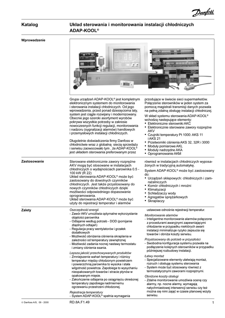 Katalog Uk³ad sterowania i monitorowania instalacji ch³odniczych ADAP-KOOL® Wprowadzenie Grupa urz¹dzeñ ADAP-KOOL® jest kompletnym elektronicznym systemem do monitorowania i sterowania instalacji ch³odniczych. Od jego wprowadzenia, przed ponad dziesiêcioma laty, system jest ci¹gle rozwijany i modernizowany. Obecnie jego szeroki asortyment wyrobów pokrywa wszystkie potrzeby w zakresie nowoczesnych funkcji regulacji, monitorowania i nadzoru (sygnalizacji alarmów) handlowych i przemys³owych instalacji ch³odniczych. D³ugoletnie dowiadczenia firmy Danfoss w ch³odnictwie wraz z globaln¹ sieci¹ sprzeda¿y i serwisu zaowocowa³o tym , ¿e ADAP-KOOL® jest uk³adem sterowania preferowanym przez Zastosowanie Zalety Sterowane elektronicznie zawory rozprê¿ne AKV mog¹ byæ stosowane w instalacjach ch³odniczych o wydajnociach parownika 0.5 100 kW (R 22) Uk³ad sterowania ADAP-KOOL® mo¿e byæ zastosowany do dowolnych czynników ch³odniczych. Jest tak¿e przystosowany do nowych czynników ch³odniczych dziêki mo¿liwoci odpowiedniego dopasowanie oprogramowania. Uk³ad sterowania ADAP-KOOL® mo¿e byæ u¿yty do rejestracji temperatur i alarmów Oszczêdnoæ energii - Zawór AKV umo¿liwia optymalne wykorzystanie objêtoci parownika - Odtajanie wed³ug potrzeb - DOD (pomijanie zbêdnych odtajañ) - Regulacja pracy wentylatorów i grza³ek dodatkowych - Mo¿liwoæ obni¿enia cinienia skraplania w zale¿noci od temperatury zewnêtrznej - Mo¿liwoæ zadania nocnej nastawy termostatu i zmiany cinienia ssania. Lepsza jakoæ przechowywanych produktów - Zmniejszenie wahañ temperatury i ró¿nicy temperatur miêdzy ch³odzonym powietrzem i powierzchni¹ parownika to wysoka i sta³a wilgotnoæ powietrza. Zapobiega to wysychaniu nieopakowanych towarów i stracie p³ynów w opakowanym miêsie. - Zakoñczenie odtajania po osi¹gniêciu okreonej temperatury zapobiega nadmiernemu ogrzewaniu przestrzeni ch³odzonej. Rejestracja temperatury - System ADAP-KOOL® spe³nia wymagania ã Danfoss A/S, 09 - 2000 RD.8A.F1.49 przoduj¹ce w wiecie sieci supermarketów. Po³¹czenie sterowników w jeden system za pomoc¹ magistrali transmisji danych pozwala na pe³n¹ zdaln¹ obs³ugê instalacji ch³odniczej. W sk³ad systemu sterowania ADAP-KOOL® wchodz¹ nastepuj¹ce elementy: Elektroniczne sterowniki AKC Elektronicznie sterowane zawory rozprê¿ne AKV Czujniki temperatury Pt 1000: AKS 11 i AKS 21 Przetworniki cinienia AKS 32, 32R i 3000 Modu³y pomiarowe AKL Modu³y nadrzêdne AKA Oprogramowanie AKM równie¿ w instalacjach ch³odniczych wyposa¿onych w tradycyjn¹ automatykê. System ADAP-KOOL® mo¿e byæ zastosowany do: Urz¹dzeñ sklepowych: ch³odniczych i zamra¿alniczych Komór ch³odniczych i mroni Klimatyzacji Sch³adzaczy wody Agregatów sprê¿arkowych Skraplaczy ustawowe odnonie rejestracji temperatur. Monitorowanie alarmów - Inteligentne monitorowanie alarmów po³¹czone z procedurami awaryjnymi zapewniaj¹cymi ch³odzenie w przypadku niektórych awarii instalacji minimalizuje ryzyko zepsucia siê towarów i obni¿a koszty serwisu. Przystosowany do potrzeb w przysz³oci - Swobodna konfiguracja systemu pozwala na pod³¹czenie kolejnych sterowników w przypadku póniejszej rozbudowy instalacji. £atwy monta¿ - Specjalizowane elementy u³atwiaj¹ monta¿, rozruch i obs³ugê systemu sterowania - System mo¿e byæ stosowany równie¿ z termostatycznymi zaworami rozprê¿nymi. Obni¿one koszty obs³ugi - Zdalne monitorowanie umo¿liwia ocenê czy alarmy, np. nocne alarmy, wymagaj¹ natychmiastowej interwencji serwisu czy te¿ mo¿na siê nimi zaj¹æ w czasie planowej wizyty serwisu. 1 Katalog Uk³ad sterowania i monitorowania instalacji ch³odniczych ADAP-KOOL® Sterowniki urz¹dzeñ ch³odniczych Sterowniki urz¹dzeñ ch³odniczych reguluj¹ wszystkie wa¿ne funkcje w meblach ch³odniczych, komorach i mroniach. Szeroki asortyment specjalizowanych sterowników zapewnia mo¿liwoæ doboru urz¹dzenia dok³adnie odpowiadaj¹cego potrzebom. Zale¿nie od typu sterownik mo¿e obs³u¿yæ jeden, dwa lub trzy parowniki. Regulacja urz¹dzeñ i komór ch³odniczych przy pomocy AKV lub termostatycznych zaworów rozprê¿nych. Monitorowanie pracy urz¹dzeñ i komór ch³odniczych. Instalacje z odtajaniem gor¹cym gazem Sch³adzacze cieczy. Jednostkowe komory ch³odnicze i mronie. Funkcje AKC 114 - 116 Sterowniki AKC tej serii steruj¹ prac¹ od jednego do trzech parowników w urz¹dzeniach i komorach ch³odniczych z odtajaniem gor¹cym gazem. Funkcje Termostaty z funkcj¹ alarmu Regulacja temperatury dwupo³o¿eniowa lub modulowana Nastawa nocna wg zegara wewnêtrznego Przy³¹cze wywietlacza LCD do odczytu temperatury Funkcja odtajania, wewnêtrzny program odtajania Koniec odtajania wg temperatury lub czasu Realizacja cyklu odtajania gor¹cym gazem Sterowanie prac¹ wentylatorów i dodatkowych grza³ek Sygna³ steruj¹cy sprê¿ark¹ Mo¿liwoæ pracy z termostatycznym zaworem rozprê¿nym lub z AKV Kalibracja czujników Funkcje serwisowe Ograniczenie zu¿ycia energii: Adaptacyjna regulacjê przegrzania (przy zastosowaniu AKV). Pulsacyjna praca wentylatorów i grza³ek dodatkowych Zakoñczenie odtajania sterowane temperatur¹ Modulowana regulacja temperatury Nastawa nocna Przyk³ad zastosowania W celu uzyskania dalszych informacji prosimy o kontakt z Danfoss. 2 RD.8A.F1.49 ã Danfoss A/S, 09 - 2000 Katalog Uk³ad sterowania i monitorowania instalacji ch³odniczych ADAP-KOOL® AKC 114D - 116D Sterowniki AKC tej serii steruj¹ prac¹ od jednego do trzech parowników w urz¹dzeniach i komorach ch³odniczych. AKC 100D wykorzystuje dwa czujniki temperatury do sterowania zaworem AKV. Funkcje Termostaty z funkcj¹ alarmu Regulacja temperatury dwupo³o¿eniowa lub modulowana Nastawa nocna wg zegara wewnêtrznego Przy³¹cze wywietlacza LCD do odczytu temperatury Funkcja odtajania, wewnêtrzny program odtajania Koniec odtajania wg temperatury lub czasu Wy³¹cznik drzwiowy Sterowanie prac¹ wentylatorów i 