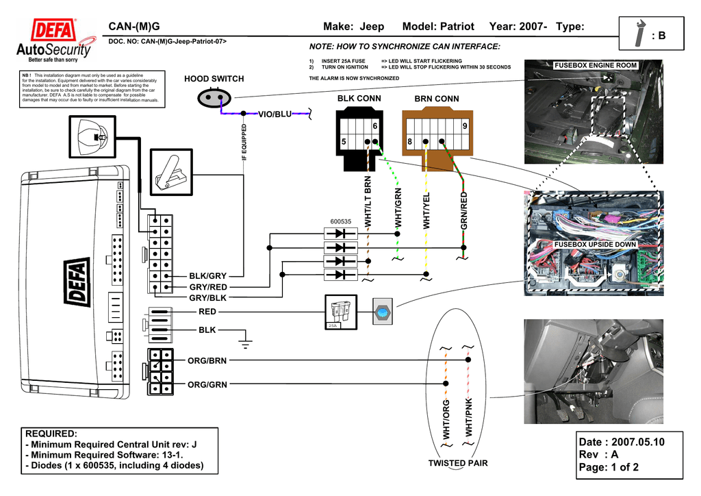 M a k e : J e e p C A N -(M )G D O C . N O : C A N -(M )G -J e e p -P a tr io t-0 7 > N O T E : H O W 1 ) 2 ) N B ! T h is in s f o r t h e in s t a lla fro m m o d e l to in s t a lla t io n , b e m a n u fa c tu re r. d a m a g e s th a t ta t io m s D m lla t io n d ia g r a m m u s t o n . E q u ip m e n t d e liv e r e o d e l a n d fr o m m a rk e t u r e t o c h e c k c a r e f u lly E F A A . S is n o t lia b le a y o c c u r d u e to fa u lt y n ly b e u s e d d w it h th e c to m a rk e t. B th e o r ig in a l to c o m p e n s o r in s u f fic ie a s a g u id e lin e a r v a r ie s c o n s id e r a b ly e fo r e s ta r tin g th e d ia g r a m fr o m th e c a r a te f o r p o s s ib le n t in s t a lla t io n m a n u a ls . H O O D S W IT C H T O IS N O W B L K Y e a r: 2 0 0 7 - T y p e : S Y N C H R O N IZ E C A N IN T E R F A C E : IN S E R T 2 5 A F U S E T U R N O N IG N IT IO N T H E A L A R M M o d e l: P a tr io t = > L E D = > L E D W IL L S T A R T F L IC K E R IN G W IL L S T O P F L IC K E R IN G W IT H IN 3 0 S E C O N D S : B F U S E B O X E N G IN E R O O M S Y N C H R O N IZ E D C O N N B R N C O N N V IO /B L U 9 5 G R N /R E D W H T /G R N W H T /L T B R N 6 0 0 5 3 5 8 W H T /Y E L IF E Q U IP P E D 6 F U S E B O X U P S ID E D O W N B L K /G R Y G R Y /R E D G R Y /B L K R E D B L K 25A O R G /B R N Q U IR in im u in im u io d e s E D m m (1 : R e q u ir e d C e n tr a l U n it r e v : J R e q u ir e d S o ftw a r e : 1 3 -1 . x 6 0 0 5 3 5 , in c lu d in g 4 d io d e s ) T W IS T E D W H T /P N K R E - M - M - D W H T /O R G O R G /G R N P A IR D a te : 2 0 0 7 .0 5 .1 0 R e v : A P a g e : 1 o f 2 C A N -(M )G M a k e : J e e p M o d e l: P a tr io t D O C . N O : C A N -(M )G -J e e p -P a tr io t-0 7 > Y e a r: 2 0 0 7 - T y p e : : B UP L e v e l n r. 3 . D a te : 2 0 0 7 .0 5 .1 0 R e v : A P a g e : 2 o f 2
