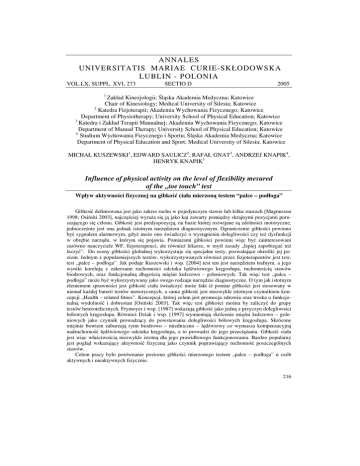 ANNALES UNIVERSITATIS MARIAE CURIE-SKŁODOWSKA LUBLIN - POLONIA VOL.LX, SUPPL. XVI, 273 SECTIO D 2005 1 Zakład Kinezjologii; Śląska Akademia Medyczna; Katowice Chair of Kinesiology; Medical University of Silesia; Katowice 2 Katedra Fizjoterapii; Akademia Wychowania Fizycznego; Katowice Department of Physiotherapy; University School of Physical Education; Katowice 3 Katedra i Zakład Terapii Manualnej; Akademia Wychowania Fizycznego; Katowice Department of Manual Therapy; University School of Physical Education; Katowice 4 Studium Wychowania Fizycznego i Sportu; Śląska Akademia Medyczna; Katowice Department of Physical Education and Sport; Medical University of Silesia; Katowice MICHAŁ KUSZEWSKI1, EDWARD SAULICZ2, RAFAŁ GNAT3, ANDRZEJ KNAPIK4, HENRYK KNAPIK3 Influence of physical activity on the level of flexibility mesured of the „toe touch” test Wpływ aktywności fizycznej na gibkość ciała mierzoną testem “palce – podłoga” Gibkość definiowana jest jako zakres ruchu w pojedynczym stawie lub kilku stawach [Magnusson 1998; Osiński 2003], najczęściej wyraża się ją jako kąt zawarty pomiędzy skrajnymi pozycjami poruszającego się członu. Gibkość jest predyspozycją, na bazie której rozwijane są zdolności motoryczne, jednocześnie jest ona jednak istotnym narzędziem diagnostycznym. Ograniczenie gibkości powinno być sygnałem alarmowym, gdyż może ono świadczyć o wystąpieniu dolegliwości czy też dysfunkcji w obrębie narządu, w którym się pojawia. Pomiarami gibkości powinni więc być zainteresowani zarówno nauczyciele WF, fizjoterapeuci, ale również lekarze, w myśl zasady „lepiej zapobiegać niż leczyć”. Do oceny gibkości globalnej wykorzystuje się specjalne testy, pozwalające określić jej poziom. Jednym z popularniejszych testów, wykorzystywanych również przez fizjoterapeutów jest tzw. test „palce – podłoga”. Jak podaje Kuszewski i wsp. [2004] test ten jest narzędziem trafnym, a jego wyniki korelują z zakresami ruchomości odcinka lędźwiowego kręgosłupa, ruchomością stawów biodrowych, oraz funkcjonalną długością mięśni kulszowo - goleniowych. Tak więc test „palce – podłoga” może być wykorzystywany jako swego rodzaju narzędzie diagnostyczne. O tym jak istotnym elementem sprawności jest gibkość ciała świadczyć może fakt iż pomiar gibkości jest stosowany w niemal każdej baterii testów motorycznych, a sama gibkość jest niezwykle istotnym czynnikiem koncepcji „Health – related fitnes”. Koncepcji, której celem jest promocja zdrowia oraz troska o funkcjonalną wydolność i dobrostan [Osiński 2003]. Tak więc test gibkości można by zaliczyć do grupy testów heterotelicznych. Frymoyer i wsp. [1987] wskazują gibkość jako jedną z przyczyn dolegliwości bólowych kręgosłupa. Również Dziak i wsp. [1997] wymieniają skrócenie mięśni kulszowo – goleniowych jako czynnik prowadzący do powstawania dolegliwości bólowych kręgosłupa. Skrócone mięśnie bowiem zaburzają rytm biodrowo – miedniczno – lędźwiowy co wymusza kompensacyjną nadruchomość lędźwiowego odcinka kręgosłupa, a to prowadzi do jego przeciążania. Gibkość ciała jest więc właściwością niezwykle istotną dla jego prawidłowego funkcjonowania. Bardzo popularny jest pogląd wskazujący aktywność fizyczną jako czynnik poprawiający ruchomość poszczególnych stawów. Celem pracy było porównanie poziomu gibkości mierzonego testem „palce – podłoga” u osób aktywnych i nieaktywnych fizycznie. 216 MATERIAŁ BADAWCZY Badania przeprowadzono na 155 zdrowych ochotnikach (116 kobiet; 39 mężczyzn) w wieku od 18 do 51 lat (x=26,1; SD=7,5). Wśród tej grupy znalazło się 66 osób (51 kobiet; 15 mężczyzn), które w ankiecie samooceny określiły siebie jako nieaktywne fizycznie, 89 osób (50 kobiet, 39 mężczyzn) przyznało się do regularnego uczestnictwa w różnego rodzaju formach rekreacji ruchowej w wymiarze co najmniej 4 godzin tygodniowo. Wiek w grupie osób nieaktywnych (N) zawierał się w przedziale od 18 do 51 (x=25,5; SD=7,0) osoby aktywne (A) miały od 19 do 46 lat (x=26,6; SD=7,8). 43% 57% aktywni nieaktywni Ryc.1. Procentowy rozkład liczebności w poszczególnych grupach Wszystkim osobom polecano wykonać trzy próby skłonu w przód z wyprostowanymi stawami kolanowymi. Badani w czasie wykonywania testu „palce – podłoga” stali na 30 cm podwyższeniu. W czasie wykonywania próby badani trzymali dłonie razem jedna na drugiej (ryc.2). Wynikiem testu była zmierzona odległość od koniuszka trzeciego palca ręki do płaszczyzny, na której stał badany. Płaszczyznę tą traktowano jako wartość „0”, jeśli badany nie był w stanie dosięgnąć do niej wynik zapisywano ze znakiem „-”, jeśli sięgał poniżej wynik miał znak „+”. Pomiaru wykonywano przymiarem liniowym z podziałką centymetrową, z dokładnością do 0,5 cm. Do analizy statystycznej wybierano najlepszy uzyskany przez badanego wynik. Wszystkie zebrane w ten sposób dane zostały poddane analizie statystycznej przy użyciu programu Statistica 5.0. Do oszacowania różnic pomiędzy grupą osób aktywnych i nieaktywnych wykorzystano nieparametryczny test U Manna – Whitneya. Za poziom istotności różnic przyjęto p<0,05. Ryc.2. Test „palce – podłoga” (za J. Ślężyński) 217 ANALIZA WYNIKÓW Zaobserwowano wyraźne różnice uzyskiwanych wyników w obu grupach. Osoby aktywne fizycznie uzyskały lepsze wyniki w teście gibkości. Tą grupę osób cechowały zarówno lepsze wyniki średnie, jak i szerszy zakres uzyskiwanych indywidualnie rezultatów (42,5 cm) z wyraźnym przesunięcie w kierunku wartości „+” (średnio o 9 cm). Osoby nieaktywne częściej uzyskiwały wyniki „-”. Wyniki jakie badani uzyskali w teście „palce – podłoga” przedstawiono w tabeli 1 oraz na ryc.3. Tab.1 wyniki testu „palce – podłoga” w poszczególnych grupach grupa X 10,56 