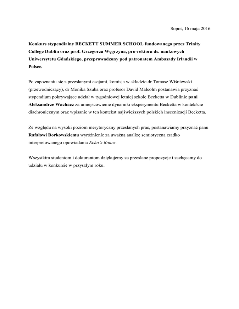 Sopot, 16 maja 2016 Konkurs stypendialny BECKETT SUMMER SCHOOL fundowanego przez Trinity College Dublin oraz prof. Grzegorza Węgrzyna, pro-rektora ds. naukowych Uniwersytetu Gdańskiego, przeprowadzony pod patronatem Ambasady Irlandii w Polsce. Po zapoznaniu się z przesłanymi esejami, komisja w składzie dr Tomasz Wiśniewski (przewodniczący), dr Monika Szuba oraz profesor David Malcolm postanawia przyznać stypendium pokrywające udział w tygodniowej letniej szkole Becketta w Dublinie pani Aleksandrze Wachacz za umiejscowienie dynamiki eksperymentu Becketta w kontekście diachronicznym oraz wpisanie w ten kontekst najświeższych polskich inscenizacji Becketta. Ze względu na wysoki poziom merytoryczny przesłanych prac, postanawiamy przyznać panu Rafałowi Borkowskiemu wyróżnienie za uważną analizę semiotyczną rzadko interpretowanego opowiadania Echo’s Bones. Wszystkim studentom i doktorantom dziękujemy za przesłane propozycje i zachęcamy do udziału w konkursie w przyszłym roku.