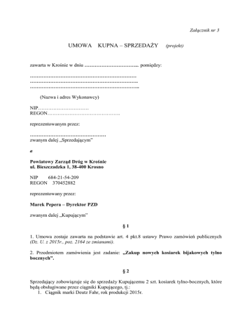 Załącznik nr 3 UMOWA KUPNA – SPRZEDAŻY (projekt) zawarta w Krośnie w dniu …………………………... pomiędzy: ……………………………………………………… ………………………………………………………. ……………………………………………………….. (Nazwa i adres Wykonawcy) NIP………………………… REGON……………………………………. reprezentowanym przez: ……………………………………… zwanym dalej „Sprzedającym” a Powiatowy Zarząd Dróg w Krośnie ul. Bieszczadzka 1, 38-400 Krosno NIP 684-21-54-209 REGON 370452882 reprezentowany przez: Marek Pepera – Dyrektor PZD zwanym dalej „Kupującym” §1 1. Umowa zostaje zawarta na podstawie art. 4 pkt.8 ustawy Prawo zamówień publicznych (Dz. U. z 2015r., poz. 2164 ze zmianami). 2. Przedmiotem zamówienia jest zadanie: „Zakup nowych kosiarek bijakowych tylno bocznych”. §2 Sprzedający zobowiązuje się do sprzedaży Kupującemu 2 szt. kosiarek tylno-bocznych, które będą obsługiwane przez ciągniki Kupującego, tj.: 1. Ciągnik marki Deutz Fahr, rok produkcji 2015r. 2. Ciągnik Ursus C-360 rok produkcji 1971r. §3 1. Cena przedmiotu umowy, o którym mowa w §1 wynosi: a) Kosiarka do ciągnika marki Deutz Fahr, rok produkcji 2015r. …………………zł(brutto), słownie: ……………………………….. b) Kosiarka do ciągnika Ursus C-360 rok produkcji 1971r. …………………zł(brutto), słownie: ……………………………….. 2. Należność, o której mowa w ust. l Kupujący wpłaci na konto Sprzedającego w terminie 30 dni od daty otrzymania faktury. Za dzień zapłaty uznaje się dzień obciążenia konta Kupującego. §3 1.Sprzedawca wyda przedmiot zamówienia w ciągu 7 dni od dnia podpisania umowy. 2.Wraz z przedmiotem umowy Sprzedawca wyda Kupującemu wszelkie posiadane przez siebie dokumenty dotyczące przedmiotu umowy. §4 1. Sprzedawca odpowiada wobec Kupującego z tytułu rękojmi, jeżeli wada fizyczna zostanie stwierdzona przed upływem dwóch lat od dnia wydania rzeczy. 2. W przypadku, gdy Kupujący będzie korzystał z uprawnień gwarancyjnych bieg terminu do wykonania uprawnień z tytułu rękojmi ulegnie zawieszeniu z dniem zawiadomienia Sprzedającego o wadzie. Termin będzie biegł na nowo jeżeli Sprzedawca odmówi obowiązków wynikających z gwarancji albo upłynie bezskuteczny termin na ich wykonanie. 3.Sprzedawca w cenie sprzętu dokona montażu kosiarek, przeszkoli operatorów sprzętu. 4. Sprzedający odpowiada za dobranie kosiarek bijakowych do ciągników, które posiada Kupujący. 5. Sprzedający w ramach odpowiedzialności za dobór kosiarek bijakowych do ciągników, umożliwi Kupującemu, przed wystawieniem faktury za przedmiot niniejszej umowy, sprawdzenie przez okres 3 dni roboczych kosiarek bijakowych w terenie, podczas pracy, a w przypadku stwierdzenia przez operatorów braku kompatybilności zaoferowanych kosiarek z ciągnikami, Sprzedawca w terminie 14 dni roboczych zaproponuje i zamontuje inny sprzęt, współpracujący z ciągnikami Kupującego. 6. Sprzedawca zastrzega sobie również prawo odstąpienia od umowy, jeżeli nie zostaną spełnione warunki, o których mowa w ust. 5 §5 1. Sprzedawca udziela Kupującemu gwarancji, co do jakości sprzedanej rzeczy, tj. a) Kosiarka do ciągnika marki Deutz Fahr, rok produkcji 2015r. ……… miesięcy gwarancji b) Kosiarka do ciągnika Ursus C-360 rok produkcji 1971r. …………… miesięcy gwarancji W razie stwierdzenia w trakcie gwarancji wady fizycznej rzeczy, Sprzedawca zobowiązany jest do usunięcia wady fizycznej lub do dostarczenia rzeczy wolnej od wad w terminie 7 dni od dnia zgłoszenia przez Kupującego wady. Termin może być przesunięty o kolejne 7 dni jeżeli stwierdzenie wady oraz naprawa wymagają dodatkowych czynności niezbędnych do wykonania gwarancji. 2. Gwarancja obowiązuje na terenie Polski. 3. Gwarancja nie wyłącza, nie ogranicza ani nie zawiesza uprawnień Kupującego z tytułu przepisów o rękojmi za wady rzeczy sprzedanej. §6 1. Sprzedawca zobowiązuje się do świadczenia napraw serwisowych przedmiotu umowy, na niniejszych warunkach przez okres trwania rękojmi i gwarancji. Sprzedawca oświadcza, że ceny usług serwisowych świadczonych na rzecz Kupującego odpowiadają cenom rynkowym usług tego rodzaju. 2. Sprzedawca będzie powiadamiany o konieczności naprawy serwisowej e-mailem lub telefonicznie. Za godzinę zgłoszenia naprawy będzie uznawana godzina, w której dokonano zgłoszenia w jednej z ww. form. 3. Sprzedawca zobowiązany jest wykonać usługę serwisową w terminie do 48 godzin od zgłoszenia. 4. W przypadku niezrealizowania usługi w terminie określonym w ust. 3 Kupujący będzie naliczał kary umowne w wysokości 100,00 zł za każdą rozpoczętą godzinę opóźnienia. Kary umowne mogą zostać potrącone z wynagrodzenia należnego Sprzedającemu za usługę serwisową. 5. Jeżeli czas oczekiwania na usługę serwisową przekroczy 48 godzin, Kupujący może zlecić naprawę osobie trzeciej na koszt i ryzyko Sprzedawcy. §7 1. W sprawach nieuregulowanych niniejszą umową mają zastosowanie przepisy Kodeksu cywilnego. 2. Wszelkie ewentualne spory, jakie mogą wyniknąć na tle realizacji niniejszej umowy rozstrzygane będą przez Sąd właściwy dla Kupującego. 3. Wszelkie zmiany w umowie, jak również jej rozwiązanie, wymagają formy pisemnej pod rygorem nieważności. §8 Umowę sporządzono w 2 jednobrzmiących egzemplarzach po jednym dla każdej ze stron. KUPUJĄCY SPRZEDAJĄCY