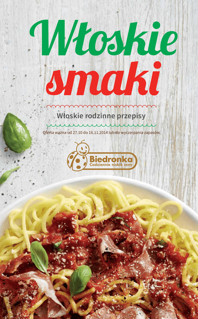 Włoskie rodzinne przepisy Oferta ważna od 27.10 do 16.11.2014 lub do wyczerpania zapasów. W słonecznej Italii wyrabia się ponad 600 gatunków serów. Są one składnikami wielu potraw. Północne Włochy słyną z serów wytwarzanych na bazie mleka krowiego, zaś centrum i południe – z mleka owczego. Parmigiano Reggiano ChNP popularnie zwany parmezanem to ser półtłusty, bardzo twardy, o delikatnym smaku. Od stuleci wyrabiany jest według tradycyjnej receptury. Dojrzewa minimum 12 miesięcy. Grana Padano ChNP to ser z surowego mleka krowiego. Jest aromatyczny i delikatny. Ma słodki i jednocześnie pikantny smak oraz ziarnistą strukturę. Dojrzewa od 9 do 24 miesięcy. Nadaje się do deski z serami oraz jako dodatek do typowych włoskich dań. Mozzarella di Bufala jest wytwarzana z mleka bawolic. Najlepiej smakuje podawana z plastrami świeżych pomidorów i listkami bazylii, z dodatkiem oliwy z oliwek z pierwszego tłoczenia. Stanowi też składnik m.in. lasagne i pizzy. SERY łoska kuchnia według wielu kucharzy i smakoszy na całym świecie, uważana jest za jedną z najsmaczniejszych. Potrawy, do których przyrządzenia zapraszamy zarówno początkujących, jak i tych bardziej wprawionych kucharzy, są możliwe do zrobienia przy pomocy produktów oferowanych w Biedronce. Produkty te zostały specjalnie dla Państwa wybrane. MAKARONY Makaron, czyli po włosku pasta. To jeden z najbardziej znanych symboli słonecznej Italii. Dobry makaron nigdy nie może być rozgotowany. Należy go serwować na półtwardo, czyli „al dente”. Podobno rodzajów makaronów jest więcej niż dni w roku. Z całą pewnością każdego dnia można je odkrywać na nowo. Ich różnorodność może zaskakiwać i cieszyć kolorami, kształtami oraz nadzieniami. Spaghetti jest jednym z najbardziej znanych rodzajów tradycyjnego włoskiego makaronu. Z kolei lasagne to rodzaj dużych, prostokątnych płatów makaronowych, które są składnikiem zapiekanek. Zaś tortellini to okrągłe, małe pierożki z ciasta makaronowego. więcej na www.biedronka.pl Storzapretti (kluski z ricotty) w sosie pomidorowym z serem Ricotta to ser przypominający niesolony twaróg. Produkowany jest z serwatki pozostającej po serach podpuszczkowych. Można ją jeść z pieczywem lub dodawać jako jeden ze składników potraw i ciast. WŁOSKIE SMAKI 4 KLUSKI: 300 g mrożonego szpinaku Mroźna Kraina 400 g ricotty Sottile Gusto 100 g startego parmezanu Galbani 2 jaja Ale Jaja 20 g bułki tartej Piekarnia Domowa 100 g mąki pszennej Złote Pola sól, pieprz SOS: 1 mała cebula (pokrojona w kostkę) 2 łyżki oliwy z oliwek Casa de Azeite 3 ząbki czosnku (utarte) 1 pęczek natki pietruszki (posiekany) 700 ml passaty pomidorowej z czosnkiem Sottile Gusto sól, pieprz Piekarnik rozgrzej do 200°C. Wstaw wodę na kluski. Szpinak rozmroź, odciśnij i posiekaj. W misce wymieszaj ricottę, szpinak, jaja oraz bułkę tartą. Dopraw solą i pieprzem. W rondlu rozgrzej oliwę i podsmaż na niej cebulę z czosnkiem. Po minucie dodaj natkę i wlej passatę. Dopraw solą i pieprzem. Gotuj około 15 minut na małym ogniu. Z masy serowo-szpinakowej uformuj wałeczki lub romby wielkości ok. 3 x 5 cm. Obtocz je w mące i za pomocą łyżki cedzakowej wkładaj pojedynczo do wrzątku. Do naczynia żaroodpornego wlej sos pomidorowy. Kiedy kluski wypłyną na wierzch, delikatnie przełóż je do sosu. Posyp całość parmezanem i zapiekaj przez 5-7 minut. 14,49 zł/szt (72,45 zł/kg) 3,69 zł/szt (5,27 zł/kg) PRZECIER POMIDOROWY PASSATA SOTTILE GUSTO Z CZOSNKIEM, 700 G Przecier ze słonecznych włoskich pomidorów o gęstej, półpłynnej konsystencji. Do wyboru: klasyczny, z czosnkiem lub z ziołami. SER PARMIGIANO REGGIANO ChNP GALBANI, 200 G Oryginalny włoski parmezan o mlecznym smaku, kwiatowo-owocowym zapachu i zółto-pomarańczowej barwie; produkowany z surowego mleka krowiego i dojrzewający 15 miesięcy. Wyśmienity jako przekąska lub dodatek do słonych dań (m.in. pizzy, spaghetti i zupy cebulowej). 3,79 zł/szt (15,16 zł/kg) RICOTTA SOTTILE GUSTO, 250 G Miękki, niedojrzewający włoski ser, produkowany z serwatki i przypominający twaróg. Świetny do ciast (serników), farszów (np. naleśników), deserów i sałatek. więcej na www.biedronka.pl Zapiekanka makaronowa z tuńczykiem i brokułami Jednym ze składników zapiekanki jest ser bel paese, którego włoska nazwa oznacza piękny kraj. Jest to półmiękki ser o jasnej, kremowo-beżowej barwie, który dojrzewa od 1 do 3 miesięcy. Bel paese doskonale sprawdza się jako składnik deski serów, nadzienie do pizzy czy mięs. WŁOSKIE SMAKI 6 250 g makaronu penne 300 g brokułu (podzielonego na różyczki) 50 g masła osełkowego Mleczna Dolina 500 ml mleka Mleczna Dolina 50 g mąki pszennej Złote Pola 100 g sera mascarpone Sottile Gusto 10 podsuszanych pomidorów (pokrojonych w paski) 15 zielonych oliwek Iberia (pokrojonych w plasterki) pół szklanki listków bazylii (posiekanych) 2 puszki odsączonego z zalewy tuńczyka 70 g sera bel pease Galbani (starty) sól, pieprz Rozgrzej piekarnik do 180°C. Makaron ugotuj w osolonym wrzątku zgodnie z instrukcją umieszczoną na opakowaniu. Na ostatnie 5 minut gotowania dodaj do makaronu brokuły. Po tym czasie odcedź makaron z brokułami i pozostaw do odparowania. W rondelku rozpuść masło. Stopniowo dosypuj mąkę i rozprowadź ją trzepaczką. Zacznij dodawać mleko i cały czas mieszaj, aż sos stanie się kremowy i gładki. Dopraw solą i pieprzem. Sos zdejmij z ognia, wymieszaj z mascarpone, suszonymi pomidorami, bazylią oraz makaronem z brokułami. Całość przełóż do naczynia żaroodpornego, obłóż kawałkami tuńczyka, posyp startym serem i piecz przez 25-30 minut do czasu, aż zapiekanka stanie się rumiana. 4,99 zł/szt (27,72 zł/kg) 9,99 zł/szt (39,96 zł/kg) 3,99 zł/szt (15,96 zł/kg) PODSUSZONE SEREK MASCARPONE SOTTILE GUSTO, 250 G Delikatny, śmietankowo-kremowy ser. Doskonały do tiramisu, spaghetti 