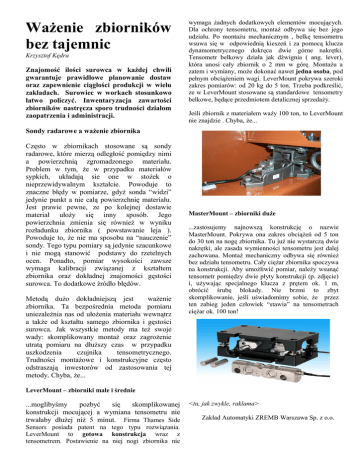 Ważenie zbiorników bez tajemnic Krzysztof Kędra Znajomość ilości surowca w każdej chwili gwarantuje prawidłowe planowanie dostaw oraz zapewnienie ciągłości produkcji w wielu zakładach. Surowiec w workach stosunkowo łatwo policzyć. Inwentaryzacja zawartości zbiorników nastręcza sporo trudności działom zaopatrzenia i administracji. wymaga żadnych dodatkowych elementów mocujących. Dla ochrony tensometru, montaż odbywa się bez jego udziału. Po montażu mechanicznym , belkę tensometru wsuwa się w odpowiednią kieszeń i za pomocą klucza dynamometrycznego dokręca dwie górne nakrętki. Tensometr belkowy działa jak dźwignia ( ang. lever), która unosi cały zbiornik o 2 mm w górę. Montażu a zatem i wymiany, może dokonać nawet jedna osoba, pod pełnym obciążeniem wagi. LeverMount pokrywa szeroki zakres pomiarów: od 20 kg do 5 ton. Trzeba podkreślić, ze w LeverMount stosowane są standardowe tensometry belkowe, będące przedmiotem detalicznej sprzedaży. Jeśli zbiornik z materiałem waży 100 ton, to LeverMount nie znajdzie . Chyba, że... Sondy radarowe a ważenie zbiornika Często w zbiornikach stosowane są sondy radarowe, które mierzą odległość pomiędzy nimi a powierzchnią zgromadzonego materiału. Problem w tym, że w przypadku materiałów sypkich, układają sie one w stożek o nieprzewidywalnym kształcie. Powoduje to znaczne błędy w pomiarze, gdyż sonda “widzi” jedynie punkt a nie całą powierzchnię materiału. Jest prawie pewne, ze po kolejnej dostawie materiał ułoży się inny sposób. Jego powierzchnia zmienia się również w wyniku rozładunku zbiornika ( powstawanie leja ). Powoduje to, że nie ma sposobu na “nauczenie” sondy. Tego typu pomiary są jedynie szacunkowe i nie mogą stanowić podstawy do rzetelnych ocen. Ponadto, pomiar wysokości zawsze wymaga kalibracji związanej z kształtem zbiornika oraz dokładnej znajomości gęstości surowca. To dodatkowe źródło błędów. Metodą dużo dokładniejszą jest ważenie zbiornika. Ta bezpośrednia metoda pomiaru uniezależnia nas od ułożenia materiału wewnątrz a także od kształtu samego zbiornika i gęstości surowca. Jak wszystkie metody ma też swoje wady: skomplikowany montaż oraz zagrożenie utratą pomiaru na dłuższy czas w przypadku uszkodzenia czujnika tensometrycznego. Trudności montażowe i konstrukcyjne często odstraszają inwestorów od zastosowania tej metody. Chyba, że... MasterMount – zbiorniki duże ...zastosujemy najnowszą konstrukcję o nazwie MasterMount. Pokrywa ona zakres obciążeń od 5 ton do 30 ton na nogę zbiornika. Tu już nie wystarczą dwie nakrętki, ale zasada wymienności tensometru jest dalej zachowana. Montaż mechaniczny odbywa się również bez udziału tensometru. Cały ciężar zbiornika spoczywa na konstrukcji. Aby umożliwić pomiar, należy wsunąć tensometr pomiędzy dwie płyty konstrukcji (p. zdjęcie) i, używając specjalnego klucza z prętem ok. 1 m, obrócić śrubę blokady. Nie brzmi to zbyt skomplikowanie, jeśli uświadomimy sobie, że przez ten zabieg jeden człowiek “stawia” na tensometrach ciężar ok. 100 ton! LeverMount – zbiorniki małe i średnie ...moglibyśmy pozbyć się skomplikowanej konstrukcji mocującej a wymiana tensometru nie trwałaby dłużej niż 5 minut. Firma Thames Side Sensors posiada patent na tego typu rozwiązania. LeverMount to gotowa konstrukcja wraz z tensometrem. Postawienie na niej nogi zbiornika nie <tu, jak zwykle, raklama> Zakład Automatyki ZREMB Warszawa Sp. z o.o.