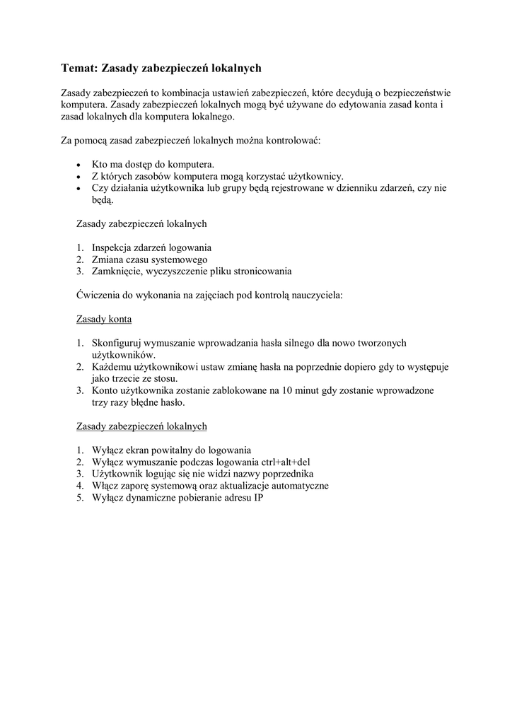 Temat: Zasady zabezpieczeń lokalnych Zasady zabezpieczeń to kombinacja ustawień zabezpieczeń, które decydują o bezpieczeństwie komputera. Zasady zabezpieczeń lokalnych mogą być używane do edytowania zasad konta i zasad lokalnych dla komputera lokalnego. Za pomocą zasad zabezpieczeń lokalnych można kontrolować:    Kto ma dostęp do komputera. Z których zasobów komputera mogą korzystać użytkownicy. Czy działania użytkownika lub grupy będą rejestrowane w dzienniku zdarzeń, czy nie będą. Zasady zabezpieczeń lokalnych 1. Inspekcja zdarzeń logowania 2. Zmiana czasu systemowego 3. Zamknięcie, wyczyszczenie pliku stronicowania Ćwiczenia do wykonania na zajęciach pod kontrolą nauczyciela: Zasady konta 1. Skonfiguruj wymuszanie wprowadzania hasła silnego dla nowo tworzonych użytkowników. 2. Każdemu użytkownikowi ustaw zmianę hasła na poprzednie dopiero gdy to występuje jako trzecie ze stosu. 3. Konto użytkownika zostanie zablokowane na 10 minut gdy zostanie wprowadzone trzy razy błędne hasło. Zasady zabezpieczeń lokalnych 1. 2. 3. 4. 5. Wyłącz ekran powitalny do logowania Wyłącz wymuszanie podczas logowania ctrl+alt+del Użytkownik logując się nie widzi nazwy poprzednika Włącz zaporę systemową oraz aktualizacje automatyczne Wyłącz dynamiczne pobieranie adresu IP