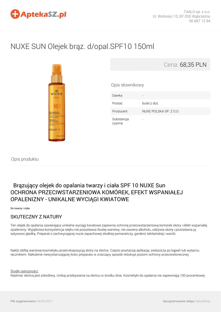 TAALO sp. z o.o. Ul. Wolności 10, 87-200 Wąbrzeźno 56 687 12 94 NUXE SUN Olejek brąz. d/opal.SPF10 150ml Cena: 68,35 PLN Opis słownikowy Dawka - Postać butel.z doz. Producent NUXE POLSKA SP. Z O.O. Substancja czynna - Opis produktu Brązujący olejek do opalania twarzy i ciała SPF 10 NUXE Sun OCHRONA PRZECIWSTARZENIOWA KOMÓREK, EFEKT WSPANIAŁEJ OPALENIZNY - UNIKALNE WYCIĄGI KWIATOWE Do twarzy i ciała SKUTECZNY Z NATURY Ten olejek do opalania zawierający unikalne wyciągi kwiatowe zapewnia ochronę przeciwstarzeniową komórek skóry i efekt wspaniałej opalenizny. Wyjątkowa konsystencja olejku nie pozostawia tłustej warstwy, nie zawiera alkoholu, odżywia skórę i pozostawia ją satynowo gładką. Preparat o zachwycającej nucie zapachowej słodkiej pomarańczy, gardenii tahitańskiej i wanilii. Nałóż obfitą warstwę kosmetyku przed ekspozycją skóry na słońce. Często powtarzaj aplikację, zwłaszcza po kąpieli lub wytarciu ręcznikiem. Nałożenie niewystarczającej ilości preparatu w znaczący sposób redukuje poziom ochrony przeciwsłonecznej. Środki ostrożności: Nadmiar słońca jest szkodliwy. Unikaj przebywania na słońcu w środku dnia. Kosmetyki do opalania nie zapewniają 100-procentowej Plik wygenerowano: 04-03-2017 Oprogramowanie sklepu: AptusShop TAALO sp. z o.o. Ul. Wolności 10, 87-200 Wąbrzeźno 56 687 12 94 ochrony. Nie rozpylaj preparatu bezpośrednio na twarz. Plik wygenerowano: 04-03-2017 Powered by TCPDF (www.tcpdf.org) Oprogramowanie sklepu: AptusShop
