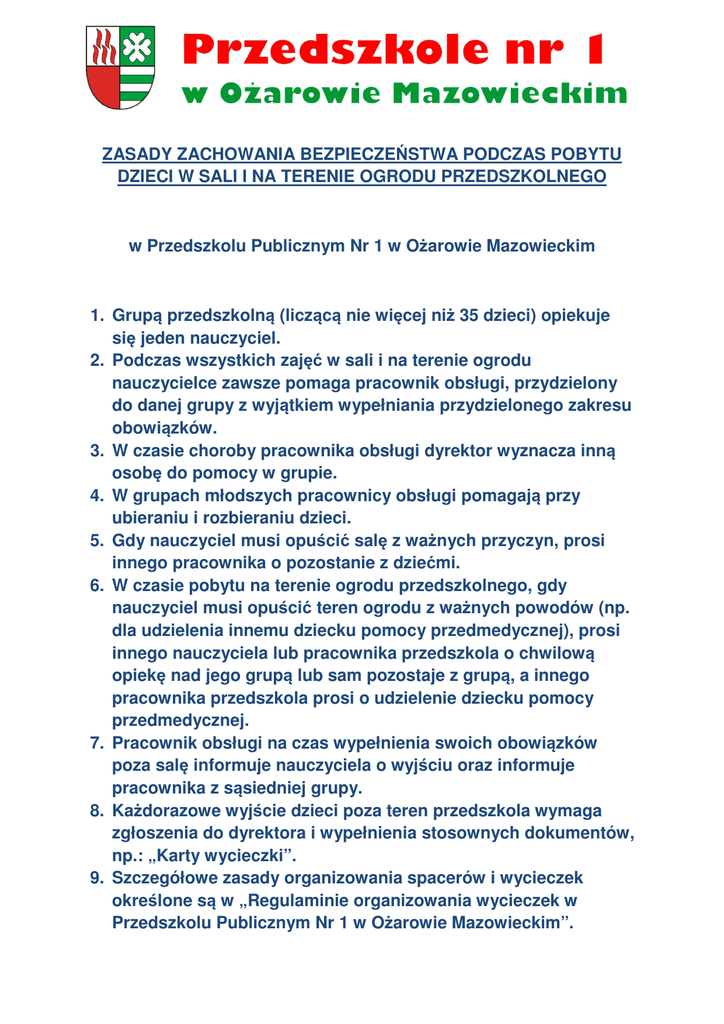 ZASADY ZACHOWANIA BEZPIECZEŃSTWA PODCZAS POBYTU DZIECI W SALI I NA TERENIE OGRODU PRZEDSZKOLNEGO w Przedszkolu Publicznym Nr 1 w Ożarowie Mazowieckim 1. Grupą przedszkolną (liczącą nie więcej niż 35 dzieci) opiekuje się jeden nauczyciel. 2. Podczas wszystkich zajęć w sali i na terenie ogrodu nauczycielce zawsze pomaga pracownik obsługi, przydzielony do danej grupy z wyjątkiem wypełniania przydzielonego zakresu obowiązków. 3. W czasie choroby pracownika obsługi dyrektor wyznacza inną osobę do pomocy w grupie. 4. W grupach młodszych pracownicy obsługi pomagają przy ubieraniu i rozbieraniu dzieci. 5. Gdy nauczyciel musi opuścić salę z ważnych przyczyn, prosi innego pracownika o pozostanie z dziećmi. 6. W czasie pobytu na terenie ogrodu przedszkolnego, gdy nauczyciel musi opuścić teren ogrodu z ważnych powodów (np. dla udzielenia innemu dziecku pomocy przedmedycznej), prosi innego nauczyciela lub pracownika przedszkola o chwilową opiekę nad jego grupą lub sam pozostaje z grupą, a innego pracownika przedszkola prosi o udzielenie dziecku pomocy przedmedycznej. 7. Pracownik obsługi na czas wypełnienia swoich obowiązków poza salę informuje nauczyciela o wyjściu oraz informuje pracownika z sąsiedniej grupy. 8. Każdorazowe wyjście dzieci poza teren przedszkola wymaga zgłoszenia do dyrektora i wypełnienia stosownych dokumentów, np.: „Karty wycieczki”. 9. Szczegółowe zasady organizowania spacerów i wycieczek określone są w „Regulaminie organizowania wycieczek w Przedszkolu Publicznym Nr 1 w Ożarowie Mazowieckim”.