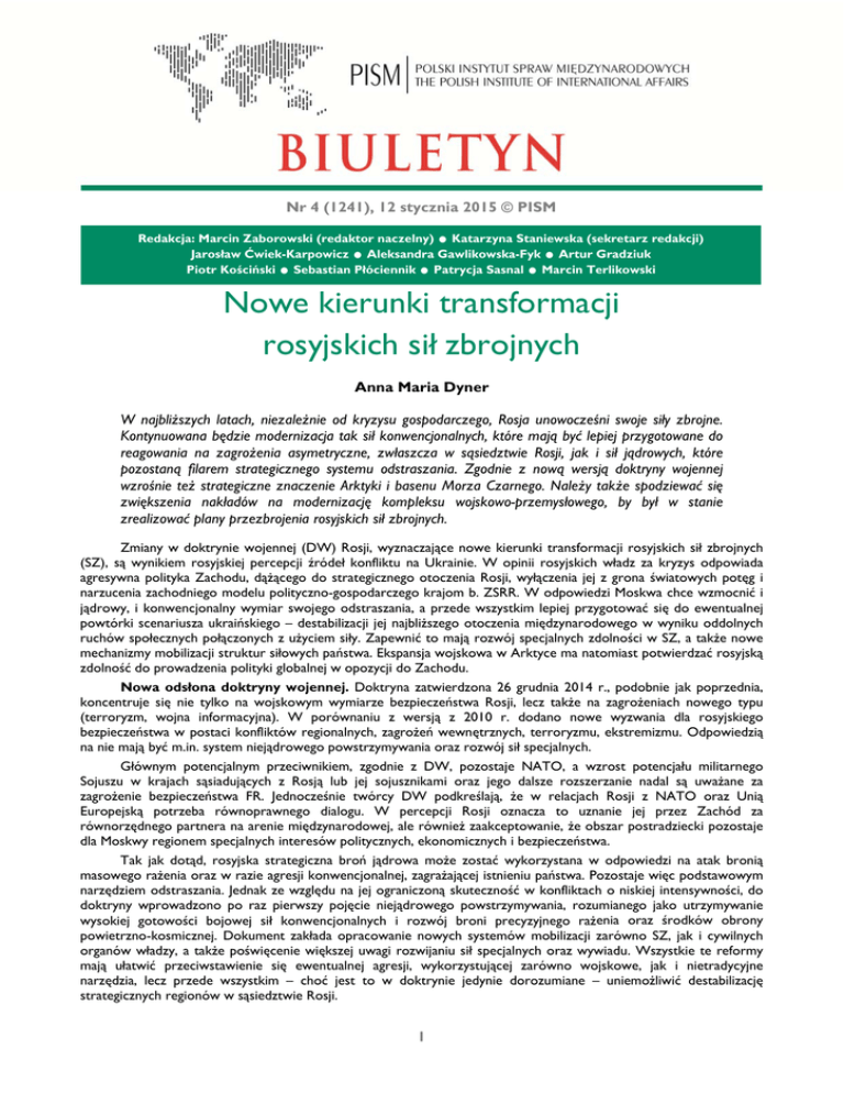 Nr 4 (1241), 12 stycznia 2015 © PISM . . .. Redakcja: Marcin Zaborowski (redaktor naczelny) Katarzyna Staniewska (sekretarz redakcji) Jarosław Ćwiek-Karpowicz Aleksandra Gawlikowska-Fyk Artur Gradziuk Piotr Kościński Sebastian Płóciennik Patrycja Sasnal Marcin Terlikowski . . Nowe kierunki transformacji rosyjskich sił zbrojnych Anna Maria Dyner W najbliższych latach, niezależnie od kryzysu gospodarczego, Rosja unowocześni swoje siły zbrojne. Kontynuowana będzie modernizacja tak sił konwencjonalnych, które mają być lepiej przygotowane do reagowania na zagrożenia asymetryczne, zwłaszcza w sąsiedztwie Rosji, jak i sił jądrowych, które pozostaną filarem strategicznego systemu odstraszania. Zgodnie z nową wersją doktryny wojennej wzrośnie też strategiczne znaczenie Arktyki i basenu Morza Czarnego. Należy także spodziewać się zwiększenia nakładów na modernizację kompleksu wojskowo-przemysłowego, by był w stanie zrealizować plany przezbrojenia rosyjskich sił zbrojnych. Zmiany w doktrynie wojennej (DW) Rosji, wyznaczające nowe kierunki transformacji rosyjskich sił zbrojnych (SZ), są wynikiem rosyjskiej percepcji źródeł konfliktu na Ukrainie. W opinii rosyjskich władz za kryzys odpowiada agresywna polityka Zachodu, dążącego do strategicznego otoczenia Rosji, wyłączenia jej z grona światowych potęg i narzucenia zachodniego modelu polityczno-gospodarczego krajom b. ZSRR. W odpowiedzi Moskwa chce wzmocnić i jądrowy, i konwencjonalny wymiar swojego odstraszania, a przede wszystkim lepiej przygotować się do ewentualnej powtórki scenariusza ukraińskiego – destabilizacji jej najbliższego otoczenia międzynarodowego w wyniku oddolnych ruchów społecznych połączonych z użyciem siły. Zapewnić to mają rozwój specjalnych zdolności w SZ, a także nowe mechanizmy mobilizacji struktur siłowych państwa. Ekspansja wojskowa w Arktyce ma natomiast potwierdzać rosyjską zdolność do prowadzenia polityki globalnej w opozycji do Zachodu. Nowa odsłona doktryny wojennej. Doktryna zatwierdzona 26 grudnia 2014 r., podobnie jak poprzednia, koncentruje się nie tylko na wojskowym wymiarze bezpieczeństwa Rosji, lecz także na zagrożeniach nowego typu (terroryzm, wojna informacyjna). W porównaniu z wersją z 2010 r. dodano nowe wyzwania dla rosyjskiego bezpieczeństwa w postaci konfliktów regionalnych, zagrożeń wewnętrznych, terroryzmu, ekstremizmu. Odpowiedzią na nie mają być m.in. system niejądrowego powstrzymywania oraz rozwój sił specjalnych. Głównym potencjalnym przeciwnikiem, zgodnie z DW, pozostaje NATO, a wzrost potencjału militarnego Sojuszu w krajach sąsiadujących z Rosją lub jej sojusznikami oraz jego dalsze rozszerzanie nadal są uważane za zagrożenie bezpieczeństwa FR. Jednocześnie twórcy DW podkreślają, że w relacjach Rosji z NATO oraz Unią Europejską potrzeba równoprawnego dialogu. W percepcji Rosji oznacza to uznanie jej przez Zachód za równorzędnego partnera na arenie międzynarodowej, ale również zaakceptowanie, że obszar postradziecki pozostaje dla Moskwy regionem specjalnych interesów politycznych, ekonomicznych i bezpieczeństwa. Tak jak dotąd, rosyjska strategiczna broń jądrowa może zostać wykorzystana w odpowiedzi na atak bronią masowego rażenia oraz w razie agresji konwencjonalnej, zagrażającej istnieniu państwa. Pozostaje więc podstawowym narzędziem odstraszania. Jednak ze względu na jej ograniczoną skuteczność w konfliktach o niskiej intensywności, do doktryny wprowadzono po raz pierwszy pojęcie niejądrowego powstrzymywania, rozumianego jako utrzymywanie wysokiej gotowości bojowej sił konwencjonalnych i rozwój broni precyzyjnego rażenia oraz środków obrony powietrzno-kosmicznej. Dokument zakłada opracowanie nowych systemów mobilizacji zarówno SZ, jak i cywilnych organów władzy, a także poświęcenie większej uwagi rozwijaniu sił specjalnych oraz wywiadu. Wszystkie te reformy mają ułatwić przeciwstawienie się ewentualnej agresji, wykorzystującej zarówno wojskowe, jak i nietradycyjne narzędzia, lecz przede wszystkim – choć jest to w doktrynie jedynie dorozumiane – uniemożliwić destabilizację strategicznych regionów w sąsiedztwie Rosji. 1 Rozszerzono katalog zagrożeń wewnętrznych, wskazując jako najważniejsze: terroryzm, separatyzm, wrogie działania w sferze informacyjnej oraz wywoływanie napięć narodowościowych, religijnych i społecznych, m.in. przez wykorzystywanie sił politycznych i organizacji pozarządowych rzekomo finansowanych i zarządzanych z zagranicy. Za wyzwanie dla bezpieczeństwa Rosji uznano też siłowe zmiany ustroju w państwach sąsiednich, godzące w jej interesy, co należy odczytywać już jako bezpośrednią reakcję na wydarzenia na Ukrainie. Nowa wersja DW jest jedynie początkiem zmian dokumentów strategicznych w obszarze bezpieczeństwa – na grudzień 2015 r. zapowiedziano publikację Planu obrony na lata 2016–2020. W najbliższym czasie powstanie też nowa doktryna morska FR do 2030 r. Zakłada ona skoncentrowanie rosyjskiej polityki morskiej na Arktyce i kierunku atlantyckim, w tym – Morzu Czarnym z Półwyspem Krymskim. Wojskowa polityka Rosji zatem ma również zabezpieczać jej gospodarcze interesy w sąsiedztwie. Arktyka – nowy kierunek strategiczny. Od kilku lat Rosja próbuje aktywnie zabezpieczać swoje interesy w Arktyce, postrzeganej jako cenne źródło zasobów naturalnych i region kluczowy dla transportu morskiego w przyszłości, jednocześnie będącej terytorium spornym między USA, Norwegią, Danią i Kanadą. Rosjanie jako pierwsi nadają wojskowy wymiar swojej polityce wobec tego regionu – 1 grudnia 2014 r., na bazie Floty Północnej (FP), powstało Połączone Dowództwo Strategiczne Północ (PDSP) będące uzupełnieniem dotychczasowych czterech okręgów wojskowych (OW). Z dużym prawdopodobieństwem można założyć, że w przyszłości zostanie ono przekształcone w