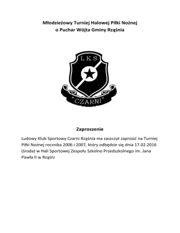 Młodzieżowy Turniej Halowej Piłki Nożnej o Puchar Wójta Gminy Rząśnia Zaproszenie Ludowy Klub Sportowy Czarni Rząśnia ma zaszczyt zaprosić na Turniej Piłki Nożnej rocznika 2006 i 2007, który odbędzie się dnia 17.02.2016 (środa) w Hali Sportowej Zespołu Szkolno Przedszkolnego im. Jana Pawła II w Rząśni Organizator: LKS CZARNI RZĄŚNIA Data i miejsce: 17.02.2016 (środa) Godz. 9.00. Hala Sportowa Zespołu Szkolno- Przedszkolnego w Rząśni. Cel imprezy: Popularyzacja piłki nożnej wśród dzieci, propagowanie idei wychowania przez sport. Uczestnictwo: W turnieju weźmie udział 5 zespołów z rocznika 2006 i 5 zespołów z rocznika 2007. Drużyna składa sie maksymalnie z 12 zawodników i trenera. System rozgrywek: Dwie grupy po 5 zespołów. w grupie A rywalizują drużyny z rocznika 2006, w grupie B z rocznika 2007, systemem każdy z każdym. W każdej grupie prowadzona będzie klasyfikacja. Liczba zawodników przebywających na boisku 4 + bramkarz. Czas trwania meczu 15 min. Przewidywany czas trwania turnieju 9.00 - 16.00 Punktacja: Za zwycięstwo drużyna otrzymuje 3 pkt. ,w przypadku remisu drużyna otrzymuje 1 pkt. Natomiast w przypadku porażki 0 pkt. O miejscu w tabeli decyduje w kolejności: liczba zdobytych punktów, wynik bezpośredniego spotkania, różnica bramek, większa ilość strzelonych bramek. Królem strzelców Turnieju zostaje zawodnik, który strzelił w całym turnieju najwięcej bramek Najlepszego bramkarza i zawodnika wybierają organizatorzy turnieju. Zasady Gry: boisko o wymiarach 40x20 /bramki do piłki ręcznej 2x3 m, liczba zawodników 4+ bramkarz, zmiany zawodników systemem hokejowym przy linii środkowej, zawody będą rozgrywane piłką nr 4, rzut karny wykonuje sie z odległości 7 m, po wyjściu piłki na aut następuje zagranie piłki z nogi, piłka nie może zostać zagrana powyżej kolan, odległość muru przy stałych fragmentach gry 4 m, gra bez spalonych, pozostałe przepisy zgodnie z wymogami ustalonymi przez PZPN, drużyny obowiązuje jednolity strój, za rażące przewinienia zawodnik może być usunięty z boiska na karę 2-5 min. WSZYSTKICH ZAWODNIKÓW OBOWIĄZUJE POSIADANIE LEGITYMACJI ORAZ AKTUALNYCH BADAŃ LEKARSKICH Sprawy organizacyjne: decyzję w sprawach nie ujętych regulaminem podejmuje organizator, organizator nie ubezpiecza zawodników i nie ponosi odpowiedzialności za szkody lub wypadki losowe, poniesione przez uczestników turnieju, organizator nie bierze odpowiedzialności za wartościowe rzeczy pozostawione w szatni, organizator zapewnia opiekę medyczną podczas trwania turnieju, organizator zapewnia napoje chłodzące dla zawodników. Informacje dodatkowe: organizator zapewnia obiad dla każdego uczestnika turnieju, turniej jest bez wpisowego, wszelkie koszty pokrywa organizator. Kontakt do organizatora: Tomasz Filipiak - 609 281 258 Michał Krawczyk - 602 552 606 SKŁAD ZESPOŁU NR 1 2 3 4 5 6 7 8 9 10 11 12 IMIĘ I NAZWISKO NUMER ZAWODNIKA Uczestnicy Grupa A (2006) 1) Czarni Rząśnia 2) Diament Zduńska Wola 3) WKS Wieluń 4) APN Piotrków Trybunalski 5)Bełchatowska Akademia Piłkarska Soccer Grupa B (2007) 1) Czarni Rząśnia 2)GKS Bełchatów 3) WKS Wieluń 4) APN Piotrków Trybunalski 5)Bełchatowska Akademia Piłkarska Soccer