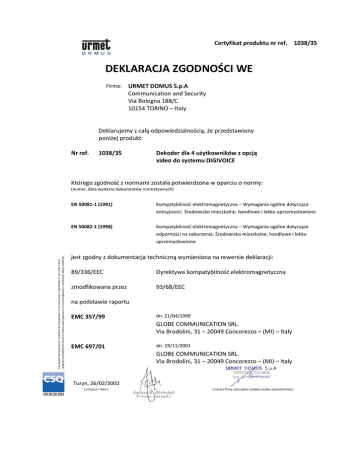 Certyfikat produktu nr ref. 1038/35 DEKLARACJA ZGODNOŚCI WE Firma: URMET DOMUS S.p.A Communication and Security Via Bologna 188/C 10154 TORINO – Italy Deklarujemy z całą odpowiedzialnością, że przedstawiony poniżej produkt: Nr ref. 1038/35 Dekoder dla 4 użytkowników z opcją video do systemu DIGIVOICE Którego zgodność z normami została potwierdzona w oparciu o normy: Il presente documento ha carattere di riservatezza e non può essere riprodotto o reso noto a terzi neppure parzialmente senza la nostra autorizzazione; la sua divulgazione costituisce abuso evidente. (numer, data wydania dokumentów normatywnych) EN 50081-1 (1991) Kompatybilność elektromagnetyczna – Wymagania ogólne dotyczące emisyjności. Środowisko mieszkalne, handlowe i lekko uprzemysłowione EN 50082-1 (1998) Kompatybilność elektromagnetyczna – Wymagania ogólne dotyczące odporności na zaburzenia. Środowisko mieszkalne, handlowe i lekko uprzemysłowione. jest zgodny z dokumentacja techniczną wymieniona na rewersie deklaracji: 89/336/EEC Dyrektywa kompatybilność elektromagnetyczna zmodfikowana przez 93/68/EEC na podstawie raportu EMC 357/99 dn. 21/04/1999 GLOBE COMMUNICATION SRL. Via Brodolini, 31 – 20049 Concorezzo – (MI) – Italy EMC 697/01 dn. 19/11/2001 GLOBE COMMUNICATION SRL. Via Brodolini, 31 – 20049 Concorezzo – (MI) – Italy Turyn, 26/02/2002 ( miejsce i data ) UNI EN ISO 9001 ( nazwa firmy, pieczątka i podpis osoby upoważnionej )