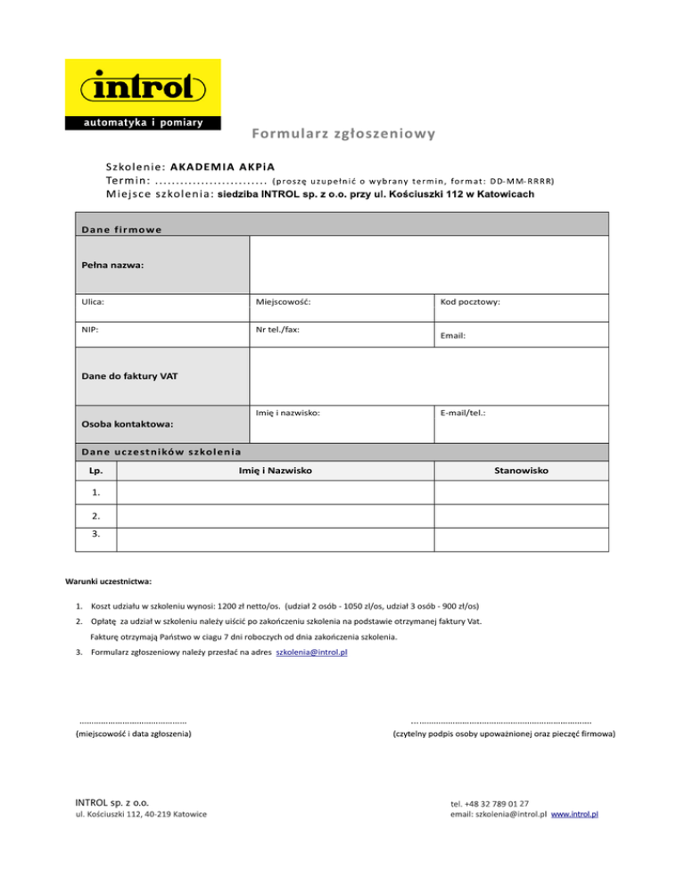 D a n e f i r mo w e Pełna nazwa: Ulica: Miejscowość: NIP: Nr tel./fax: Kod pocztowy: Email: Dane do faktury VAT Imię i nazwisko: E-mail/tel.: Osoba kontaktowa: D a n e u c ze st n i kó w s zko l e n i a Lp. Imię i Nazwisko Stanowisko 1. 2. 3. Warunki uczestnictwa: 1. Koszt udziału w szkoleniu wynosi: 1200 zł netto/os. (udział 2 osób - 1050 zl/os, udział 3 osób - 900 zł/os) 2. Opłatę za udział w szkoleniu należy uiścić po zakończeniu szkolenia na podstawie otrzymanej faktury Vat. Fakturę otrzymają Państwo w ciagu 7 dni roboczych od dnia zakończenia szkolenia. 3. Formularz zgłoszeniowy należy przesłać na adres [email protected] INTROL sp. z o.o. 27