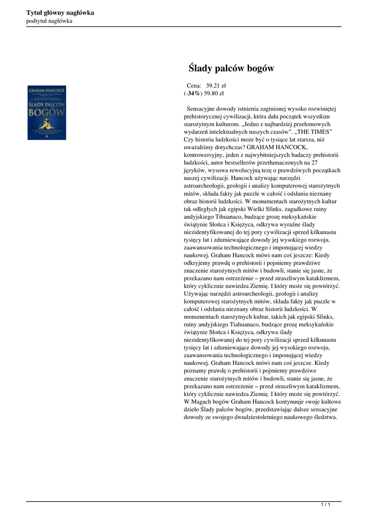 Tytuł główny nagłówka podtytuł nagłówka Ślady palców bogów Cena: 39.21 zł (-34%) 59.80 zł Sensacyjne dowody istnienia zaginionej wysoko rozwiniętej prehistorycznej cywilizacji, która dała początek wszystkim starożytnym kulturom. „Jedno z najbardziej przełomowych wydarzeń intelektualnych naszych czasów”. „THE TIMES” Czy historia ludzkości może być o tysiące lat starsza, niż uważaliśmy dotychczas? GRAHAM HANCOCK, kontrowersyjny, jeden z najwybitniejszych badaczy prehistorii ludzkości, autor bestsellerów przetłumaczonych na 27 języków, wysuwa rewolucyjną tezę o prawdziwych początkach naszej cywilizacji. Hancock używając narzędzi astroarcheologii, geologii i analizy komputerowej starożytnych mitów, składa fakty jak puzzle w całość i odsłania nieznany obraz historii ludzkości. W monumentach starożytnych kultur tak odległych jak egipski Wielki Sfinks, zagadkowe ruiny andyjskiego Tihuanaco, budzące grozę meksykańskie świątynie Słońca i Księżyca, odkrywa wyraźne ślady niezidentyfikowanej do tej pory cywilizacji sprzed kilkunastu tysięcy lat i zdumiewające dowody jej wysokiego rozwoju, zaawansowania technologicznego i imponującej wiedzy naukowej. Graham Hancock mówi nam coś jeszcze: Kiedy odkryjemy prawdę o prehistorii i pojmiemy prawdziwe znaczenie starożytnych mitów i budowli, stanie się jasne, że przekazano nam ostrzeżenie – przed straszliwym kataklizmem, który cyklicznie nawiedza Ziemię. I który może się powtórzyć. Używając narzędzi astroarcheologii, geologii i analizy komputerowej starożytnych mitów, składa fakty jak puzzle w całość i odsłania nieznany obraz historii ludzkości. W monumentach starożytnych kultur, takich jak egipski Sfinks, ruiny andyjskiego Tiahuanaco, budzące grozę meksykańskie świątynie Słońca i Księżyca, odkrywa ślady niezidentyfikowanej do tej pory cywilizacji sprzed kilkunastu tysięcy lat i zdumiewające dowody jej wysokiego rozwoju, zaawansowania technologicznego i imponującej wiedzy naukowej. Graham Hancock mówi nam coś jeszcze. Kiedy poznamy prawdę o prehistorii i pojmiemy prawdziwe znaczenie starożytnych mitów i budowli, stanie się jasne, że przekazano nam ostrzeżenie – przed straszliwym kataklizmem, który cyklicznie nawiedza Ziemię. I który może się powtórzyć. W Magach bogów Graham Hancock kontynuuje swoje kultowe dzieło Ślady palców bogów, przedstawiając dalsze sensacyjne dowody ze swojego dwudziestoletniego naukowego śledztwa. 1/1 Powered by TCPDF (www.tcpdf.org)