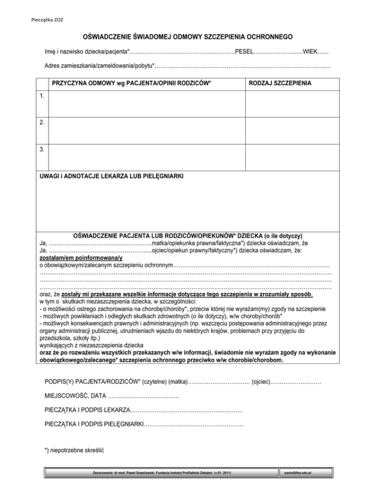 oświadczenie świadomej odmowy szczepienia ochronnego