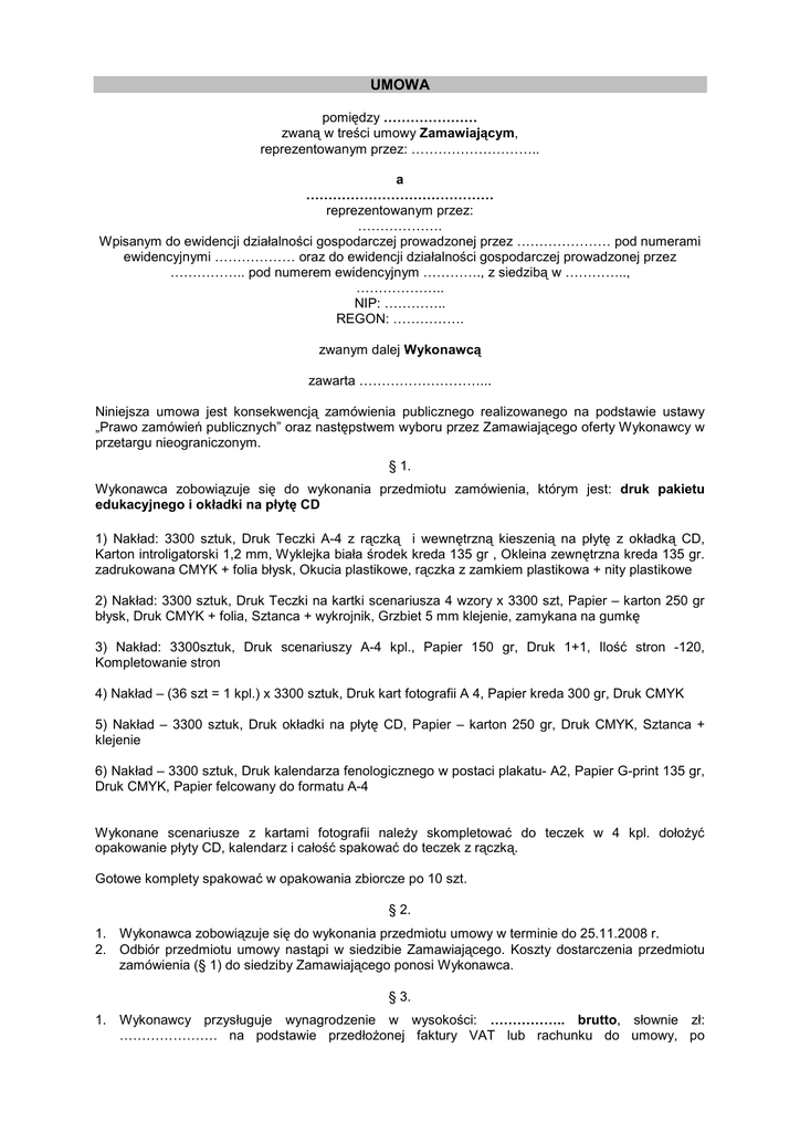 UMOWA pomiędzy ………………… zwaną w treści umowy Zamawiającym, reprezentowanym przez: ……………………….. a …………………………………… reprezentowanym przez: ………………. Wpisanym do ewidencji działalności gospodarczej prowadzonej przez ………………… pod numerami ewidencyjnymi ……………… oraz do ewidencji działalności gospodarczej prowadzonej przez …………….. pod numerem ewidencyjnym …………., z siedzibą w ………….., ……………….. NIP: ………….. REGON: ……………. zwanym dalej Wykonawcą zawarta ………………………... Niniejsza umowa jest konsekwencją zamówienia publicznego realizowanego na podstawie ustawy „Prawo zamówień publicznych” oraz następstwem wyboru przez Zamawiającego oferty Wykonawcy w przetargu nieograniczonym. § 1. Wykonawca zobowiązuje się do wykonania przedmiotu zamówienia, którym jest: druk pakietu edukacyjnego i okładki na płytę CD 1) Nakład: 3300 sztuk, Druk Teczki A-4 z rączką i wewnętrzną kieszenią na płytę z okładką CD, Karton introligatorski 1,2 mm, Wyklejka biała środek kreda 135 gr , Okleina zewnętrzna kreda 135 gr. zadrukowana CMYK + folia błysk, Okucia plastikowe, rączka z zamkiem plastikowa + nity plastikowe 2) Nakład: 3300 sztuk, Druk Teczki na kartki scenariusza 4 wzory x 3300 szt, Papier – karton 250 gr błysk, Druk CMYK + folia, Sztanca + wykrojnik, Grzbiet 5 mm klejenie, zamykana na gumkę 3) Nakład: 3300sztuk, Druk scenariuszy A-4 kpl., Papier 150 gr, Druk 1+1, Ilość stron -120, Kompletowanie stron 4) Nakład – (36 szt = 1 kpl.) x 3300 sztuk, Druk kart fotografii A 4, Papier kreda 300 gr, Druk CMYK 5) Nakład – 3300 sztuk, Druk okładki na płytę CD, Papier – karton 250 gr, Druk CMYK, Sztanca + klejenie 6) Nakład – 3300 sztuk, Druk kalendarza fenologicznego w postaci plakatu- A2, Papier G-print 135 gr, Druk CMYK, Papier felcowany do formatu A-4 Wykonane scenariusze z kartami fotografii naleŜy skompletować do teczek w 4 kpl. dołoŜyć opakowanie płyty CD, kalendarz i całość spakować do teczek z rączką. Gotowe komplety spakować w opakowania zbiorcze po 10 szt. § 2. 1. Wykonawca zobowiązuje się do wykonania przedmiotu umowy w terminie do 25.11.2008 r. 2. Odbiór przedmiotu umowy nastąpi w siedzibie Zamawiającego. Koszty dostarczenia przedmiotu zamówienia (§ 1) do siedziby Zamawiającego ponosi Wykonawca. § 3. 1. Wykonawcy przysługuje wynagrodzenie w wysokości: …………….. brutto, słownie zł: …………………. na podstawie przedłoŜonej faktury VAT lub rachunku do umowy, po zaakceptowaniu bez zastrzeŜeń przez Zamawiającego wykonanego dzieła w protokole odbioru wykonanych prac – załącznik do umowy. 2. Wynagrodzenie płatne będzie przelewem na konto Wykonawcy. 3. Za datę wypłaty uwaŜa się datę obciąŜenia rachunku w banku Zamawiającego. § 4. 1. Podstawą do wykonania pakietu edukacyjnego i okładki na płytę CD są materiały opracowane przez Zamawiającego. 2. Zamawiający dostarczy materiały do 07.11.2008 r. 3. Wykonawca dostarczy Zamawiającemu wersję roboczą pakietu edukacyjnego i okładki na płytę CD do 14.11.2008 r. 4. Zamawiający zachowuje prawa autorskie do pakietu edukacyjnego i okładki na płytę CD. 5. Wykonawca zobowiązuje się do wykonania przedmiotu zamówienia z zachowaniem wysokiej jakości druku uwzględniając informacje i poprawki Zamawiającego. 6. Zamawiający zastrzega sobie moŜliwość nie przyjęcia przedmiotu zamówienia jeśli jakość druku nie będzie zadawalająca. § 5. 1. W przypadku nie dotrzymania terminu przez Wykonawcę Zamawiającemu przysługuje prawo do dochodzenia odszkodowania w wysokości 0,14% wartości zlecenia za kaŜdy dzień przekroczenia terminu. 2. W przypadku nieuzasadnionego odstąpienia przez Zamawiającego od umowy, Zamawiający zapłaci Wykonawcy karę umowną w wysokości 20% wartości umowy. 3. W przypadku nieuzasadnionego odstąpienia przez Wykonawcę od umowy, Wykonawca zapłaci Zamawiającemu karę umowną w wysokości 20% wartości umowy. § 6. 1. Jakiekolwiek zmiany umowy wymagają formy pisemnej pod rygorem niewaŜności. 2. W sprawach nie unormowanych niniejszą umową mają zastosowanie przepisy Kodeksu Cywilnego. 3. Wszelkie spory wynikłe z realizacji niniejszej umowy rozstrzygane będą przez sąd właściwy miejscowo dla siedziby Zamawiającego. § 7. 1. Umowa została sporządzona w dwóch jednobrzmiących egzemplarzach, po jednym dla kaŜdej ze stron. ZAMAWIAJĄCY: WYKONAWCA: Kraków, 25.11.2008 Protokół odbioru wykonanych prac Oświadczam iŜ praca wykonana przez: ……………………………………… związana z wykonaniem pracy: Druk pakietu edukacyjnego i okładki na płytę CD 1) Nakład: 3300 sztuk, Druk Teczki A-4 z rączką i wewnętrzną kieszenią na płytę z okładką CD, Karton introligatorski 1,2 mm, Wyklejka biała środek kreda 135 gr , Okleina zewnętrzna kreda 135 gr. zadrukowana CMYK + folia błysk, Okucia plastikowe, rączka z zamkiem plastikowa + nity plastikowe 2) Nakład: 3300 sztuk, Druk Teczki na kartki scenariusza 4 wzory x 3300 szt, Papier – karton 250 gr błysk, Druk CMYK + folia, Sztanca + wykrojnik, Grzbiet 5 mm klejenie, zamykana na gumkę 3) Nakład: 3300sztuk, Druk scenariuszy A-4 kpl., Papier 150 gr, Druk 1+1, Ilość stron -120, Kompletowanie stron 4) Nakład – (36 szt = 1 kpl.) x 3300 sztuk, Druk kart fotografii A 4, Papier kreda 300 gr, Druk CMYK 5) Nakład – 3300 sztuk, Druk okładki na płytę CD, Papier – karton 250 gr, Druk CMYK, Sztanca + klejenie 6) Nakład – 3300 sztuk, Druk kalendarza fenologicznego w postaci plakatu- A2, Papier G-print 135 gr, Druk CMYK, Papier felcowany do formatu A-4 Wykonane scenariusze z kartami fotografii naleŜy skompletować do teczek w 4 kpl. dołoŜyć opakowanie płyty CD, kalendarz i całość spakować do teczek z rączką. Gotowe komplety spakować w opakowania zbiorcze po 10 szt. z