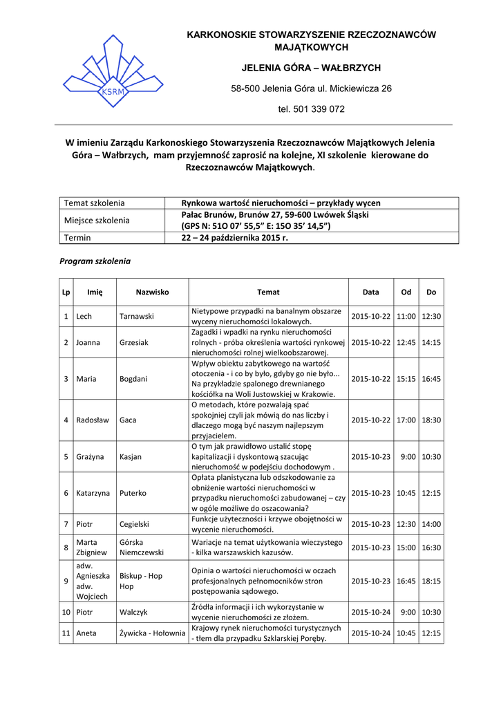 KARKONOSKIE STOWARZYSZENIE RZECZOZNAWCÓW MAJĄTKOWYCH JELENIA GÓRA – WAŁBRZYCH 58-500 Jelenia Góra ul. Mickiewicza 26 tel. 501 339 072 W imieniu Zarządu Karkonoskiego Stowarzyszenia Rzeczoznawców Majątkowych Jelenia Góra – Wałbrzych, mam przyjemność zaprosić na kolejne, XI szkolenie kierowane do Rzeczoznawców Majątkowych. Temat szkolenia Rynkowa wartość nieruchomości – przykłady wycen Pałac Brunów, Brunów 27, 59-600 Lwówek Śląski (GPS N: 51O 07’ 55,5” E: 15O 35’ 14,5”) 22 – 24 października 2015 r. Miejsce szkolenia Termin Program szkolenia Lp Imię Nazwisko 1 Lech Tarnawski 2 Joanna Grzesiak 3 Maria Bogdani 4 Radosław Gaca 5 Grażyna Kasjan 6 Katarzyna Puterko 7 Piotr Cegielski Nietypowe przypadki na banalnym obszarze wyceny nieruchomości lokalowych. Zagadki i wpadki na rynku nieruchomości rolnych - próba określenia wartości rynkowej nieruchomości rolnej wielkoobszarowej. Wpływ obiektu zabytkowego na wartość otoczenia - i co by było, gdyby go nie było... Na przykładzie spalonego drewnianego kościółka na Woli Justowskiej w Krakowie. O metodach, które pozwalają spać spokojniej czyli jak mówią do nas liczby i dlaczego mogą być naszym najlepszym przyjacielem. O tym jak prawidłowo ustalić stopę kapitalizacji i dyskontową szacując nieruchomość w podejściu dochodowym . Opłata planistyczna lub odszkodowanie za obniżenie wartości nieruchomości w przypadku nieruchomości zabudowanej – czy w ogóle możliwe do oszacowania? Funkcje użyteczności i krzywe obojętności w wycenie nieruchomości. Data Od Do 2015-10-22 11:00 12:30 2015-10-22 12:45 14:15 2015-10-22 15:15 16:45 2015-10-22 17:00 18:30 2015-10-23 9:00 10:30 2015-10-23 10:45 12:15 2015-10-23 12:30 14:00 Górska Niemczewski Wariacje na temat użytkowania wieczystego - kilka warszawskich kazusów. 2015-10-23 15:00 16:30 adw. Agnieszka 9 adw. Wojciech Biskup - Hop Hop Opinia o wartości nieruchomości w oczach profesjonalnych pełnomocników stron postępowania sądowego. 2015-10-23 16:45 18:15 10 Piotr Walczyk 8 Marta Zbigniew Temat 11 Aneta Źródła informacji i ich wykorzystanie w wycenie nieruchomości ze złożem. Krajowy rynek nieruchomości turystycznych Żywicka - Hołownia - tłem dla przypadku Szklarskiej Poręby. 2015-10-24 9:00 10:30 2015-10-24 10:45 12:15 KARKONOSKIE STOWARZYSZENIE RZECZOZNAWCÓW MAJĄTKOWYCH JELENIA GÓRA – WAŁBRZYCH 58-500 Jelenia Góra ul. Mickiewicza 26 tel. 501 339 072 Szkolenie obejmuje 22 godziny edukacyjne dla rzeczoznawców majątkowych, w grupach tematycznych A1, A2, A3, A4. Miejsce szkolenia: Pałac Brunów, Brunów 27, 59-600 Lwówek Śląski (www.brunow.pl) Noclegi w : Pałac Brunów, Brunów 27, 59-600 Lwówek Śląski (www.brunow.pl) Główną atrakcją towarzyszącą szkoleniu będzie zwiedzanie Browaru Lwóweckiego http://www.browarlwowek.pl/) Zgłoszenia proszę przesyłać w formie elektronicznej na adres e-mail [email protected] lub [email protected] . KARKONOSKIE STOWARZYSZENIE RZECZOZNAWCÓW MAJĄTKOWYCH JELENIA GÓRA – WAŁBRZYCH 58-500 Jelenia Góra ul. Mickiewicza 26 tel. 501 339 072 Koszt szkolenia obejmuje: 22 godziny edukacyjne wykładów i prelekcji 2 noclegi w pokojach 2 osobowych posiłki od obiadu w dniu 22 października do obiadu w dniu 24 października przerwy kawowe uroczystą kolację w dniu 22 października materiały szkoleniowe zwiedzanie Browaru Lwóweckiego i wynosi: Przy wpłacie do 15 sierpnia 2015 r. (decyduje data wpływu środków na konto KSRM) Z noclegami Dla rzeczoznawców majątkowych stowarzyszonych w organizacjach zawodowych Dla osób niestowarzyszonych Bez noclegów, kolacji, śniadań oraz atrakcji fakultatywnych 750 zł 410 zł 800 zł 460 zł Przy wpłacie od 16 sierpnia 2015 r. do 30 września 2015 r. (decyduje data wpływu środków na konto KSRM) Z noclegami Dla rzeczoznawców majątkowych stowarzyszonych w organizacjach zawodowych Dla osób niestowarzyszonych Bez noclegów, kolacji, śniadań oraz atrakcji fakultatywnych 800 zł 440 zł 850 zł 490 zł Przy wpłacie od 1 października 2015 r. (decyduje data wpływu środków na konto KSRM) Z noclegami Dla rzeczoznawców majątkowych stowarzyszonych w organizacjach zawodowych Dla osób niestowarzyszonych Bez noclegów, kolacji, śniadań oraz atrakcji fakultatywnych 850 zł 470 zł 900 zł 520 zł