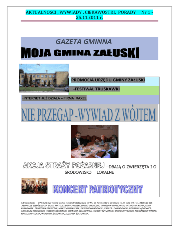 AKTUALNOSCI , WYWIADY , CIEKAWOSTKI, PORADY 25.11.2011 r. Nr 1 - GAZETA GMINNA PROMOCJA URZĘDU GMINY ZAŁUSKI -FESTIWAL TRUSKAWKI -INTERNET JUŻ DZIAŁA – FIRMA RAXEL ŚRODOWISKO –DBAJĄ O ZWIERZĘTA I O LOKALNE Adres redakcji : OPIEKUN mgr Halina Ciarka: Szkoła Podstawowa im WŁ. St. Reymonta w Stróżewie kl. III sala nr 5 tel.(23) 6619 006 .REDAGUJE ZESPÓŁ: JULKA BAJAS, MATEUSZ BORYCHOWSKI, DAWID GMURCZYK, JAROSŁAW IWANOWSKI, KATARZYNA KANIA, MAJA KRAKOWIAK , SEBASTIAN KRAWCZYK, MAKSYMILIAN LESAK, DAWID LEWANDOWSKI, KACPER LEWANDOWSKI, KONRAD PIĄTKIEWICZ, ARKADIUSZ PODGÓRSKI, HUBERT SOBCZYOSKI, DOMINIKA SZAŁKOWSKA, HUBERT SZYMAOSKI, BARTOSZ TYBURSKI, ALEKSANDRA WASIAK, NATALIA WYSOCKA, WERONIKA ŻAKOWSKA, ZUZANNA ŻÓŁTOWSKA. AKTUALNOSCI , WYWIADY , CIEKAWOSTKI, PORADY 25.11.2011 r. Nr 1 - Urząd Gminy Załuski Załuski 67 09-142 Załuski Czas pracy od pon. do piąt. od godz. 7.45 do 15.45 Wójt Gminy Załuski - Romuald Woźniak Sekretariat Tel.: wew. 101 Fax: wew. 114 e-mail: [email protected] Sekretarz Gminy - Urszula Szybińska wew. 108 Skarbnik Gminy - Edyta Sachnowska wew. 116 Dyrektor Wydziału Rozwoju i Promocji Gminy Renata Dobrzyńska Kierownik Urzędu Stanu Cywilnego Ewa Siwek wew. 102 Biuro Obsługi Rady wew. 115 Adres redakcji : OPIEKUN mgr Halina Ciarka: Szkoła Podstawowa im WŁ. St. Reymonta w Stróżewie kl. III sala nr 5 tel.(23) 6619 006 .REDAGUJE ZESPÓŁ: JULKA BAJAS, MATEUSZ BORYCHOWSKI, DAWID GMURCZYK, JAROSŁAW IWANOWSKI, KATARZYNA KANIA, MAJA KRAKOWIAK , SEBASTIAN KRAWCZYK, MAKSYMILIAN LESAK, DAWID LEWANDOWSKI, KACPER LEWANDOWSKI, KONRAD PIĄTKIEWICZ, ARKADIUSZ PODGÓRSKI, HUBERT SOBCZYOSKI, DOMINIKA SZAŁKOWSKA, HUBERT SZYMAOSKI, BARTOSZ TYBURSKI, ALEKSANDRA WASIAK, NATALIA WYSOCKA, WERONIKA ŻAKOWSKA, ZUZANNA ŻÓŁTOWSKA. AKTUALNOSCI , WYWIADY , CIEKAWOSTKI, PORADY 25.11.2011 r. Nr 1 - Podatki wew. 123 Ochrona środowiska wew. 106 Gospodarka gruntami, planowanie przestrzenne wew. 122 Ewidencja działalności gospodarczej, drogi wew. 107 Przetargi Publiczne wew. 124 Biblioteka w Załuskach Adres redakcji : OPIEKUN mgr Halina Ciarka: Szkoła Podstawowa im WŁ. St. Reymonta w Stróżewie kl. III sala nr 5 tel.(23) 6619 006 .REDAGUJE ZESPÓŁ: JULKA BAJAS, MATEUSZ BORYCHOWSKI, DAWID GMURCZYK, JAROSŁAW IWANOWSKI, KATARZYNA KANIA, MAJA KRAKOWIAK , SEBASTIAN KRAWCZYK, MAKSYMILIAN LESAK, DAWID LEWANDOWSKI, KACPER LEWANDOWSKI, KONRAD PIĄTKIEWICZ, ARKADIUSZ PODGÓRSKI, HUBERT SOBCZYOSKI, DOMINIKA SZAŁKOWSKA, HUBERT SZYMAOSKI, BARTOSZ TYBURSKI, ALEKSANDRA WASIAK, NATALIA WYSOCKA, WERONIKA ŻAKOWSKA, ZUZANNA ŻÓŁTOWSKA. AKTUALNOSCI , WYWIADY , CIEKAWOSTKI, PORADY 25.11.2011 r. Nr 1 - wew. 117 NIP Urzędu Gminy: 567-14-67-294 Regon: 000551272 Nr rachunku bankowego: 60 8241 0009 2001 0000 0390 0023 POGODA DEMOGRAFIA Ludność gminy Załuski na dzień 31.12.2010 r. : dane ewidencja ludności Ogółem Mężczyzn Kobiet 5696 2792 2904 OD 1 PAŹDZIERNIKA W SZKOŁACH NA TERENIE GMINY ZAŁUSKI REALIZOWANY JEST PROJEKT ,,UCZĘ SIĘ DLA SIEBIE’’ WSPÓŁFINANSOWANY PO KL Adres redakcji : OPIEKUN mgr Halina Ciarka: Szkoła Podstawowa im WŁ. St. Reymonta w Stróżewie kl. III sala nr 5 tel.(23) 6619 006 .REDAGUJE ZESPÓŁ: JULKA BAJAS, MATEUSZ BORYCHOWSKI, DAWID GMURCZYK, JAROSŁAW IWANOWSKI, KATARZYNA KANIA, MAJA KRAKOWIAK , SEBASTIAN KRAWCZYK, MAKSYMILIAN LESAK, DAWID LEWANDOWSKI, KACPER LEWANDOWSKI, KONRAD PIĄTKIEWICZ, ARKADIUSZ PODGÓRSKI, HUBERT SOBCZYOSKI, DOMINIKA SZAŁKOWSKA, HUBERT SZYMAOSKI, BARTOSZ TYBURSKI, ALEKSANDRA WASIAK, NATALIA WYSOCKA, WERONIKA ŻAKOWSKA, ZUZANNA ŻÓŁTOWSKA. AKTUALNOSCI , WYWIADY , CIEKAWOSTKI, PORADY 25.11.2011 r. Nr 1 - KASA URZĘDU GMINY ZAŁUSKI CZYNNA JEST DO GODZ.15.00 INFORMUJEMY O MOZLIWOŚCI PODŁĄCZENIA DO INTERNETU SZEROKOPASMOWEGO W GMINIE ZAŁUSKI .WIĘCEJ INFORMACJI FIRMA ,,RAXEL’’ NR TEL. 515 246 836 INFORMUJEMY MIESZKAOCÓW GMINY ZAŁUSKI ,ŻE W REMIZIE OSP SZCZYTNO URUCHOMIONE JEST CENTRUM EDUKACYJNO- OŚWIATOWE, KTÓRE PEŁNI ROLE KAFEJKI INTERNETOWEJ SZKOŁY NA TERENIE GMINY ZAŁUSKI Szkoły Podstawowe: Szkoła Podstawowa w Kamienicy Kamienica 44a tel. 23 661 92 17 Dyrektor: Joanna Wiśniewska Adres redakcji : OPIEKUN mgr Halina Ciarka: Szkoła Podstawowa im WŁ. St. Reymonta w Stróżewie kl. III sala nr 5 tel.(23) 6619 006 .REDAGUJE ZESPÓŁ: JULKA BAJAS, MATEUSZ BORYCHOWSKI, DAWID GMURCZYK, JAROSŁAW IWANOWSKI, KATARZYNA KANIA, MAJA KRAKOWIAK , SEBASTIAN KRAWCZYK, MAKSYMILIAN LESAK, DAWID LEWANDOWSKI, KACPER LEWANDOWSKI, KONRAD PIĄTKIEWICZ, ARKADIUSZ PODGÓRSKI, HUBERT SOBCZYOSKI, DOMINIKA SZAŁKOWSKA, HUBERT SZYMAOSKI, BARTOSZ TYBURSKI, ALEKSANDRA WASIAK, NATALIA WYSOCKA, WERONIKA ŻAKOWSKA, ZUZANNA ŻÓŁTOWSKA. AKTUALNOSCI , WYWIADY , CIEKAWOSTKI, PORADY 25.11.2011 r. Nr 1 - Szkoła Podstawowa w Stróżewie Stróżewo 50 tel. 23 661 90 06 Dyrektor: Ewa Dylewska adres strony: www.spstrozewo.szkolnastrona.pl KORZYSTAJAC Z OKAZJI ,ŻE , JESTEŚMY UCZNIAMI SZKOŁY PODSTAWOWEJ IM WŁ.ST. REYMONTA W STRÓŻEWIE, POSTANOWILIŚMY PRZEPROWADZIĆ WYWIAD Z PANIĄ DYREKTOR EWĄ DYLEWSKĄ . Jak zwykle, zostaliśmy przyjęci miło i serdecznie . Pani dyrektor wśród dzieci jest bardzo lubiana i poważana ,ponieważ wiele lat pracowała z maluchami w klasach I-III , zna ich potrzeby ,zmartwienia i słabości ,chętnie służy pomocą i dobrą radą .Jest osoba energiczną ,wytrwałą i dążącą do zamierzonego celu. Ile lat pracuje Pani w zawodzie nauczyciela? W zawodzie nauczycielskim pracuję 26 lat. Adres redakcji : OPIEKUN mgr Halina Ciarka: Szkoła Podstawowa im WŁ. St. Reymonta w Stróżewie kl. III sala nr 5 tel.(23) 6619 006 .REDAGUJE ZESPÓŁ: JULKA BAJAS, MATEUSZ BORYCHOWSKI, DAWID GMURCZYK, JAROSŁAW IWANOWSKI, KATARZYNA KANIA, MAJA KRAKOWIAK , SEBASTIAN KRAWCZYK, MAKSYMILIAN LESAK, DAWID LEWANDOWSKI, KACPER LEWANDOWSKI, KONRAD PIĄTKIEWICZ, ARKADIUSZ PODGÓRSKI, HUBERT SOBCZYOSKI, DOMINIKA SZAŁKOWSKA, HUBERT SZYMAOSKI, BARTOSZ TYBURSKI, ALEKSANDRA WASIAK, NATALIA WYSOCKA, WERONIKA ŻAKOWSK