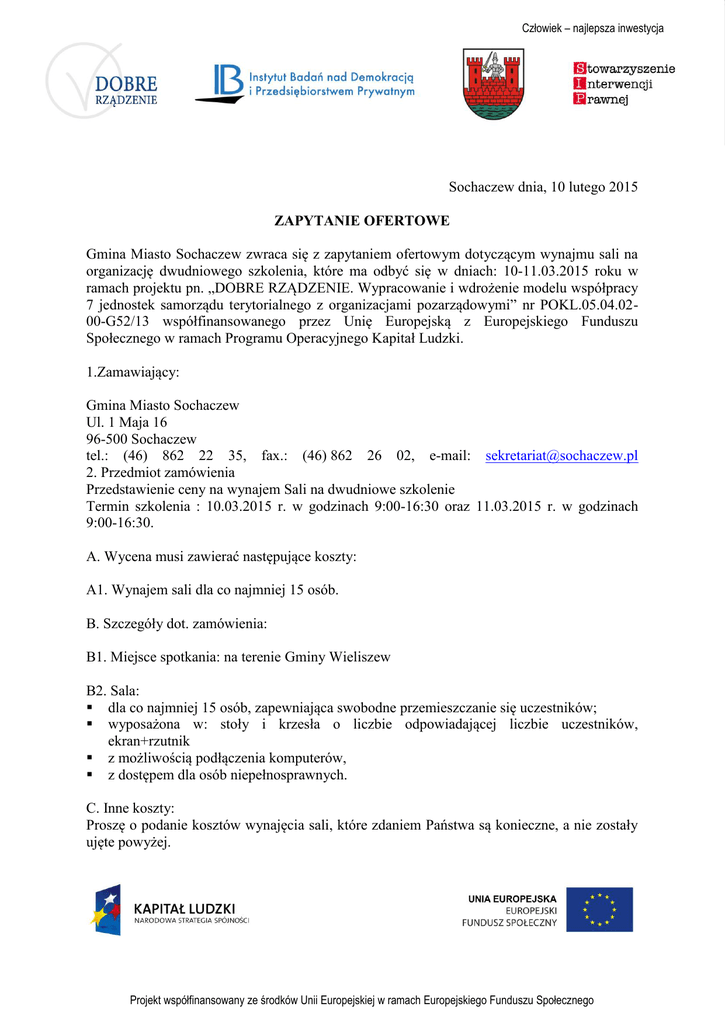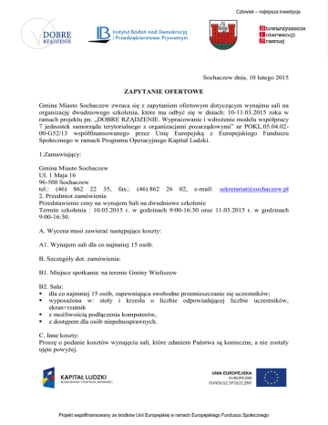 Człowiek – najlepsza inwestycja Sochaczew dnia, 10 lutego 2015 ZAPYTANIE OFERTOWE Gmina Miasto Sochaczew zwraca się z zapytaniem ofertowym dotyczącym wynajmu sali na organizację dwudniowego szkolenia, które ma odbyć się w dniach: 10-11.03.2015 roku w ramach projektu pn. „DOBRE RZĄDZENIE. Wypracowanie i wdrożenie modelu współpracy 7 jednostek samorządu terytorialnego z organizacjami pozarządowymi” nr POKL.05.04.0200-G52/13 współfinansowanego przez Unię Europejską z Europejskiego Funduszu Społecznego w ramach Programu Operacyjnego Kapitał Ludzki. 1.Zamawiający: Gmina Miasto Sochaczew Ul. 1 Maja 16 96-500 Sochaczew tel.: (46) 862 22 35, fax.: (46) 862 26 02, e-mail: [email protected] 2. Przedmiot zamówienia Przedstawienie ceny na wynajem Sali na dwudniowe szkolenie Termin szkolenia : 10.03.2015 r. w godzinach 9:00-16:30 oraz 11.03.2015 r. w godzinach 9:00-16:30. A. Wycena musi zawierać następujące koszty: A1. Wynajem sali dla co najmniej 15 osób. B. Szczegóły dot. zamówienia: B1. Miejsce spotkania: na terenie Gminy Wieliszew B2. Sala: dla co najmniej 15 osób, zapewniająca swobodne przemieszczanie się uczestników; wyposażona w: stoły i krzesła o liczbie odpowiadającej liczbie uczestników, ekran+rzutnik z możliwością podłączenia komputerów, z dostępem dla osób niepełnosprawnych. C. Inne koszty: Proszę o podanie kosztów wynajęcia sali, które zdaniem Państwa są konieczne, a nie zostały ujęte powyżej. Projekt współfinansowany ze środków Unii Europejskiej w ramach Europejskiego Funduszu Społecznego 3. Koszt wykonania usługi: Koszty wynajęcia Sali przedstawione w FORMULARZU OFERTOWYM muszą być wykazane i muszą zawierać wszystkie elementy ujęte w niniejszej specyfikacji z uwzględnieniem punktu: Inne Koszty. 4. Cel wyceny: Wybór oferty na wynajem Sali na organizację dwudniowego szkolenia, które ma odbyć się w dniach: 10-11.03.2015 r. w godzinach 9:00 - 16:30 w ramach projektu pn. „DOBRE RZĄDZENIE. Wypracowanie i wdrożenie modelu współpracy 7 jednostek samorządu terytorialnego z organizacjami pozarządowymi”. 5. Termin realizacji: 10.03.2015 r. w godzinach 9:00-16:30 oraz 11.03.2015 r. w godzinach 9:00-16:30. Wymagany: 6. Sposób przygotowania oferty: Oferty prosimy przygotować w załączonych FORMULARZACH OFERTOWYCH Z uwzględnieniem warunków oferty, zawartych w punktach: Przedmiot zamówienia, Koszt wykonania usługi, oraz Termin realizacji oferty. 7. Kryterium wyboru oferty: A. Zachowanie wszystkich warunków określonych w punktach: Przedmiot zamówienia, Koszt wykonania usługi oraz Termin realizacji oferty. B. Miejsce spotkania – na terenie Gminy Wieliszew C. Cena / miejsce. 8. Miejsce i termin złożenia oferty: Oferty prosimy przesyłać w terminie do dnia 24/02/2015 r., do godz. 15:00 mailowo, faksem lub osobiście na adres : Gmina Miasto Sochaczew Ul. 1 Maja 16 96-500 Sochaczew tel.: (46) 862 22 35, fax.: (46) 862 26 02, e-mail: [email protected] Projekt współfinansowany ze środków Unii Europejskiej w ramach Europejskiego Funduszu Społecznego 9. Zapytania o przedmiot zamówienia: Dodatkowe Informacje dot. przedmiotu zamówienia, tel. /046/ 862 22 35 wew.440, e-mail: [email protected] 10. Załączniki: Formularz ofertowy Pieczęć firmowa oferenta Miejscowość i data Projekt współfinansowany ze środków Unii Europejskiej w ramach Europejskiego Funduszu Społecznego FORMULARZ OFERTOWY 1. Zamawiający: Gmina Miasto Sochaczew Ul. 1 Maja 16 96-500 Sochaczew tel.: (46) 862 22 35, fax.: (46) 862 26 02, e-mail: [email protected] 2. Oferent: (proszę wpisać dane - nazwa oferenta, adres, tel. i faks, NIP: Nazwa: Adres: Tel.: Faks: E-mail: NIP: 3. Wycena zamówienia: W odpowiedzi na zapytanie ofertowe z dnia 10 lutego 2015 r. w sprawie wynajmu Sali na organizację dwudniowego szkolenia, które ma odbyć się w dniach: 10-11.03.2015 r. w godzinach 9:00 – 16:30 w ramach projektu pn. „DOBRE RZĄDZENIE. Wypracowanie i wdrożenie modelu współpracy 7 jednostek samorządu terytorialnego z organizacjami pozarządowymi”, zgodnie z warunkami podanymi w punktach Przedmiot zamówienia, Koszt wykonania usługi oraz Termin realizacji oferty zobowiązuję się wykonać przedmiotowe zadanie za następującą cenę: Spotkanie w dniach: 10.03.2015 w godzinach 9:00-16:30 oraz 11.03.2015 r. w godzinach 9:00-16:30. Miejsce realizacji spotkania doradczego (nazwa obiektu, dokładny adres, adres strony internetowej): Projekt współfinansowany ze środków Unii Europejskiej w ramach Europejskiego Funduszu Społecznego Lp. Elementy oferty II IV Sala dla co najmniej 15 os. Inne (jeżeli są wliczone w cenę Sali, proszę wpisać: 0 zł): Wynajem mikrofonu Wynajem projektora i kompatybilnego z nim komputera Wynajem ekranu projekcyjnego Inne (jakie?) Razem: Kwota brutto w PLN Forma płatności: Koszty brutto w Kwota w PLN 4. Termin realizacji zamówienia: zgodny z terminami szkolenia. 5.Załączniki: Koszty organizacji spotkania, które nie zostały ujęte powyżej. miejscowość i data /podpis i imienna pieczęć oferenta lub upoważnionego przedstawiciela oferenta/ Projekt współfinansowany ze środków Unii Europejskiej w ramach Europejskiego Funduszu Społecznego PLN Umowa o najem sali Zawarta dnia ………………………….2015 r. w Sochaczewie pomiędzy: Gmina Miasto Sochaczew, ul. 1-go Maja 16, 96-500 Sochaczew, NIP: 837-16-91-451 reprezentowanym przez Piotra Osieckiego – Burmistrza Miasta Sochaczew, zwanym dalej Najemcą, a ……………………………………………………. NIP: ………………………….. reprezentowanym przez …………………………………, zwanym dalej Wynajmującym. § 1. Na podstawie niniejszej umowy Wynajmujący zobowiązuje się oddać Najemcy w dniach 10-11.03.2015 w godz. od 09.00 do 16.30 salę konferencyjną mieszczącą się w ……………………………………………………. §2. Przedmiot najmu objęty niniejszą umową wykorzystany będz