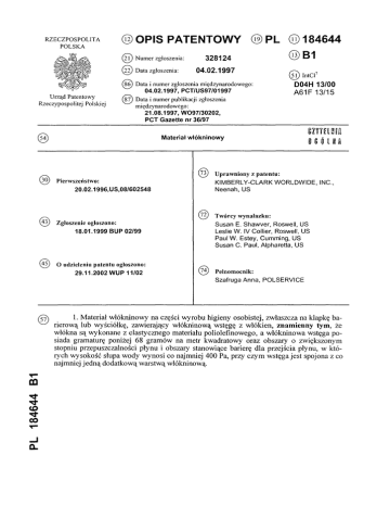 RZECZPO SPO LITA PO LSK A (12) OPIS PATENTOWY (19)PL (11)184644 (21) N um er zgłoszenia: (2 2 ) D ata zgłoszenia: 328124 04.02.1997 (86) D ata i num er zgłoszenia m iędzynarodow ego: U rząd Patentow y Rzeczypospolitej Polskiej 04.02.1997, PCT/US97/01997 (87) D ata i num er publikacji zgłoszenia m iędzynarodow ego: (13) B1 (51) IntCl7 D04H 13/00 A 61F 1 3 /15 21.08.1997, W O97/30202, PCT Gazette nr 36/97 (54) ( 30) Materiał włókninowy Pierwszeństwo: (73) KIMBERLY-CLARK WORLDWIDE, INC. Neenah, US 20.02.1996,US,08/602548 (43) Zgłoszenie ogłoszono: (72) O udzieleniu patentu ogłoszono: 29.11.2002 WUP 11/02 (5 7 ) Twórcy wynalazku: Susan E. Shawver, Roswell, US Leslie W. IV Collier, Roswell, US Paul W. Estey, Cumming, US Susan C. Paul, Alpharetta, US 18.01.1999 BUP 02/99 (45) Uprawniony z patentu: ( 74) Pełnomocnik: Szafruga Anna, POLSERVICE 1. M ateriał włókninow y na części wyrobu higieny osobistej, zw łaszcza na klapkę barierow ą lub w yściółkę, zawierający w łókninow ą w stęgę z w łókien, znam ienny tym, że w łókna są wykonane z elastycznego materiału poliolefinowego, a w łókninow a w stęga posiada gramaturę poniżej 6 8 gram ów na m etr kwadratowy oraz obszary o zw iększonym stopniu przepuszczalności płynu i obszary stanowiące barierę dla przejścia płynu, w których w ysokość słupa wody w ynosi co najmniej 400 Pa, przy czym w stęga je st spojona z co najmniej je d n ą dodatkow ą w arstw ą włókninową. Materiał włókninowy Zastrzeżenia patentowe 1. M ateriał włókninowy na części wyrobu higieny osobistej, zw łaszcza na klapkę bariero w ą lub wyściółkę, zawierający w łókninow ą wstęgę z w łókien, znam ienny tym, że w łókna są wykonane z elastycznego m ateriału poliolefinowego, a w łókninow a w stęga posiada gram aturę poniżej 6 8 gram ów na m etr kwadratowy oraz obszary o zw iększonym stopniu przepuszczalności płynu i obszary stanowiące barierę dla przejścia płynu, w których w ysokość słupa wody wynosi co najm niej 400 Pa, przy czym w stęga je st spojona z co najmniej je d n ą dodatkow ą w arstw ą włókninową. 2. M ateriał w edług zastrz. 1, znam ienny tym, że w ym ieniona co najmniej jedna dodatkow a warstwa w łókninow a m a pomarszczenia. 3. M ateriał według zastrz. 1 albo 2, znam ienny tym, że w ym ieniona dodatkowa w arstw a włókninowa składa się z m ateriału typu spunbond, który m a pom arszczenia, przy czym m ateriał typu spunbond je st spojony z w łókninow ą wstęgą. 4. M ateriał w edług zastrz. 1, znam ienny tym, że w ym ieniona dodatkow a warstwa w łókninow a składa się z m ateriału typu spunbond, który je st spojony z w łókninow ą w stęg ą przy czym w łókninow a w stęga m a pomarszczenia. 5. M ateriał w edług zastrz. 1, znam ienny tym, że średnia średnica w łókien jest m niejsza niż 1 0 mikrometrów. 6 . Materiał w edług zastrz. 1, znam ienny tym, że w łókninow a w stęga zawiera otwory w pewnych obszarach. 7. M ateriał w edług zastrz. 1, znam ienny tym, że w łókninow a w stęga w pew nych obszarach je st pokryta środkiem zw ilżającym miejscowo. * * * Przedm iotem w ynalazku je st materiał włókninowy do zastosow ania w różnych w yrobach higieny osobistej, takich ja k pieluchy, spodenki sportowe, w yroby dla osób dorosłych nie panujących nad w ydalaniem , dam skich wyrobów higienicznych oraz wszelkich innych typów wyrobów stosowanych do wchłaniania płynów ustrojowych. W szczególności, wyroby higieny osobistej zaw ierają na ogół klapki barierowe, które służą do uniemożliwiania płynom ustrojowym ucieczki z w yrobu i zabrudzenia odzieży lub pościeli użytkownika. W yroby higieny osobistej również zaw ierają zwykle wyściółki przylegające do skóry użytkownika i służące do przemieszczania płynów od skóry do warstw chłonnych wyrobu. W spomniane klapki barierowe i wyściółki szczególnie odpowiednim zastosowaniem niniejszego wynalazku. W arunkiem praw idłow ego funkcjonowania takich w yrobów pow strzym ujących w yciek płynów są odpowiednie w łaściw ości barierowe m ateriału um ożliw iające m u realizację jego głównego zadania, jakim je st m agazynow anie płynów, ale rów nież konieczność zachowania przewietrzalności ze w zględu na w ygodę skóry. M ateriał taki idealnie pow inien być elastyczny ze względu na dopasow anie się do ciała użytkownika i odzyskiw anie swojego kształtu po rozciągnięciu w yw ołanym rucham i użytkownika, a jednocześnie pow inien cały czas realizować swoje podstawowe zadanie jako element barierowy. W przeszłości klapy barierowe w ytwarzano z oddzielnych m ateriałów zapewniających różnorodne potrzebne fu nkcje. Przykładowo, łączono elastyczne nitki z materiałami nieelastycznym i, uzyskując w ym aganą elastyczność. Tego typu próby rozw iązania problem u przewietrzalności i barierowości za pom ocą elementów elastycznych cieszyły się pewnym powodzeniem, ale nadał poszukuje się pojedynczego m ateriału cechującego się barierowością i przew ietrzalnością, a jednocześnie ela- 184 644 3 stycznością. Ponadto zaleca się, żeby materiał miał właściwości tego typu bez żadnej dodatkowej obróbki. W razie stosowania takiego m ateriału na wy ściółkę, m usi on być odczuw any przez skórę jako w ygodny, a także musi szybko przepuszczać przez siebie w szelkie ciecze do następnej w arstw y chłonnej (lub warstw). Poniew aż taki materiał je st m ateriałem barierow ym , korzystne byłoby poddanie go obróbce w celu zwiększenia jego zwilżalności albo też stosowanie na w yściółki m ateriałów o naturalnej hydrofilowości. Znane są takie techniki obróbki jak środki zwilżające. W stosow anym tu znaczeniu, term in „materiał lub w stęga w łókninow a” oznacza wstęgę o budow ie w postaci pojedynczych w łókien lub nici, które są poprzeplatane, ale nie w sposób dający s