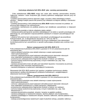 Instrukcja układania folii IZOL-BUD jako warstwy paroszczelnej Folie polietylenowe IZOL-BUD mogą być użyte jako warstwy paroszczelne stropów, balkonów, tarasów i ścian budynków gdy zostaną spełnione następujące warunki przy ich układaniu ; • powłoka paroszczelna powinna stanowić ciągły i szczelny układ oddzielający kolejne warstwy – dlatego kolejne pasma folii powinny być układane na klejone zakłady o szerokości min.10 cm ; • powłokę paroszczelną z folii polietylenowej IZOL-BUD można mocować do podłoża za pomocą taśm klejących lub mechanicznie ; • mocowania mechaniczne do podłoża powinny być dodatkowo uszczelniane w miejscach zamocowań ; • uszkodzenia powstałe w trakcie układania należy zakleić ; • niedopuszczalne jest łączenie wyrobów oddziałujących na siebie w sposób powodujący ich destrukcję (np. pod wpływem rozpuszczalników zawartych w masach uszczelniających lub klejących) ; • ułożenie folii powinny być wykonywane w warunkach umożliwiających jej prawidłowe funkcjonowanie, tzn. w temperaturze otoczenia od -15ºC do +60 ºC ; • w miejscach połączenia folii z przewodami lub innymi instalacjami oraz elementami konstrukcji powinny być uszczelnione w sposób wykluczający przepływ pary wodnej w tym rejonie ; Zakres i przeznaczenie folii IZOL-BUD 0,15 Folia polietylenowa budowlana IZOL-BUD o grubości 0,15 mm przeznaczona jest do stosowania jako : - osłona elewacji budynków oraz stolarki okiennej w czasie wykonywania robót wykończeniowych ; - ochrona i zabezpieczenie przed wpływami atmosferycznymi stanowisk roboczych oraz materiałów budowlanych w czasie transportu i składowania ; - prowizoryczne zabezpieczenie fragmentów budowli w trakcie i po realizacji ; - ochrona izolacji wodochronnej wykonanej z innych materiałów (np. pap, mas bitumicznych i ) ; - warstwa paroszczelna ścian ale tylko pod warunkiem łączenia i mocowania za pomocą taśm klejących (bez mocowań mechanicznych) ; - warstwa poślizgowa w systemach osłaniających fundamenty. Stosowanie folii IZOL-BUD powinno być zgodne z projektem technicznym obiektu opracowanym według obowiązujących przepisów budowlanych, uwzględniającym właściwości techniczne folii. Zakres i przeznaczenie folii IZOL-BUD 0,2 Folia polietylenowa budowlana IZOL-BUD o grubości 0,2 mm przeznaczona jest do stosowania jako : - osłona elewacji budynków oraz stolarki okiennej w czasie wykonywania robót wykończeniowych ; - ochrona i zabezpieczenie przed wpływami atmosferycznymi stanowisk roboczych oraz materiałów budowlanych w czasie transportu i składowania ; - prowizoryczne zabezpieczenie fragmentów budowli w trakcie i po realizacji ; - ochrona izolacji wodochronnej wykonanej z innych materiałów (np. pap, mas bitumicznych i ) ; - warstwa paroszczelna posadzek, stropów i tarasów na gładkim podłożu ; - warstwa poślizgowa w nawierzchni tarasów, dachów płaskich oraz fundamentów ; - warstwa rozdzielająca w nawierzchni stropów, tarasów, balkonów, dachów płaskich oraz fundamentów ; - izolacja przeciwwilgociowa naziemnych części budynków (stropy, posadzki, balkony) ; Stosowanie folii IZOL-BUD powinno być zgodne z projektem technicznym obiektu opracowanym według obowiązujących przepisów budowlanych, uwzględniającym właściwości techniczne folii. Zakres i przeznaczenie folii IZOL-BUD 0,3 Folia polietylenowa budowlana IZOL-BUD o grubości 0,3 mm przeznaczona jest do stosowania jako : - osłona elewacji budynków oraz stolarki okiennej w czasie wykonywania robót wykończeniowych ; - ochrona i zabezpieczenie przed wpływami atmosferycznymi stanowisk roboczych oraz materiałów budowlanych w czasie transportu i składowania ; - prowizoryczne zabezpieczenie fragmentów budowli w trakcie i po realizacji ; - ochrona izolacji wodochronnej wykonanej z innych materiałów (np. pap, mas bitumicznych i ) ; - warstwa poślizgowa w nawierzchni tarasów, dachów płaskich oraz fundamentów ; - warstwa rozdzielająca w nawierzchni stropów, tarasów, balkonów, dachów płaskich oraz fundamentów ; - warstwa paroszczelna posadzek, stropów i tarasów (ścian) ; - izolacja przeciwwilgociowa naziemnych części budynków (stropy, posadzki, balkony) ; - izolacja przeciwwilgociowa podziemnych części budowli ; - izolacja przeciwwilgociowa pozioma fundamentów. Stosowanie folii IZOL-BUD powinno być zgodne z projektem technicznym obiektu opracowanym według obowiązujących przepisów budowlanych, uwzględniającym właściwości techniczne folii. Uwagi dotyczące stosowania folii IZOL-BUD 1. Transport i przechowywanie folii powinno odbywać się w oryginalnym opakowaniu, w sposób zapewniający niezmienność jej właściwości. 2. Prosimy układających IZOL-BUD o nie palenie papierosów w trakcie jej układania. Spadający żar z papierosów może wypalać w folii małe otwory trudne do zauważenia. 3. Uszkodzenia folii powstałe w trakcie jej układania należy niezwłocznie naprawić stosując specjalistyczne produkty (butylowe taśmy klejące lub łaty i specjalistyczne kleje). 4. Montaż wyrobu powinien nastąpić z najwyższą starannością oraz zgodnie z zaleceniami projektanta i producenta. 5. Zakrycie folii następnymi warstwami powinno nastąpić możliwie najszybciej po jej ułożeniu. Instrukcje zawarte na tym opakowaniu podają najważniejsze, podstawowe zalecenia i nie zawierają informacji dotyczących wszystkich możliwych rozwiązań stosowanych w budownictwie. Istnieją również sytuacje, w których mogą być zastosowane inne rozwiązania niż opisane w instrukcjach.