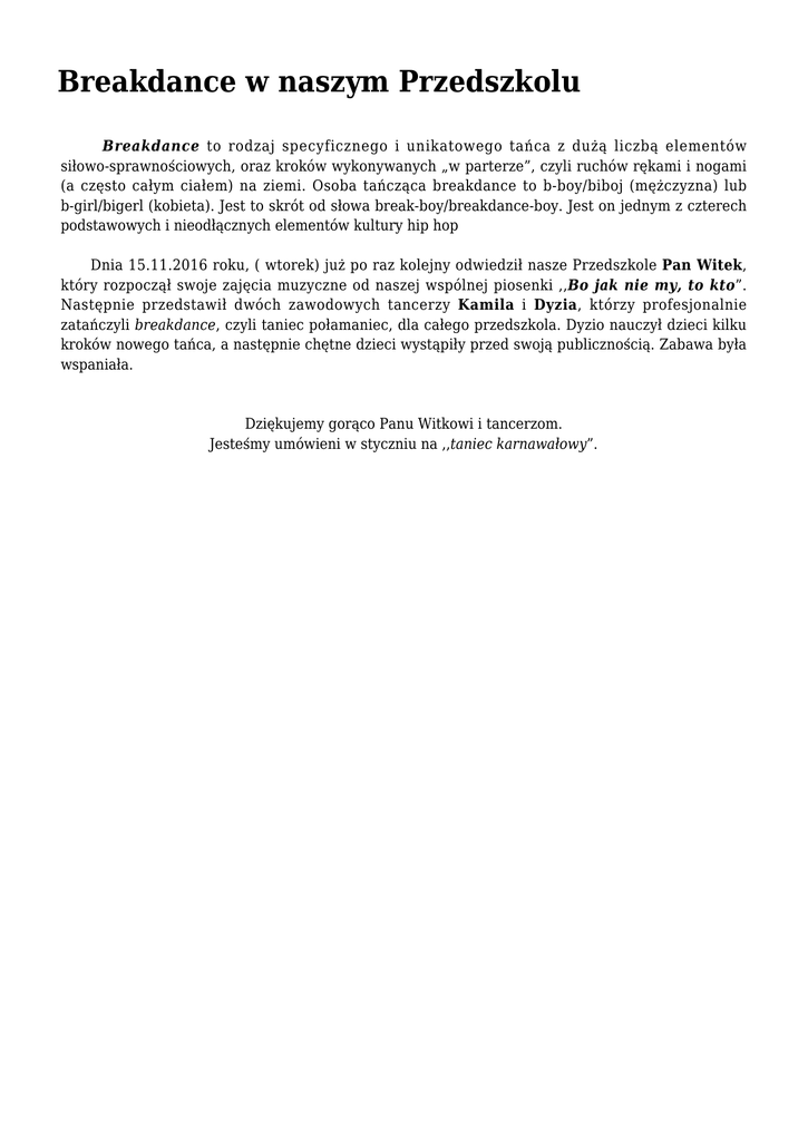Breakdance w naszym Przedszkolu Breakdance to rodzaj specyficznego i unikatowego tańca z dużą liczbą elementów siłowo-sprawnościowych, oraz kroków wykonywanych „w parterze”, czyli ruchów rękami i nogami (a często całym ciałem) na ziemi. Osoba tańcząca breakdance to b-boy/biboj (mężczyzna) lub b-girl/bigerl (kobieta). Jest to skrót od słowa break-boy/breakdance-boy. Jest on jednym z czterech podstawowych i nieodłącznych elementów kultury hip hop Dnia 15.11.2016 roku, ( wtorek) już po raz kolejny odwiedził nasze Przedszkole Pan Witek, który rozpoczął swoje zajęcia muzyczne od naszej wspólnej piosenki ,,Bo jak nie my, to kto”. Następnie przedstawił dwóch zawodowych tancerzy Kamila i Dyzia, którzy profesjonalnie zatańczyli breakdance, czyli taniec połamaniec, dla całego przedszkola. Dyzio nauczył dzieci kilku kroków nowego tańca, a następnie chętne dzieci wystąpiły przed swoją publicznością. Zabawa była wspaniała. Dziękujemy gorąco Panu Witkowi i tancerzom. Jesteśmy umówieni w styczniu na ,,taniec karnawałowy”.