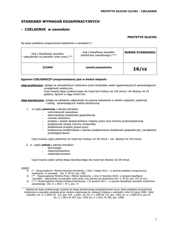 PROTETYK SŁUCHU 321401 - CZELADNIK STANDARD WYMAGAŃ EGZAMINACYJNYCH - CZELADNIK w zawodzie: PROTETYK SŁUCHU Na bazie podstawy programowej kształcenia w zawodach (* Kod z klasyfikacji zawodów i specjalności na potrzeby rynku pracy (** 322904 Kod z klasyfikacji zawodów szkolnictwa zawodowego (*** NUMER STANDARDU zawód pozaszkolny 16/cz Egzamin CZELADNICZY przeprowadzany jest w dwóch etapach: etap praktyczny: polega na samodzielnym wykonaniu przez kandydata zadań egzaminacyjnych sprawdzających umiejętności praktyczne. Czas trwania etapu praktycznego nie może być krótszy niż 120 minut i nie dłuższy niż 24 godziny, łącznie w ciągu trzech dni. etap teoretyczny: polega na udzieleniu odpowiedzi na pytania zestawione w dwóch częściach; pisemnej i ustnej, sprawdzających wiedzę teoretyczną: 1. w części pisemnej z zakresu tematów: rachunkowość zawodowa dokumentacja działalności gospodarczej rysunek zawodowy przepisy i zasady bezpieczeństwa i higieny pracy oraz ochrony przeciwpożarowej podstawowe zasady ochrony środowiska podstawowe przepisy prawa pracy podstawowa problematyka z zakresu podejmowania działalności gospodarczej i zarządzania przedsiębiorstwem Czas trwania części pisemnej nie może być krótszy niż 45 minut i nie dłuższy niż 210 minut. 2. w części ustnej z zakresu tematów: technologia maszynoznawstwo materiałoznawstwo Czas trwania części ustnej etapu teoretycznego nie może być dłuższy niż 30 minut. UWAGI 1) 2) 3) (* - Rozporządzenie Ministra Edukacji Narodowej z dnia 7 lutego 2012 r. w sprawie podstawy programowej kształcenia w zawodach (Dz. U. Nr 62, poz. 439) (** - Rozporządzenie Ministra Pracy i Polityki Społecznej z dnia 27 kwietnia 2010r. w sprawie klasyfikacji zawodów i specjalności na potrzeby rynku pracy oraz zakresu jej stosowania (Dz. U. Nr 82, poz. 537 ze zm.) (***- Rozporządzenie Ministra Edukacji Narodowej z 23 grudnia 2011 r. w sprawie klasyfikacji zawodów szkolnictwa zawodowego (Dz. U. z 2012 r. Nr 2, poz. 7) _________________________________________________________________________________________ Zadania do etapu praktycznego i pytania do etapu teoretycznego przygotowywane są na bazie podstawy programowej kształcenia w zawodzie ustalonej przez ministra właściwego ds. edukacji (Ustawa o rzemiośle z dnia 22 marca 1989, tekst jednolity: Dz. U. Z 2002r Nr 112, poz. 979, z późn. zm. Dz. U. z 2003 Nr 137, poz. 1304, Dz. U. z 2009 Nr 6, poz.33, Dz. U. z 2011 Nr 207, poz. 1230, Dz. U. z 2011 Nr 205, poz. 1206) 1 PROTETYK SŁUCHU 321401 - CZELADNIK W efekcie pozytywnie zdanego egzaminu CZELADNICZEGO izba rzemieślnicza wystawia ŚWIADECTWO CZELADNICZE, które jest formalnym potwierdzeniem kwalifikacji zawodowych, uzyskanych w różnych ścieżkach edukacji oraz w procesie pracy. 1. PROFIL UMIEJĘTNOŚCI CZELADNIKA ZWIĄZANY Z ZAWODEM Czeladnik (posiadacz świadectwa czeladniczego) w zawodzie protetyk słuchu potrafi: – posługiwać się dokumentacją techniczną i instrukcją serwisową w zakresie wykonywanych zadań zawodowych, – rozpoznawać rodzaje aparatów słuchowych oraz określać ich parametry, – rozróżniać rodzaje mikrofonów, słuchawek i urządzenia do wspomagania słyszenia, – wykrywać wady i uszkodzenia aparatów słuchowych i ich wpływ na transmitowany dźwięk, – wykonywać wywiad audiologiczny, – wykonać wywiad o przebytych chorobach, zażywanych medykamentach i oczekiwaniach związanych z funkcjonowaniem aparatu słuchowego, – określać specyfikę badania słuchu u dzieci, – wykonać badanie słuchu przy użyciu audiometrów, – dobierać aparat słuchowy do potrzeb klienta, – wykonać wkładkę uszną, – naprawiać aparaty słuchowe w zakresie możliwości technicznych punktu protetycznego, – oceniać jakość wykonania usługi, – sporządzać kalkulację usługi, – przestrzegać przepisów bezpieczeństwa i higieny pracy, ochrony przeciwpożarowej oraz ochrony środowiska podczas wykonywania zadań zawodowych, – udzielać pierwszej pomocy poszkodowanym w wypadkach przy pracy. Czeladnik w zawodzie protetyk słuchu jest przygotowany do wykonywania następujących zadań zawodowych: 1) wykonywania badań słuchu; 2) dobierania i dopasowywania aparatów słuchowych i urządzeń wspomagających słyszenie; 3) sprawowania opieki audioprotetycznej nad osobą niedosłyszącą po doborze aparatów słuchowych. 2.WIEDZA I UMIEJĘTNOŚCI ZWIĄZANE Z WYKONYWANIEM WYŻEJ WYMIENIONYCH ZADAŃ ZAWODOWYCH Z ZAKRESU: 2.1. Bezpieczeństwo i higiena pracy Czeladnik: 1) rozróżnia pojęcia związane z bezpieczeństwem i higieną pracy, ochroną przeciwpożarową, ochroną środowiska i ergonomią; 2) rozróżnia zadania i uprawnienia instytucji oraz służb działających w zakresie ochrony pracy i ochrony środowiska w Polsce; 3) określa prawa i obowiązki pracownika oraz pracodawcy w zakresie bezpieczeństwa i higieny pracy; 4) przewiduje zagrożenia dla zdrowia i życia człowieka oraz mienia i środowiska związane z wykonywaniem zadań zawodowych; 5) organizuje stanowisko pracy zgodnie z obowiązującymi wymaganiami ergonomii, przepisami bezpieczeństwa i higieny pracy, ochrony przeciwpożarowej i ochrony środowiska; 6) stosuje środki ochrony indywidualnej i zbiorowej podczas wykonywania zadań zawodowych; 7) przestrzega zasad bezpieczeństwa i higieny pracy oraz stosuje przepisy prawa dotyczące ochrony przeciwpożarowej i ochrony środowiska; 8) udziela pierwszej pomocy poszkodowanym w wypadkach przy pracy oraz w stanach zagrożenia zdrowia i życia. 2.2.Podejmowanie i prowadzenie działalności gospodarczej Czeladnik: 1) stosuje pojęcia z obszaru funkcjonowania gospodarki rynkowej; 2) stosuje przepisy prawa pracy, przepisy prawa dotyczące ochrony danych osobowych oraz przepisy prawa podatkowego i prawa autorskiego; 3) stosuje przepisy prawa dotyczące prowadzenia działalności gospodarczej; 4) rozróżnia przedsiębiorstwa i instytucje występujące w bran