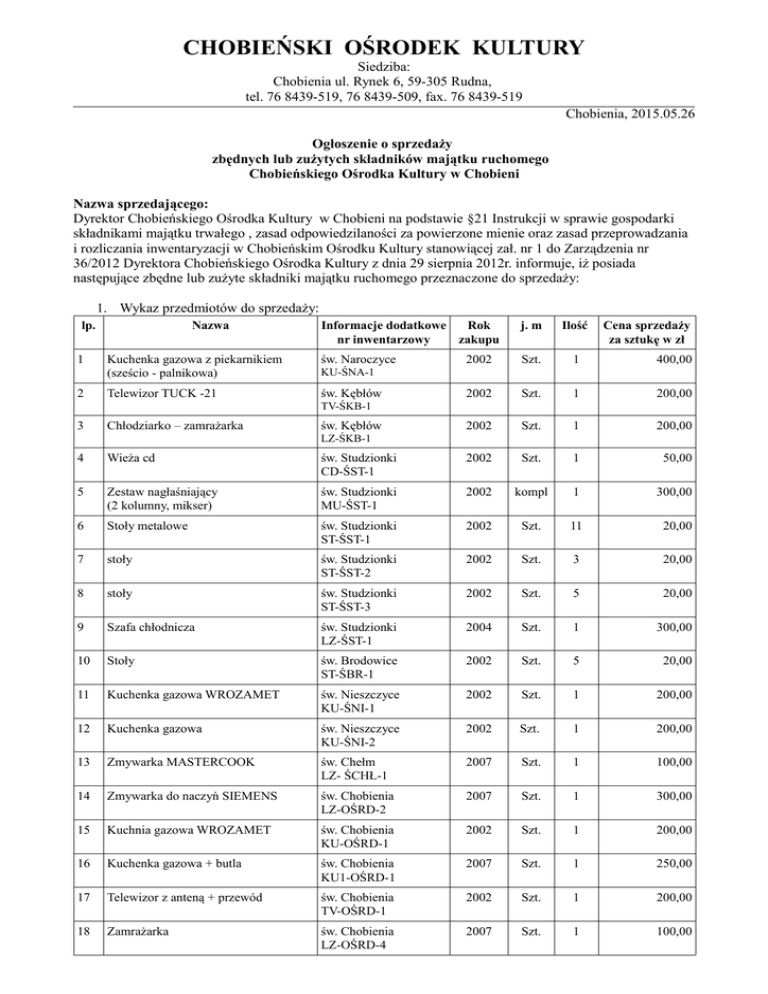 CHOBIEŃSKI OŚRODEK KULTURY Siedziba: Chobienia ul. Rynek 6, 59-305 Rudna, tel. 76 8439-519, 76 8439-509, fax. 76 8439-519 Chobienia, 2015.05.26 Ogłoszenie o sprzedaży zbędnych lub zużytych składników majątku ruchomego Chobieńskiego Ośrodka Kultury w Chobieni Nazwa sprzedającego: Dyrektor Chobieńskiego Ośrodka Kultury w Chobieni na podstawie §21 Instrukcji w sprawie gospodarki składnikami majątku trwałego , zasad odpowiedzilaności za powierzone mienie oraz zasad przeprowadzania i rozliczania inwentaryzacji w Chobieńskim Ośrodku Kultury stanowiącej zał. nr 1 do Zarządzenia nr 36/2012 Dyrektora Chobieńskiego Ośrodka Kultury z dnia 29 sierpnia 2012r. informuje, iż posiada następujące zbędne lub zużyte składniki majątku ruchomego przeznaczone do sprzedaży: 1. Wykaz przedmiotów do sprzedaży: lp. 1 2 Nazwa Informacje dodatkowe Rok nr inwentarzowy zakupu j. m Ilość Cena sprzedaży za sztukę w zł Kuchenka gazowa z piekarnikiem (sześcio - palnikowa) św. Naroczyce 2002 Szt. 1 400,00 Telewizor TUCK -21 św. Kębłów 2002 Szt. 1 200,00 2002 Szt. 1 200,00 KU-ŚNA-1 TV-ŚKB-1 3 Chłodziarko – zamrażarka św. Kębłów LZ-ŚKB-1 4 Wieża cd św. Studzionki CD-ŚST-1 2002 Szt. 1 50,00 5 Zestaw nagłaśniający (2 kolumny, mikser) św. Studzionki MU-ŚST-1 2002 kompl 1 300,00 6 Stoły metalowe św. Studzionki ST-ŚST-1 2002 Szt. 11 20,00 7 stoły św. Studzionki ST-ŚST-2 2002 Szt. 3 20,00 8 stoły św. Studzionki ST-ŚST-3 2002 Szt. 5 20,00 9 Szafa chłodnicza św. Studzionki LZ-ŚST-1 2004 Szt. 1 300,00 10 Stoły św. Brodowice ST-ŚBR-1 2002 Szt. 5 20,00 11 Kuchenka gazowa WROZAMET św. Nieszczyce KU-ŚNI-1 2002 Szt. 1 200,00 12 Kuchenka gazowa św. Nieszczyce KU-ŚNI-2 2002 Szt. 1 200,00 13 Zmywarka MASTERCOOK św. Chełm LZ- ŚCHŁ-1 2007 Szt. 1 100,00 14 Zmywarka do naczyń SIEMENS św. Chobienia LZ-OŚRD-2 2007 Szt. 1 300,00 15 Kuchnia gazowa WROZAMET św. Chobienia KU-OŚRD-1 2002 Szt. 1 200,00 16 Kuchenka gazowa + butla św. Chobienia KU1-OŚRD-1 2007 Szt. 1 250,00 17 Telewizor z anteną + przewód św. Chobienia TV-OŚRD-1 2002 Szt. 1 200,00 18 Zamrażarka św. Chobienia LZ-OŚRD-4 2007 Szt. 1 100,00 2. Osoby zainteresowane zakupem przedmiotu proszone są o złożenie oferty na formularzu stanowiącym zał. nr 1 do ogłoszenia w terminie do dnia 03.06.2015r. do godz. 10:00. Formularz ofertowy można pobrać w siedzibie sprzedającego, tj. Chobieński Ośrodek Kultury, Chobienia ul. Rynek 6, 59-305 Rudna lub ze strony internetowej: www.chok-chobienia.pl 3. Oferta powinna zawierać: 1) Nazwisko i imię lub nazwę Firmy oferenta z podaniem: dla osób fizycznych: PESEL, NIP, Nr dowodu osobistego, dla Firm: NIP, REGON, Nr KRS/ aktualny wpis do ewidencji gospodarczej. ( w załączeniu kserokopie za zgodność z oryginałem). 2) Adres zamieszkania lub siedziby Firmy oferenta. 3) Oferowaną cenę jednostkową za określony materiał oraz ilość nabycia . 4) Oświadczenie oferenta, że zapoznał się ze stanem przedmiotu przeznaczonego do sprzedaży. 5) Oświadczenie oferenta o związaniu złożoną ofertą do dnia przeniesienia własności przedmiotu. 6) Podpis oferenta. 4. Każdy oferent może złożyć tylko jedną ofertę. Sprzedający dopuszcza składanie ofert wariantowych (cząstkowych). 5. Jeżeli dwóch lub więcej oferentów zaoferuje za przedmiot taką samą cenę Chobieński Ośrodek Kultury przeprowadzi dodatkową aukcję między tymi osobami. 6. Oferty należy składać w zaklejonych kopertach z napisem: „Ogłoszenie o sprzedaży zbędnych lub zużytych składników majątku ruchomego Chobieńskiego Ośrodka Kultury w Chobieni”. 7. Nabywca jest zobowiązany zapłacić cenę nabycia w dniu odbioru zakupionego materiału. 8. Przedmiot sprzedaży będzie można obejrzeć od dnia ukazania się ogłoszenia do dnia 03.06.2015 r. do godz. 9.30 (od poniedziałku do piątku po wcześniejszym telefonicznym uzgodnieniu terminu). Szczegółowe informacje można uzyskać pod numerami telefonu CHOK. 8. Oferta złożona po terminie podlega zwrotowi bez jej otwarcia. 9. Pozostałe informacje: 1) Otwarcie ofert nastąpi w dniu 03.06 .2015 o godz. 10.00, w siedzibie zamawiającego Chobienia, ul. Rynek 6 59-305 Rudna, pok.51. 2) Odbiór zakupionego materiału nastąpi na koszt nabywcy. 3) Sprzedający zastrzega, że nie bierze odpowiedzialności za wady ukryte w przedmiocie przeznaczonym do sprzedaży. 4) Sprzedający nie ponosi odpowiedzialności z tytułu rękojmi za wady sprzedanych towarów. 5) Zakupiony materiał nie podlega reklamacji. 6) W sprawach nieuregulowanych stosuje się przepisy kodeksu cywilnego (Dz.U. 1964 nr 16 poz. 93). Dyrektor Chobieńskiego Ośrodka Kultury mgr inż. Katarzyna Przeworska CHOBIEŃSKI OŚRODEK KULTURY Siedziba: Chobienia ul. Rynek 6, 59-305 Rudna, tel. 76 8439-519, 76 8439-509, fax. 76 8439-519 FORMULARZ OFERTOWY na sprzedaż zbędnych lub zużytych składników majątku ruchomego Chobieńskiego Ośrodka Kultury w Chobieni 1. Nazwisko i imię lub nazwę Firmy oferenta z podaniem: dla osób fizycznych: PESEL, NIP, Nr dowodu osobistego, dla Firm: NIP, REGON, Nr KRS/ aktualny wpis do ewidencji gospodarczej ( w załączeniu kserokopie za zgodność z oryginałem) .......................................................................................................................................................... ............................................................................................................................................................ ............................................................................................................................................................. 2 . Adres zamieszkania lub siedziba Firmy, numer telefonu kontaktowego - oferenta. …………………………………………………………...................................…………………….. …………………………………………………………...............................