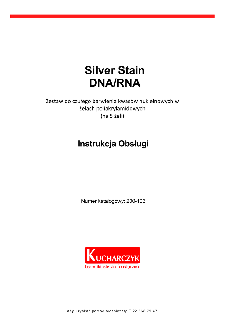 Silver Stain DNA/RNA Zestaw do czułego barwienia kwasów nukleinowych w żelach poliakrylamidowych (na 5 żeli) Instrukcja Obsługi Numer katalogowy: 200-103 Aby uzyskać pomoc techniczną: T 22 668 71 47 Spis treści 1. Informacje ogólne 1.1 1.2 1.3 1.4 Wprowadzenie Skład Zestawu Silver Stain DNA/RNA Specyfikacja techniczna Zasady bezpiecznego użytkowania 2. Użytkowanie Zestawu Silver Stain DNA/RNA 2.1 2.2 Przygotowanie odczynników Przeprowadzenie procedury barwienia 3 3 3 3 3 5 5 5 3. Diagnozowanie i usuwanie problemów 7 4. Akcesoria i wyposażenie dodatkowe 8 5. Wsparcie techniczne 9 1. Informacje ogólne 1.1 Wprowadzenie Serdecznie dziękujemy za zakup Zestawu Silver Stain DNA/RNA do czułego barwienia kwasów nukleinowych w żelach poliakrylamidowych. Zestaw umożliwia zabarwienie 5 żeli o wymiarach do 15 x 15 cm. Wyniki analiz molekularnych, a zwłaszcza rozdziałów elektroforetycznych, w dużym stopniu zależą od odczynników chemicznych używanych do przygotowania żeli, buforów elektrodowych oraz ich barwienia. Oferujemy wyselekcjonowane i testowane odczynniki do elektroforezy białek i kwasów nukleinowych. Zestaw Silver Stain Prot rekomendujemy ze względu na: - wysoką powtarzalność - wygodne użycie - gwarantowaną najwyższą jakość - wysoką czułość barwienia - krótki czas barwienia 1.2 Skład Zestawu Silver Stain DNA/RNA (na 5 żeli) Prosimy o zapoznanie się z elementami Zestawu Silver Stain DNA/RNA przed pierwszym zastosowaniem. 1. Utrwalacz 2. Roztwór srebra 3. Wywoływacz A 4. Wywoływacz B 40 ml 2 ml 200 L 0,5 ml 1.3 Specyfikacja techniczna 1. Utrwalacz – przechowywać w temp. pokojowej 2. Roztwór srebra – odczynnik światłoczuły, przechowywać w 4 °C. Substancja toksyczna. 3. Wywoływacz A - przechowywać w temp. pokojowej. 4. Wywoływacz B - przechowywać w temperaturze pokojowej. 1.4 Zasady bezpiecznego użytkowania Prosimy o uważne zapoznanie się z instrukcją obsługi oraz zasadami bezpiecznego użytkowania Zestawu. 1. Zestaw Silver Stain DNA/RNA zawiera substancje szkodliwe, dlatego Użytkownik powinien zawsze używać rękawiczek jednorazowych i fartucha ochronnego. 2. Przy kontakcie skóry z odczynnikami zawartymi w Zestawie, należy ją bezzwłocznie dokładnie przemyć kilkakrotnie wodą. 3. Elementy Zestawu Silver Stain DNA/RNA powinny być przechowywane zgodnie z zaleceniami. Niewłaściwe przechowywanie odczynników może skutkować pogorszeniem skuteczności barwienia lub spowodować ich całkowitą deaktywację. 3 4. Do wykonania procedury barwienia należy używać wyłącznie wody wysokiej czystości – dejonizowanej lub 2x destylowanej. 5. Ze względu na wysoką czułość metody zalecamy umycie chromianką wszystkich naczyń, które będą używane w trakcie procedury barwienia. 6. Zlewki zużytych odczynników powinny zostać poddane utylizacji. 4 2. Użytkowanie Zestawu Silver Stain DNA/RNA 2.1 Przygotowanie odczynników Odczynniki do barwienia powinny być przygotowane bezpośrednio przed procedurą. Poza roztworami odczynników zawartymi w Zestawie Silver Stain DNA/RNA, należy przygotować 10 % v/v roztwór kwasu octowego oraz 10% roztwór (v/v) etanolu. Wszystkie odczynniki powinny być przygotowane z użyciem wody o wysokiej czystości. Rekomendujemy przeprowadzenie barwienia żelu w pojemnikach szklanych oferowanych przez firmę Kucharczyk TE (nr kat. 100-140 do 149). 1. Utrwalacz 6 ml 114 ml Utrwalacz (roztwór macierzysty) woda dejonizowana 2. Roztwór srebra 900 ul 90 ml Roztwór srebra (roztwór macierzysty) woda dejonizowana 3. Wywoływacz 40 ml 100 ul 180 ml Wywoływacz A (roztwór macierzysty) Wywoływacz B (roztwór macierzysty) woda dejonizowana 4. 10% (v/v) kwas octowy 10 ml 90 ml kwas octowy woda dejonizowana 5. 10% (v/v) etanol 10 ml 90 ml EtOH woda dejonizowana 2.2 Przeprowadzenie procedury barwienia * Lp Etap Odczynnik Czas inkubacji 1 Denaturacja 10% etanol 10 min 2 Utrwalanie Utrwalacz 6 min 3 Srebrzenie Roztwór srebra 10 min 4 Płukanie 3 x H2O 3 x 15 s. 5 Wywołanie Wywoływacz (podzielony na 3 porcje) 1-szy raz 3 min lub do zaciemnienia roztworu 2-gi i 3-ci raz do pojawienia się prążków 6 Zatrzymanie reakcji 10 % kwas octowy 10 min 5 Płukanie 7 1-szy raz 15 s. 2-gi i 3-ci raz 10 min 3 x H2O * dla żelu o grubości 1,5 mm UWAGI OGÓLNE 1. Wytrzymałość mechaniczna żeli poliakrylamidowych w trakcie barwienia metodą srebrową znacznie obniża się. Żel należy przenosić bardzo ostrożnie. 2. Należy unikać dotykania żelu nawet w rękawiczkach, gdyż może to pozostawić ślady na żelu. 3. Żel po wybarwieniu można sfotografować przed i po jego wysuszeniu. Polecamy do tego celu podświetlasz biały zapewniający równomierne natężenie światła (nr kat. 160100). UWAGI DOTYCZĄCE PROCEDURY 1. Dokładne odpłukanie żelu znacznie redukuje poziom tła, dlatego zalecane jest (o ile jest to możliwe) pozostawienie żelu w dużej objętości wody na noc. Następnego dnia, po krótkim odpłukaniu żelu można kontynuować procedurę. 2. Czasy inkubacji podano dla żelu o grubości około 1,5 mm. W przypadku żeli cieńszych czas trwania kolejnych etapów można skrócić o około 50 %. 3. W celu zredukowania poziomu tła, żel należy barwić w czystym pojemniku. 4. Procedurę Wywołania wykonujemy 3-etapowo. W pierwszym etapie wlewamy około 4050 ml roztworu Wywoływacza i łagodnie mieszamy. W momencie postania ciemnobrunatnego precypitatu roztwór zlewamy i dodajemy nową porcję wywoływacza (50 ml). Podobnie jak poprzednio wymieniamy wywoływacz na trzecią porcję, gdy powstanie brunatny precypitat. Mieszamy żel w Wywołaczu do chwili gdy uzyskamy satysfakcjonujący obraz prążków. 5. Reakcję Wywołania przerywamy 10% roztworem kwasu octowego. 6. Żel można przechowywać w wodzie lub wysuszyć z wykorzystaniem Zestawu DRYOUT (nr kat. 100-150). 6 3. Diagnozowanie i usuwanie problemów Problem 1. Brak prążków Możliwa przyczyna a. Nieefektywne barwienie DNA/RNA srebrem b.