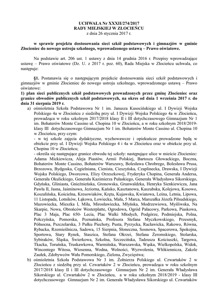 UCHWAŁA Nr XXXII/274/2017 RADY MIEJSKIEJ W ZŁOCIEŃCU z dnia 26 stycznia 2017 r. w sprawie projektu dostosowania sieci szkół podstawowych i gimnazjów w gminie Złocieniec do nowego ustroju szkolnego, wprowadzonego ustawą – Prawo oświatowe. Na podstawie art. 206 ust. 1 ustawy z dnia 14 grudnia 2016 r. Przepisy wprowadzające ustawę – Prawo oświatowe (Dz. U. z 2017 r. poz. 60), Rada Miejska w Złocieńcu uchwala, co następuje: §1. Postanawia się o następującym projekcie dostosowania sieci szkół podstawowych i gimnazjów w gminie Złocieniec do nowego ustroju szkolnego, wprowadzonego ustawą – Prawo oświatowe: 1) plan sieci publicznych szkół podstawowych prowadzonych przez gminę Złocieniec oraz granice obwodów publicznych szkół podstawowych, na okres od dnia 1 września 2017 r. do dnia 31 sierpnia 2019 r. a) ośmioletnia Szkoła Podstawowa Nr 1 im. Janusza Kusocińskiego ul. I Dywizji Wojska Polskiego 4a w Złocieńcu z siedzibą przy ul. I Dywizji Wojska Polskiego 4a w Złocieńcu, prowadząca w roku szkolnym 2017/2018 klasy II i III dotychczasowego Gimnazjum Nr 1 im. Bohaterów Monte Cassino ul. Chopina 10 w Złocieńcu, a w roku szkolnym 2018/2019klasy III dotychczasowego Gimnazjum Nr 1 im. Bohaterów Monte Cassino ul. Chopina 10 w Złocieńcu, przy czym: - w tej szkole zajęcia dydaktyczne, wychowawcze i opiekuńcze prowadzone będą w obiekcie przy ul. I Dywizji Wojska Polskiego 4 i 4a w Złocieńcu oraz w obiekcie przy ul. Chopina 10 w Złocieńcu; - określa się następujące granice obwodu tej szkoły: następujące ulice w mieście Złocieniec: Adama Mickiewicza, Aleja Piastów, Armii Polskiej, Bartosza Głowackiego, Boczna, Bohaterów Monte Cassino, Bohaterów Warszawy, Bolesława Chrobrego, Bolesława Prusa, Brzozowa, Bydgoska, Cegielniana, Cienista, Cieszyńska, Czaplinecka, Drawska, I Dywizji Wojska Polskiego, Dworcowa, Elizy Orzeszkowej, Fryderyka Chopina, Generała Andersa, Generała Okulickiego, Generała Kazimierza Pułaskiego, Generała Władysława Sikorskiego, Gdyńska, Gliniasta, Gnieźnieńska, Gronowska, Grunwaldzka, Henryka Sienkiewicza, Jana Pawła II, Jasna, Jaśminowa, Jeziorna, Kańsko, Kasztanowa, Kaszubska, Kolejowa, Kosowo, Koszalińska, Kościelna, Kresowiaków, Kręta, Kujawska, Kwiatowa, Leśna, Letnia, Lipowa, 11 Listopada, Lotników, Łąkowa, Łowiecka, Mała, 5 Marca, Marszałka Józefa Piłsudskiego, Mazowiecka, Mieszka I, Miła, Mirosławiecka, Młyńska, Modrzewiowa, Myśliwska, Na Skarpie, Nowa, Obrońców Westerplatte, Ogrodowa, Ogród Pałacowy, Parkowa, Piaskowa, Plac 3 Maja, Plac 650- Lecia, Plac Walki Młodych, Podgórze, Podmiejska, Polna, Połczyńska, Pomorska, Poznańska, Profesora Stefana Myczkowskiego, Przesmyk, Północna, Pszczelarska, 3 Pułku Piechoty, Pusta, Pyrzycka, Racławicka, Rakowo, Równa, Rybacka, Rzemieślnicza, Sadowa, 15 Sierpnia, Słoneczna, Sosnowa, Spacerowa, Spokojna, Sportowa, Stary Rynek, Staszica, Stefana Okrzei, Stefana Żeromskiego, Stolarska, Sybiraków, Śląska, Świerkowa, Szkolna, Szczecińska, Tadeusza Kościuszki, Targowa, Tkacka, Toruńska, Truskawkowa, Warmińska, Warszawska, Wąska, Wielkopolska, Widok, Wincentego Witosa, Wiosenna, Wodna, Wolności, Wyzwolenia, Włókiennicza, Zakole Zaułek, Zdobywców Wału Pomorskiego, Zielona, Zwycięstwa; b) ośmioletnia Szkoła Podstawowa Nr 3 im. Żołnierza Polskiego ul. Czwartaków 2 w Złocieńcu z siedzibą przy ul. Czwartaków 2 w Złocieńcu, prowadząca w roku szkolnym 2017/2018 klasy II i III dotychczasowego Gimnazjum Nr 2 im. Generała Władysława Sikorskiego ul. Czwartaków 2 w Złocieńcu, a w roku szkolnym 2018/2019 - klasy III dotychczasowego Gimnazjum Nr 2 im. Generała Władysława Sikorskiego ul. Czwartaków 2 w Złocieńcu, przy czym: - w tej szkole zajęcia dydaktyczne, wychowawcze i opiekuńcze prowadzone będą w obiekcie przy ul.Czwartaków 2 w Złocieńcu; - określa się następujące granice obwodu tej szkoły: następujące ulice w mieście Złocieniec: Czwartaków, Kosynierów, Nadrzeczna, Pancerniaków, Szwoleżerów, Ułanów oraz następujące miejscowości gminy Złocieniec: Bobrowo, Błędno, Cieszyno, Darskowo, Jadwiżyn, Jarosław, Kosobudki, Kosobudy, Lubieszewo, Małobór, Męcidół, Rzęśnica, Skąpe, Stare Worowo, Stawno, Sułoszyn, Szymalów, Uraz, Warniłęg, Wąsosz, Zatonie; 2) plan sieci prowadzonych przez gminę Złocieniec publicznych gimnazjów i klas dotychczasowych publicznych gimnazjów prowadzonych w szkołach podstawowych oraz granice obwodów dotychczasowych publicznych gimnazjów i klas dotychczasowych gimnazjów, na okres od dnia 1 września 2017 r. do dnia 31 sierpnia 2019 r. a) klasy II i III dotychczasowego Gimnazjum Nr 1 im. Bohaterów Monte Cassino ul. Chopina 10 w Złocieńcu do czasu zakończenia kształcenia w tych klasach, które będą funkcjonować w strukturze ośmioletniej Szkoły Podstawowej Nr 1 im. Janusza Kusocińskiego ul. I Dywizji Wojska Polskiego 4a w Złocieńcu z siedzibą przy ul. I Dywizji Wojska Polskiego 4a w Złocieńcu, przy czym w granicach obwodu klas dotychczasowego Gimnazjum Nr 1 im. Bohaterów Monte Cassino ul. Chopina 10 w Złocieńcu leżą następujące ulice w mieście Złocieniec: Adama Mickiewicza, Aleja Piastów, Armii Polskiej, Bartosza Głowackiego, Boczna, Bohaterów Monte Cassino, Bohaterów Warszawy, Bolesława Chrobrego, Bolesława Prusa, Brzozowa, Bydgoska, Cegielniana, Cienista, Cieszyńska, Czaplinecka, Drawska, Dworcowa, I Dywizji Wojska Polskiego, Elizy Orzeszkowej, Fryderyka Chopina, Generała Andersa, Generała Kazimierza Pułaskiego, Generała Okulickiego, Generała Władysława Sikorskiego, Gdyńska, Gliniasta, Gnieźnieńska, Gronowska, Grunwaldzka, Henryka Sienkiewicza, Jana Pawła II, Jasna, Jaśminowa, Jeziorna, Kańsko, Kasztanowa, Kaszubska, Kolejowa, Kosowo, Koszalińska, Kościelna, Kresowiaków, Kręta, Kujawska, Kwiatowa, Leśna, Letnia, Lipowa, 11 Listopada, Lotników, Łąkowa, Łowiecka, Mała, 5 Marca nr 1-43,