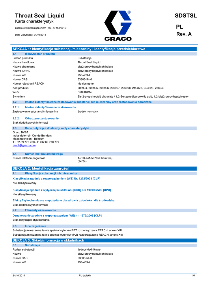 Throat Seal Liquid SDSTSL Karta charakterystyki zgodnie z Rozporządzeniem (WE) nr 453/2010 PL Data weryfikacji: 24/10/2014 Rev. A SEKCJA 1: Identyfikacja substancji/mieszaniny i identyfikacja przedsiębiorstwa 1.1. Identyfikator produktu Postać produktu : Substancja Nazwa handlowa : Throat Seal Liquid Nazwa chemiczna : bis(2-propylheptyl) phthalate Nazwa IUPAC : bis(2-propylheptyl) phthalate Numer WE : 258-469-4 Numer CAS : 53306-54-0 Numer rejestracji REACH : nie dostępne Kod produktu : 206994, 206995, 206996, 206997, 206998, 24C822, 24C823, 238049 Wzór : C28H46O4 Synonimy : Bis(2-propylheptyl) phthalate / 1,2-Benzenedicarboxylic acid, 1,2-bis(2-propylheptyl) ester 1.2. Istotne zidentyfikowane zastosowania substancji lub mieszaniny oraz zastosowania odradzane 1.2.1. Istotne zidentyfikowane zastosowania Zastosowanie substancji/mieszaniny 1.2.2. : środek non-stick Odradzane zastosowanie Brak dodatkowych informacji 1.3. Dane dotyczące dostawcy karty charakterystyki Graco BVBA Industrieterrein Ounde Bunders Maasmechelen - Belgium T +32 89 770 700 - F +32 89 770 777 [email protected] 1.4. Numer telefonu alarmowego Numer telefonu pogotowia : 1-703-741-5970 (Chemtrec) (24/24) SEKCJA 2: Identyfikacja zagrożeń 2.1. Klasyfikacja substancji lub mieszaniny Klasyfikacja zgodnie z rozporządzeniem (WE) Nr. 1272/2008 [CLP] Nie sklasyfikowany Klasyfikacja zgodnie z wytyczną 67/548/EWG [DSD] lub 1999/45/WE [DPD] Nie sklasyfikowany Efekty fizykochemiczne niepożądane dla zdrowia człowieka i dla środowiska Brak dodatkowych informacji 2.2. Elementy oznakowania Oznakowanie zgodnie z rozporządzeniem (WE) nr. 1272/2008 [CLP] Brak dotyczące etykietowania 2.3. Inne zagrożenia Substancja/mieszanina ta nie spełnia kryteriów PBT rozporządzenia REACH, aneks XIII Substancja/mieszanina ta nie spełnia kryteriów vPvB rozporządzenia REACH, aneks XIII SEKCJA 3: Skład/informacja o składnikach 3.1. Substancja Rodzaj substancji : Jednoskładnikowe Nazwa : bis(2-propylheptyl) phthalate Numer CAS : 53306-54-0 Numer WE : 258-469-4 24/10/2014 PL (polski) 1/6 Throat Seal Liquid Karta charakterystyki zgodnie z Rozporządzeniem (WE) nr 453/2010 Nazwa Identyfikator produktu % Klasyfikacja zgodnie z dyrektywą 67/548/EEC bis(2-propylheptyl) phthalate (Numer CAS) 53306-54-0 (Numer WE) 258-469-4 (REACH-nr) nie dostępne 80 - 100 Nie sklasyfikowany (Główny składnik) Nazwa Identyfikator produktu % Klasyfikacja zgodnie z rozporządzeniem (WE) Nr. 1272/2008 [CLP] bis(2-propylheptyl) phthalate (Numer CAS) 53306-54-0 (Numer WE) 258-469-4 (REACH-nr) nie dostępne 80 - 100 Nie sklasyfikowany (Główny składnik) Brzmienie sformułowań R i H: patrz sekcja 16 3.2. Mieszanina Nie dotyczy SEKCJA 4: Środki pierwszej pomocy 4.1. Opis środków pierwszej pomocy Pierwsza pomoc - środki po zainhalowaniu : Wyprowadzić lub wynieść poszkodowanego na świeże powietrze i zapewnić warunki do odpoczynku w pozycji umożliwiającej swobodne oddychanie. W przypadku złego samopoczucia, należy zasięgnąć porady lekarza. Pierwsza pomoc - środki po kontakcie ze skórą : Wyprać zanieczyszczoną odzież przed ponownym użyciem. Natychmiast zdjąć całą zanieczyszczoną odzież. Umyć dużą ilością wody z mydłem. Pierwsza pomoc - środki po kontakcie z oczami : Natychmiast przemyć dużą ilością wody przez 15 minut. Wyjąć soczewki kontaktowe, jeżeli są i można je łatwo usunąć. Nadal płukać. Pierwsza pomoc - środki po połknięciu : Natychmiast przepłukać jamę ustną i obficie popić wodą. Nie wywoływać wymiotów, jeśli nie jest to zalecane przez personel medyczny. Skonsultować się z lekarzem/personelem medycznym w przypadku złego samopoczucia. 4.2. Najważniejsze ostre i opóźnione objawy oraz skutki narażenia Brak dodatkowych informacji 4.3. Wskazania dotyczące wszelkiej natychmiastowej pomocy lekarskiej i szczególnego postępowania z poszkodowanym Brak dodatkowych informacji SEKCJA 5: Postępowanie w przypadku pożaru 5.1. Środki gaśnicze Odpowiednie środki gaśnicze : Dwutlenek węgla (CO2), woda, suchy proszek. Nieodpowiednie środki gaśnicze : Nieznane. 5.2. Szczególne zagrożenia związane z substancją lub mieszaniną Zagrożenie pożarowe : Nieznane. Niepalny w temperaturze otoczenia i pod ciśnieniem. Zagrożenie wybuchem : Nieznane. Niebezpieczne produkty rozkładu w przypadku pożaru : Toksyczne gazy i opary mogą być uwalniane w pożarze 5.3. Informacje dla straży pożarnej Środki zapobiegawcze celem uniknięcia pożaru : Materiał ten jest palny i może zapalić się poprzez wysokie temperatury, iskry, ogień lub inne zródła zapłonu (np. statyczna elektryczność, ogień zapalny, mechaniczne/elektryczne wyposażenie). Instrukcja gaśnicza : Gasić pożar z rozsądnej odległości z zachowaniem zwykłych środków ostrożności. Ewakuować teren. Schłodzić cysterny, beczki za pomocą rozpylanej wody/zabezpieczyć. Wycofania bezpośrednio z powierzchni, jeżeli istnieje rosnące dźwięku z zabezpieczeniem odpowietrzający lub odbarwienia statków, zbiorników i rurociągów. Ochrona w przypadku gaszenia pożaru : W razie pożaru: Stosować niezależny sprzęt do ochrony dróg oddechowych. SEKCJA 6: Postępowanie w przypadku niezamierzonego uwolnienia do środowiska 6.1. Indywidualne środki ostrożności, wyposażenie ochronne i procedury w sytuacjach awaryjnych 6.1.1. Dla osób nienależących do personelu udzielającego pomocy Wyposażenie ochronne : Nosić odpowiednią odzież ochronną. Procedury działania na wypadek zagrożenia : Wyeliminować wszystkie źródła zapłonu, jeżeli jest to bezpieczne. Ewakuować personel do bezpiecznej strefy. 6.1.2. Dla osób udzielających pomocy Wyposażenie ochronne : Nosić odpowiednią odzież ochronną. W razie pożaru: Stosować niezależny sprzęt do ochrony dróg oddechowych. Procedury działania na wypadek zagrożenia : Ewakuować teren. Przewietrzyć dotknięte problemem pomieszczenie. 24/10/2014 PL (polski) 2/6 Throat 