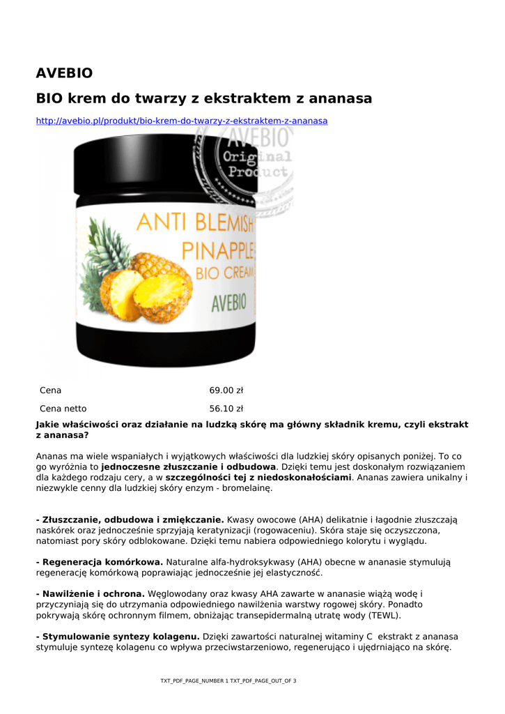 AVEBIO BIO krem do twarzy z ekstraktem z ananasa http://avebio.pl/produkt/bio-krem-do-twarzy-z-ekstraktem-z-ananasa Cena 69.00 zł Cena netto 56.10 zł Jakie właściwości oraz działanie na ludzką skórę ma główny składnik kremu, czyli ekstrakt z ananasa? Ananas ma wiele wspaniałych i wyjątkowych właściwości dla ludzkiej skóry opisanych poniżej. To co go wyróżnia to jednoczesne złuszczanie i odbudowa. Dzięki temu jest doskonałym rozwiązaniem dla każdego rodzaju cery, a w szczególności tej z niedoskonałościami. Ananas zawiera unikalny i niezwykle cenny dla ludzkiej skóry enzym - bromelainę. - Złuszczanie, odbudowa i zmiękczanie. Kwasy owocowe (AHA) delikatnie i łagodnie złuszczają naskórek oraz jednocześnie sprzyjają keratynizacji (rogowaceniu). Skóra staje się oczyszczona, natomiast pory skóry odblokowane. Dzięki temu nabiera odpowiedniego kolorytu i wyglądu. - Regeneracja komórkowa. Naturalne alfa-hydroksykwasy (AHA) obecne w ananasie stymulują regenerację komórkową poprawiając jednocześnie jej elastyczność. - Nawilżenie i ochrona. Węglowodany oraz kwasy AHA zawarte w ananasie wiążą wodę i przyczyniają się do utrzymania odpowiedniego nawilżenia warstwy rogowej skóry. Ponadto pokrywają skórę ochronnym filmem, obniżając transepidermalną utratę wody (TEWL). - Stymulowanie syntezy kolagenu. Dzięki zawartości naturalnej witaminy C ekstrakt z ananasa stymuluje syntezę kolagenu co wpływa przeciwstarzeniowo, regenerująco i ujędrniająco na skórę. TXT_PDF_PAGE_NUMBER 1 TXT_PDF_PAGE_OUT_OF 3 - Ochrona integralności skóry. Witamina C zawarta w ananasie posiada silne właściwości przeciwutleniające i wymiatające wolne rodniki. Pozostałe aktywne składniki i ich podstawowe działanie w kremie: MASŁO SHEA - regeneruje, wygładza, działa łagodząco. OLEJ KOKOSOWY - nawilża i kondycjonuje. WOSK PSZCZELI - uelastycznia i wygładza skórę. MASŁO KAKAOWE - chroni przed szkodliwymi procesami utleniania. OLEJ Z OGÓRECZNIKA - chroni integralność skóry. OLEJ Z DZIKIEJ RÓŻY - wzmacnia naczynia krwionośne. SOK Z MIĄŻSZU ALOESU - nawilża, łagodzi, odświeża. OLEJ SŁONECZNIKOWY - działa przeciwutleniająco. Czym różni się BIO krem AVEBIO od ogólnie dostępnych kremów? Przede wszystkim składem. W kremach AVEBIO nie stosujemy olejów mineralnych i parafiny. W składzie tych kremów nie znajdziesz sztucznych zapachów, barwników i syntetycznych wypełniaczy. W AVEBIO wyznajemy zasadę transparentnych składów, które podajemy przy każdym produkcie. Minimum 95% składników BIO kremu AVEBIO jest pochodzenia naturalnego. Do jakiej skóry przeznaczony jest krem z ekstraktem z ananasa? Krem może być używany w przypadku każdego rodzaju cery. W szczególności jednak polecany jest do cery z niedoskonałościami (m. in. przebarwienia, ślady po wypryskach, blizny potrądzikowe, itp.). Naturalne kwasy AHA normalizują pracę gruczołów łojowych, dlatego krem mogą stosować z powodzeniem również osoby z cerą mieszaną i przetłuszczającą się. Z racji obecności naturalnych kwasów owocowych krem najlepiej stosować jesienią i zimą, kiedy nasza skóra nie jest narażona na silnie działanie słońca. Czy krem się dobrze wchłania i czy zostawia na skórze tłustą warstwę? Krem, mimo bogatej konsystencji dobrze się wchłania i nie pozostawia tłustej powłoki na skórze. Oczywiście nie należy przesadzać z ilością i odczekać chwilę. Czy krem można stosować pod makijaż? Tak. Krem stanowi doskonałą bazę pod makijaż. Czy krem można łączyć z naturalnymi olejkami roślinnymi lub wodami kwiatowymi? Oczywiście. Wystarczy połączyć odrobinę kremu z kilkoma kroplami ulubionego olejku lub naturalnej wody kwiatowej. Takie połączenie czyni pielęgnację bardziej bogatą i kompletną. Czy krem można stosować również "na noc"? Oczywiście. Krem nadaje się do stosowania zarówno w dzień jak i na noc. Jaki jest termin trwałości kremu? Termin ważności produktu jest zawsze podany na opakowaniu. Standardowo wynosi 12 miesięcy od daty produkcji. Czy produkt był testowany na zwierzętach? Nie testujemy naszych produktów na zwierzętach. BIO krem jest odpowiedni dla wegetarian. Czy produkt zawiera parabeny lub parafinę? Nie! Krem nie zawiera takich substancji jak parafina i parabeny. Nie zawiera również syntetycznych barwników i zapachów. Ponad 95% składników kremu jest pochodzenia naturalnego. TXT_PDF_PAGE_NUMBER 2 TXT_PDF_PAGE_OUT_OF 3 Jaki zapach ma ten krem? Krem posiada bardzo delikatny zapach prawdziwego ananasa. Produkt w żaden sposób nie jest dodatkowo perfumowany. Jaka jest wydajność kremu? Średnią wydajność kremu oceniamy od 3 do 6 miesięcy. Jest ona uzależniona od zakresu (tylko twarz czy również dekolt), intensywności (aplikowana ilość) i częstotliwości stosowania (tylko na dzień lub na dzień i na noc). Jaka jest pojemność opakowania? Krem jest zapakowany w szklany słoiczek z brązowego szkła o pojemności 60 ml. Jak przechowywać krem? Produkt powinien być przechowywany w temperaturze pokojowej. Należy unikać nadmiernego nasłonecznienia. Jaki jest dokładny skład kremu? SKŁADNIKI: Aqua, Helianthus Annuus Seed Oil (SŁONECZNIK), Ananas Sativus Fruit Extract (ANANAS), Butyrospermum Parkii Butter (SHEA), Cocos Nucifera Oil (KOKOS), Cera Alba (WOSK PSZCZELI), Glyceryl Stearate (naturalny emulgator), Theobroma Cacao Seed Butter (KAKAOWIEC), Glycerin (ROŚLINNA), Sucrose Stearate (połączenie cukru z naturalnym kwasem stearynowym), Coco Glucoside (naturalny emulgator z oleju kokosowego), Coconut Alcohol (wytworzony z oleju kokosowego), Maltodextrin (naturalna substancja kondycjonująca), Borago Officinalis Seed Oil (OGÓRECZNIK), Rosa Canina Fruit Oil (DZIKA RÓŻA), Aloe Barbadensis Leaf Juice Powder (ALOES), Tocopherol (WITAMINA E), Xanthan Gum (naturalny stabilizator), Benzyl Alcohol (zapobiega rozwojowi mikroorganizmów), Dehydroacetic Aci