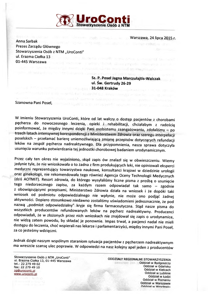 M UroConti Stowarzyszenie O sób z NTM Anna Sarbak Prezes Zarządu Głównego Stowarzyszenia Osób z NTM „UroConti" ul. Erazma Ciołka 13 01-445 Warszawa Warszawa, 24 lipca 2015 r Sz. P. Poseł Jagna Marczułajtis-Walczak ul. Św. Gertrudy 26-29 31-048 Kraków Szanowna Pani Poseł, W imieniu Stowarzyszenia UroConti, które od lat walczy o dostęp pacjentów z chorobami pęcherza do nowoczesnego leczenia, opieki i rehabilitacji, chciałabym z radością poinformować, że między innymi dzięki Pani osobistemu zaangażowaniu, zdołaliśmy - po trzech latach intensywnej korespondencji z Ministerstwem Zdrowia oraz szeregu interpelacji poselskich - przełamać barierę uniemożliwiającą zmianę przepisów dotyczących refundacji leków na zespół pęcherza nadreaktywnego. Dla przypomnienia, nasza sprawa dotyczyła usunięcia warunku potwierdzania tej jednostki chorobowej badaniem urodynamicznym. Przez cały ten okres nie wyjaśniono, skąd zapis ów znalazł się w obwieszczeniu. Wiemy jedynie tyle, że nie wnioskowała o to żadna z firm produkujących leki, nie opiniowali eksperci medyczni reprezentujący towarzystwa naukowe, konsultanci krajowi w dziedzinie urologii oraz ginekologii, nie rekomendowała tego również Agencja Oceny Technologii Medycznych (dziś AOTMiT). Resort zdrowia, do którego wysyłaliśmy liczne pisma z prośbą o usunięcie tego niedorzecznego zapisu, za każdym razem odpowiadał tak samo — zgodnie z obowiązującymi przepisami, Ministerstwo Zdrowia działa na wniosek i że dopóki taki wniosek od podmiotu odpowiedzialnego nie wpłynie, nie może ono podjąć żadnej aktywności. Dopiero stosunkowo niedawno zostaliśmy uświadomieni jednoznacznie, że pod nazwą „podmiot odpowiedzialny" kryje się firma farmaceutyczna. Stąd nasze pisma do wszystkich producentów refundowanych leków na pęcherz nadreaktywny. Producenci odpowiadali, że w złożonych przez nich wnioskach nie znajdował się zapis o urodynamice, nie widzą zatem powodu, by składać je ponownie. Impas trwał, a pacjenci nadal nie mieli dostępu do leczenia, choć wspierali nas lekarze i parlamentarzyści, między innymi Pani Poseł, za co jesteśmy wdzięczni. Jednak dzięki naszym wspólnym staraniom sytuacja pacjentów z pęcherzem nadreaktywnym ma wreszcie szansę ulec poprawie. W odpowiedzi na nasz kolejny apel jeden z producentów UroConti Stowarzyszenie Osób z NTM leków na OAB zadeklarował, że ponownie złoży wniosek, choć nadal uważa, że obecna sytuacja w żaden sposób nie została zawiniona przez niego. Być może wkrótce dołączą inni producenci. Ponieważ konieczność ponownego złożenia wniosku była, według Ministerstwa Zdrowia, jedynym powodem utrzymywania dotąd zapisu o warunku potwierdzenia rozpoznania pęcherza nadreaktywnego badaniem urodynamicznym, mamy ogromną nadzieję, że po jego złożeniu nie będzie już przeszkód, by polscy pacjenci, wzorem tych z innych krajów UE, mogli być leczeni zgodnie ze światowymi standardami. Dlatego jeszcze raz dziękując za Pani starania o poprawę losu pacjentów z NTM, bardzo prosimy o wsparcie nas w egzekwowaniu od Ministerstwa Zdrowia przestrzegania terminów i sprawnego przebiegu procesu rozpatrywania wniosku. Mamy świadomość, że głos Państwa - Parlamentarzystów jest znacznie silniejszy niż nasz, dlatego tak bardzo liczymy na pomoc. Mamy nadzieję, że wspólnymi siłami doprowadzimy wreszcie do zniesienia przepisu, który nie jest stosowany w żadnym innym kraju na świecie i przywrócimy tym samym normalność w domach wszystkich polskich pacjentów, którzy dziś nie korzystają z terapii właśnie ze względu na konieczność wykonania niepotrzebnego, nieprzyjemnego, a co najważniejsze, niemiarodajnego badania urodynamicznego. Z poważaniem, I Anna Sarbak Prezes Zarządu Głównego Stowarzyszenia Osób z NTM „UroConti" Stowarzyszenie Osób z NTM „UroConti" ul. Erazma Ciołka 13, 01-445 Warszawa tel.: 22 279 49 02 fax: 22 279 49 10 [email protected] www.uroconti.pl ODDZIAŁY REGIONALNE STOWARZYSZENIA Oddział w Bydgoszczy Oddział w Gdańsku Oddział w Kielcach Oddział w Lublinie Oddział w Łodzi Oddział w Poznaniu Oddział w Warszawie Orlrl7iał w W rn rław iu