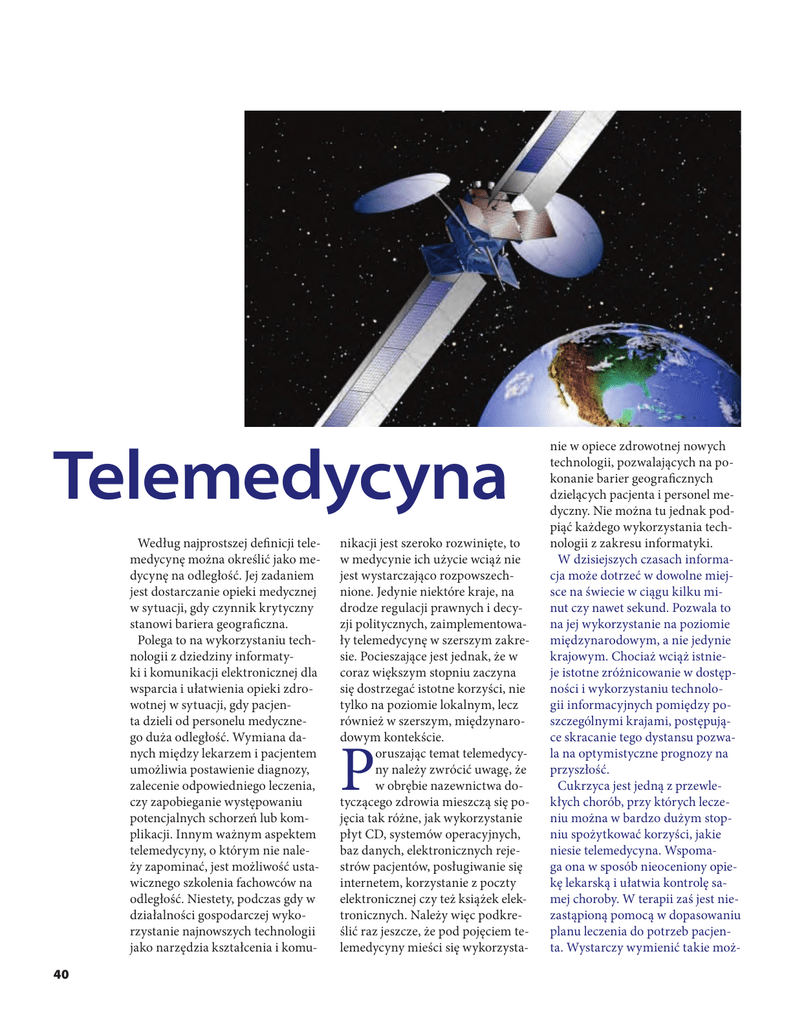 Telemedycyna Według najprostszej definicji telemedycynę można określić jako medycynę na odległość. Jej zadaniem jest dostarczanie opieki medycznej w sytuacji, gdy czynnik krytyczny stanowi bariera geograficzna. Polega to na wykorzystaniu technologii z dziedziny informatyki i komunikacji elektronicznej dla wsparcia i ułatwienia opieki zdrowotnej w sytuacji, gdy pacjenta dzieli od personelu medycznego duża odległość. Wymiana danych między lekarzem i pacjentem umożliwia postawienie diagnozy, zalecenie odpowiedniego leczenia, czy zapobieganie występowaniu potencjalnych schorzeń lub komplikacji. Innym ważnym aspektem telemedycyny, o którym nie należy zapominać, jest możliwość ustawicznego szkolenia fachowców na odległość. Niestety, podczas gdy w działalności gospodarczej wykorzystanie najnowszych technologii jako narzędzia kształcenia i komu40 nikacji jest szeroko rozwinięte, to w medycynie ich użycie wciąż nie jest wystarczająco rozpowszechnione. Jedynie niektóre kraje, na drodze regulacji prawnych i decyzji politycznych, zaimplementowały telemedycynę w szerszym zakresie. Pocieszające jest jednak, że w coraz większym stopniu zaczyna się dostrzegać istotne korzyści, nie tylko na poziomie lokalnym, lecz również w szerszym, międzynarodowym kontekście. oruszając temat telemedycyny należy zwrócić uwagę, że w obrębie nazewnictwa dotyczącego zdrowia mieszczą się pojęcia tak różne, jak wykorzystanie płyt CD, systemów operacyjnych, baz danych, elektronicznych rejestrów pacjentów, posługiwanie się internetem, korzystanie z poczty elektronicznej czy też książek elektronicznych. Należy więc podkreślić raz jeszcze, że pod pojęciem telemedycyny mieści się wykorzysta- P nie w opiece zdrowotnej nowych technologii, pozwalających na pokonanie barier geograficznych dzielących pacjenta i personel medyczny. Nie można tu jednak podpiąć każdego wykorzystania technologii z zakresu informatyki. W dzisiejszych czasach informacja może dotrzeć w dowolne miejsce na świecie w ciągu kilku minut czy nawet sekund. Pozwala to na jej wykorzystanie na poziomie międzynarodowym, a nie jedynie krajowym. Chociaż wciąż istnieje istotne zróżnicowanie w dostępności i wykorzystaniu technologii informacyjnych pomiędzy poszczególnymi krajami, postępujące skracanie tego dystansu pozwala na optymistyczne prognozy na przyszłość. Cukrzyca jest jedną z przewlekłych chorób, przy których leczeniu można w bardzo dużym stopniu spożytkować korzyści, jakie niesie telemedycyna. Wspomaga ona w sposób nieoceniony opiekę lekarską i ułatwia kontrolę samej choroby. W terapii zaś jest niezastąpioną pomocą w dopasowaniu planu leczenia do potrzeb pacjenta. Wystarczy wymienić takie moż- liwości jak: konsultacja na odległość z wykorzystaniem wideokonferencji i przesyłania obrazów w czasie rzeczywistym; – transmisja danych, telemonitoring w czasie rzeczywistym lub na zasadzie store and forward (z wykorzystaniem węzła pośredniczącego, który najpierw pobiera całość informacji i po sprawdzeniu jej poprawności przesyła ją do węzła docelowego); – w ykorzystanie telefonii komórkowej i wiadomości SMS w celu intensywnego monitorowania stanu pacjentów z cukrzycą; – w yedukowanie pacjenta, wsparcie samokontroli, leczenie na odległość. – w ykorzystanie systemów teleokulistyki w centrach podstawowej opieki zdrowotnej dla wdrożenia badań okresowych w celu wczesnego wykrycia retinopatii cukrzycowej. Istotną kwestią jest też odpowiednie przygotowanie pacjentów diabetyków do posługiwania się technologiami z zakresu informatyki i komunikacji, a przede wszystkim zapewnienie im dostępu do tych technologii. Pokonanie bariery geograficznej nie jest jedyną korzyścią płynącą z wykorzystania telemedycyny. Równie istotny jest czas, który się dzięki niej zyskuje. Pacjent zdecydowanie zmniejsza liczbę wizyt u lekarza, a dzięki temu może zachować większą autonomię. Dobrym przykładem są dane ze Szpitala Klinicznego San Carlos w Madrycie. Badania przeprowadzone tam w ostatnich latach na grupie kobiet ciężarnych cierpiących na cukrzycę wskazują jednoznacznie, że wykorzystanie telemedycyny poprawiło jakość życia pacjentek dzięki wyraźnemu ograniczeniu (o kilkadziesiąt procent) liczby wizyt w ośrodku. Lepszy monitoring stanu chorego pozwala na zwiększenie kontroli metabolicznej diabetyków. Dzięki temu zredukowane zostaje ryzyko wystąpienia komplikacji. Ponadto dzięki stałej kontroli ciśnienia tętniczego zmniejsza się ryzyko powikłań w wyniku uszkodzenia naczyń krwionośnych. Innym, godnym wymienienia przykładem korzyści płynących z zastosowania telemedycyny jest uwrażliwienie na schorzenia okulistyczne zarówno personelu ośrodków zdrowia, jak i chorujących na cukrzycę, którzy często nie zdają sobie sprawy, że znajdują się w grupie ryzyka. Pacjenci ci mogą cierpieć na retinopatię cukrzycową, która nieleczona może doprowadzić do ślepoty. W związku z tym wszyscy diabetycy powinni przechodzić rutynowe badania oczu co najmniej raz w roku. W praktyce jednak większość pacjentów nie zgłasza się na takie badania, dopóki nie pojawią się dolegliwości. Dzięki systemowi telemedycyny liczba leczonych pacjentów wzrosła dwukrotnie. Innym aspektem wykorzystania telemedycyny, o którym warto wspomnieć, mimo że nie odnosi się bezpośrednio do cukrzycy, jest fakt starzenia się społeczeństw państw Unii Europejskiej. Problem ten dotyczy również Polski. Pacjenci powyżej 65 roku życia wyma- gają wzmożonej opieki zdrowotnej, co wiąże się ze wzrastającymi nakładami pieniędzy i czasu. Jest więc rzeczą oczywistą, że w miarę pogłębiania się tego zjawiska konieczne będzie wypracowanie mechanizmów, które będą odpowiedzią adekwatną do zmieniającej się rzeczywistości i zapewnią sprawne funkcjonowanie systemu służby zdrowia. Z analogicz