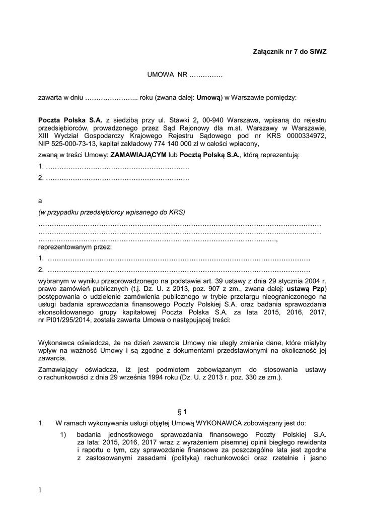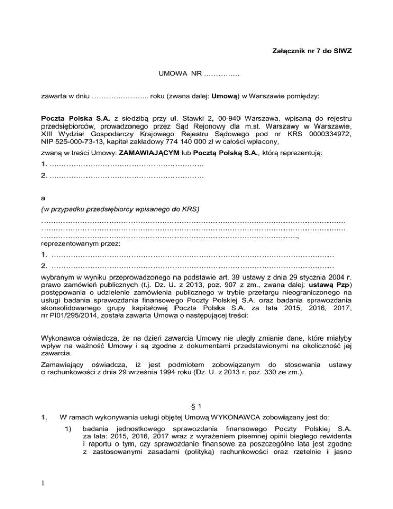 Załącznik nr 7 do SIWZ UMOWA NR …………… zawarta w dniu …………………... roku (zwana dalej: Umową) w Warszawie pomiędzy: Poczta Polska S.A. z siedzibą przy ul. Stawki 2, 00-940 Warszawa, wpisaną do rejestru przedsiębiorców, prowadzonego przez Sąd Rejonowy dla m.st. Warszawy w Warszawie, XIII Wydział Gospodarczy Krajowego Rejestru Sądowego pod nr KRS 0000334972, NIP 525-000-73-13, kapitał zakładowy 774 140 000 zł w całości wpłacony, zwaną w treści Umowy: ZAMAWIAJĄCYM lub Pocztą Polską S.A., którą reprezentują: 1. ………………………………………………………. 2. ………………………………………………………. a (w przypadku przedsiębiorcy wpisanego do KRS) ……………………………………………………………………………………………………………… ……………………………………………………………………………………………………………… ……………………………………………………………………………………………., reprezentowanym przez: 1. ……………………………………………………………………………………………………… 2. ……………………………………………………………………………………………………… wybranym w wyniku przeprowadzonego na podstawie art. 39 ustawy z dnia 29 stycznia 2004 r. prawo zamówień publicznych (t.j. Dz. U. z 2013, poz. 907 z zm., zwana dalej: ustawą Pzp) postępowania o udzielenie zamówienia publicznego w trybie przetargu nieograniczonego na usługi badania sprawozdania finansowego Poczty Polskiej S.A. oraz badania sprawozdania skonsolidowanego grupy kapitałowej Poczta Polska S.A. za lata 2015, 2016, 2017, nr PI01/295/2014, została zawarta Umowa o następującej treści: Wykonawca oświadcza, że na dzień zawarcia Umowy nie uległy zmianie dane, które miałyby wpływ na ważność Umowy i są zgodne z dokumentami przedstawionymi na okoliczność jej zawarcia. Zamawiający oświadcza, iż jest podmiotem zobowiązanym do stosowania o rachunkowości z dnia 29 września 1994 roku (Dz. U. z 2013 r. poz. 330 ze zm.). ustawy §1 1. W ramach wykonywania usługi objętej Umową WYKONAWCA zobowiązany jest do: 1) 1 badania jednostkowego sprawozdania finansowego Poczty Polskiej S.A. za lata: 2015, 2016, 2017 wraz z wyrażeniem pisemnej opinii biegłego rewidenta i raportu o tym, czy sprawozdanie finansowe za poszczególne lata jest zgodne z zastosowanymi zasadami (polityką) rachunkowości oraz rzetelnie i jasno przedstawia sytuację majątkową, finansową, jak również wynik finansowy Poczty Polskiej S.A. 2) badania skonsolidowanego sprawozdania finansowego grupy kapitałowej Poczta Polska S.A. za lata: 2015, 2016, 2017 wraz z wyrażeniem pisemnej opinii biegłego rewidenta i raportu o tym, czy sprawozdanie finansowe za poszczególne lata jest zgodne z zastosowanymi zasadami (polityką) rachunkowości oraz czy rzetelnie i jasno przedstawia sytuację majątkową, finansową, jak również wynik finansowy grupy kapitałowej Poczta Polska S.A. 3) sporządzenia ww. opinii biegłego rewidenta wraz z raportem w języku polskim w liczbie po 6 oryginalnych egzemplarzy każdego z tych dokumentów. 4) tłumaczenia sporządzonego przez tłumacza przysięgłego (na język angielski): rocznego jednostkowego sprawozdania finansowego wraz z opinią biegłego rewidenta i raportem z badania oraz sprawozdania Zarządu z działalności; rocznego skonsolidowanego sprawozdania finansowego grupy kapitałowej wraz z opinią biegłego rewidenta i raportem z badania oraz sprawozdania Zarządu z działalności grupy kapitałowej. 5) opcjonalnie w przypadku podjęcia przez właściciela ZAMAWIAJĄCEGO decyzji o wprowadzeniu instrumentów finansowych Poczty Polskiej S.A. do obrotu publicznego oraz na podstawie przekazanego WYKONAWCY przez ZAMAWIAJĄCEO pisemnego zlecenia, którego wzór stanowi załącznik nr 5 do Umowy, badania sprawozdania finansowego Poczty Polskiej S.A. oraz skonsolidowanego sprawozdania finansowego Poczty Polskiej S.A. sporządzonych zgodnie z polskimi przepisami i przekształconych zgodnie z wymogami Międzynarodowych Standardów Sprawozdawczości Finansowej obejmujących: a) dwa okresy porównawcze (złożenie prospektu w terminie 135 dni od zakończenia roku obrotowego) albo b) dwa okresy porównawcze oraz sprawozdanie śródroczne wraz z okresem porównawczym (złożenie prospektu po terminie 135 dni od zakończenia roku obrotowego) wraz ze sporządzeniem pisemnych opinii i raportów na potrzeby prospektu emisyjnego. 6) opcjonalnie w przypadku zrealizowania ust. 1 pkt 5 (po złożeniu prospektu emisyjnego) i przekazaniu WYKONAWCY przez ZAMAWIAJĄCEGO pisemnego zlecenia, którego wzór stanowi załącznik nr 5 do Umowy – zgodnie z wymogami dla spółek publicznych - przeglądu półrocznego jednostkowego sprawozdania finansowego Poczty Polskiej S.A. sporządzanego zgodnie z wymogami Międzynarodowych Standardów Sprawozdawczości Finansowej na każdy dzień 30.06. począwszy od roku złożenia prospektu emisyjnego wraz z wydaniem pisemnego raportu z przeglądu. 7) opcjonalnie w przypadku zrealizowania ust. 1 pkt 5 (po złożeniu prospektu emisyjnego) i przekazaniu WYKONAWCY przez ZAMAWIAJĄCEGO pisemnego zlecenia, którego wzór stanowi załącznik nr 5 do Umowy – zgodnie z wymogami dla spółek publicznych - przeglądu półrocznego skonsolidowanego sprawozdania finansowego Poczty Polskiej S.A. sporządzanego zgodnie z wymogami Międzynarodowych Standardów Sprawozdawczości Finansowej na każdy dzień 30.06. począwszy od roku złożenia prospektu emisyjnego wraz z wydaniem pisemnego raportu z przeglądu. Łącznie zwanych dalej: Przedmiotem Umowy. 2 2. Brak pisemnego zlecenia ZAMAWIAJĄCEGO, o którym mowa w ust. 1 pkt 5-7, do dnia 30.06.2017 r. oznacza, że ZAMAWIAJĄCY zrezygnował z zamówień opcjonalnych, o któr