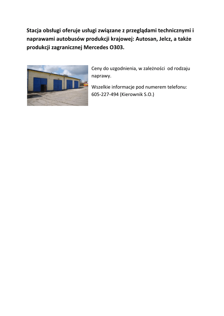Stacja obsługi oferuje usługi związane z przeglądami technicznymi i naprawami autobusów produkcji krajowej: Autosan, Jelcz, a także produkcji zagranicznej Mercedes O303. Ceny do uzgodnienia, w zależności od rodzaju naprawy. Wszelkie informacje pod numerem telefonu: 605-227-494 (Kierownik S.O.)