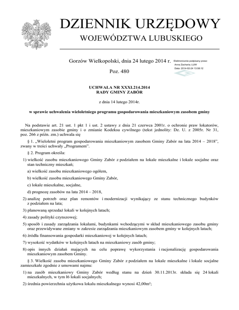 DZIENNIK URZĘDOWY WOJEWÓDZTWA LUBUSKIEGO Gorzów Wielkopolski, dnia 24 lutego 2014 r. Elektronicznie podpisany przez: Anna Zacharia; LUW Poz. 480 Data: 2014-02-24 13:58:12 UCHWAŁA NR XXXI.214.2014 RADY GMINY ZABÓR z dnia 14 lutego 2014r. w sprawie uchwalenia wieloletniego programu gospodarowania mieszkaniowym zasobem gminy Na podstawie art. 21 ust. 1 pkt 1 i ust. 2 ustawy z dnia 21 czerwca 2001r. o ochronie praw lokatorów, mieszkaniowym zasobie gminy i o zmianie Kodeksu cywilnego (tekst jednolity: Dz. U. z 2005r. Nr 31, poz. 266 z późn. zm.) uchwala się § 1. „Wieloletni program gospodarowania mieszkaniowym zasobem Gminy Zabór na lata 2014 – 2018”, zwany w treści uchwały „Programem”. § 2. Program określa: 1) wielkość zasobu mieszkaniowego Gminy Zabór z podziałem na lokale mieszkalne i lokale socjalne oraz stan techniczny mieszkań; a) wielkość zasobu mieszkaniowego ogółem, b) wielkość zasobu mieszkaniowego Gminy Zabór, c) lokale mieszkalne, socjalne, d) prognozę zasobów na lata 2014 – 2018, 2) analizę potrzeb oraz plan remontów i modernizacji wynikający ze stanu technicznego budynków z podziałem na lata; 3) planowaną sprzedaż lokali w kolejnych latach; 4) zasady polityki czynszowej; 5) sposób i zasady zarządzania lokalami, budynkami wchodzącymi w skład mieszkaniowego zasobu gminy oraz przewidywane zmiany w zakresie zarządzania mieszkaniowym zasobem gminy w kolejnych latach; 6) źródła finansowania gospodarki mieszkaniowej w kolejnych latach; 7) wysokość wydatków w kolejnych latach na mieszkaniowy zasób gminy; 8) opis innych działań mających na celu poprawę wykorzystania i racjonalizację gospodarowania mieszkaniowym zasobem Gminy. § 3. Wielkość zasobu mieszkaniowego Gminy Zabór z podziałem na lokale mieszkalne i lokale socjalne zamieszkałe zgodnie z umowami najmu: 1) na zasób mieszkaniowy Gminy Zabór według stanu na dzień 30.11.2013r. składa się 24 lokali mieszkalnych, w tym l6 lokali socjalnych; 2) średnia powierzchnia użytkowa lokalu mieszkalnego wynosi 42,00m²; Dziennik Urzędowy Województwa Lubuskiego –2– Poz. 480 3) wielkość zasobu mieszkaniowego Gminy Zabór – lokale mieszkalne określa tabela Nr 1; Tabela 1. Lp. Adres Powierzchnia użytkowa lokali mieszkalnych 1 Przytok ul. Lubuska nr 3 127,48m² 3 0 1 2 Przytok ul. Kisielińska nr 6 33,00m² 1 1 0 3 Zabór ul. Gronowa 10 285,48m² 4 1 0 445,96m² 8 2 1 Razem Ilość lokali mieszkalnych Instalacja wodno-kan. - oczyszczalnia przydomowa Zbiornik na nieczystości płynne 4) wielkość zasobu mieszkaniowego Gminy Zabór – lokale socjalne, określa Tabela Nr 2; Tabela 2. Lp. Adres 1 Czarna 20 Droszków ul. Kościelna 9 Przytok ul. Lubuska nr 3 Przytok ul. Kisielińska nr 6 Wielobłota 15 Zabór ul. Gronowa 10 Razem 2 3 4 5 6 Powierzchnia użytkowa lokali socjalnych Ilość lokali socjalnych Instalacja wod-kan - oczyszczalnia przydomowa Zbiornik na nieczystości płynne 59,44m² 2 0 0 38,15m² 1 0 1 62,66m² 3 0 1 252,26m² 7 1 0 84,79m² 1 0 1 114,91m² 2 1 0 612,21m² 16 2 3 5) prognozę stanu zasobów mieszkaniowych na lata 2014 – 2018 przedstawia Tabela Nr 3; Tabela 3. Rok Powierzchnia użytkowa ogółem w m2 Komunalne w szt. Socjalne w szt. 2014 2015 2016 2017 2018 1058,17m² 1058,17m² 1058,17m² 1058,17m² 1365,97m² 8 8 8 8 8 16 16 16 16 24 a) zasób mieszkaniowy gminy jest niewielki i w najbliższym okresie nie ulegnie zmianie, b) struktura wiekowa budynków będących w mieszkaniowym zasobie Gminy jest następująca: - wybudowane przed 1945r. – 62%, - wybudowane po 1945r. – 38%, Dziennik Urzędowy Województwa Lubuskiego –3– Poz. 480 c) biorąc pod uwagę to, że 62% budynków zostało wybudowanych przed 1945r. istnieje potrzeba zwiększenia w budżecie gminy środków finansowych na remonty, d) analiza stanu zasobu mieszkaniowego Gminy Zabór wykazuje, że 5 budynków mieszkalnych jest w średnim stanie technicznym – budynki wybudowane przed 1945r. oraz 1 budynek mieszkalny w dobrym stanie technicznym – wybudowany w 1999r., e) Możliwości finansowe Gminy nie pozwalają na budowę nowych zasobów mieszkaniowych, natomiast Gmina będzie stwarzać warunki do zaspokojenia potrzeb mieszkaniowych wspólnoty samorządowej poprzez wydzielenie i uzbrojenie terenów pod budownictwo jednorodzinne. § 4. Analiza potrzeb, oraz plan remontów i modernizacji wynikających ze stanu technicznego budynków, lokali z podziałem na kolejne lata: 1) sytuacja mieszkaniowa mieszkańców gminy jest niezadawalająca, co wynika z jednej strony z małej zasobności materialnej mieszkańców oraz z postawy pasywnej mieszkańców. Zasoby mieszkaniowe Gminy Zabór ze względu na wiek budynków ulegają zużyciu i wymagają remontów kapitalnych. Dotyczy to napraw dachów, modernizacji instalacji c.o., wymiany grzejników, wymiany instalacji wodno – kanalizacyjnej, stolarki okiennej i drzwiowej. Wszystkie budynki wymagają działań termomodernizacyjnych. Z uwagi na ograniczone środki finansowe nie wykonuje się wszystkich niezbędnych modernizacji i remontów; 2) podstawę do określenia i sporządzenia rocznych planów remontów i modernizacji zasobu mieszkaniowego stanowią przeglądy techniczne budynków. Ze względu na brak możliwości jednoczesnego wykonania wszystkich remontów, za priorytetowe uznaje się remonty wynikające z konieczności zapewnienia bezpieczeństwa dla ludzi i mienia; 3) budynki do modernizacji na potrzeby mieszkaniowe, przedstawia Tabela Nr 4; Tabela 4. Lp. 1. Adres Mielno b/n Razem Opis Adaptacja budynku gospodarczego (stodoła) na lokale mieszkalne Szt. 8 8 4) plan wykonania remontów i modernizacji określono w Tabeli Nr 5; Tabela 5. Lp. 1. 2. 3. 4. Położenie budynku Przytok ul. Lubuska nr 3 Rok Zakres prac doprowadzenie klatki schodowej do klasy R30 odporności ogniowej (obłożenie spodu i z boku klatki płytami farmacel), wyposażenie drogi ewakuacyjnej tj. klatki schodowej i korytarza w oświetlenie awaryjne, dokona