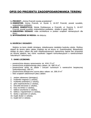 OPIS DO PROJEKTU ZAGOSPODAROWANIA TERENU 1. PROJEKT: „Gmina Przerośl rozwija przedszkola”. 2. INWESTOR: Gmina Przerośl, ul. Rynek 2, 16-427 Przerośl, powiat suwalski, województwo podlaskie . 3. ADRES INWESTYCJI: Szkoła Podstawowa w Przerośli, ul. Dworna 5, 16-427 Przerośl, powiat suwalski, województwo podlaskie, działka nr geod. 385/4. 4. ZABUDOWA DZIAŁKI: mała architektura w postaci urządzeń rekreacyjnych dla dzieci. 5. WYPOSAŻENIE W MEDIA: nie dotyczy. 6. DOJŚCIA I DOJAZDY: Wejście na teren działki istniejące, zlokalizowane niedaleko budynku szkoły. Możliwy dojazd do terenu placu zabaw znajduje się od strony ul. Zusenkowskiej. Bezpośredni dostęp do placu zabaw dla osób niepełnosprawnych zapewniony będzie bez przeszkód po terenie płaskim, bez różnic wysokości ciągami komunikacyjnymi o nawierzchniach naturalnych i betonowych. 7. DANE LICZBOWE: powierzchnia obszaru opracowania: ok. 4341.73 m2, powierzchnia projektowanego placu zabaw: ok. 408.19 m2, powierzchnia strefy do zabaw i ćwiczeń ruchowych o nawierzchni bezpiecznej (poliuretanowej): 200 m², 2 • powierzchnia biologicznie czynna placu zabaw: ok. 208.19 m • ilość urządzeń zabawowych placu zabaw: • • • 1. 2. 3. 4. 5. 6. 7. 8. 9. 10. 11. zestaw zabawowy (istniejący), huśtawka wagowa (1 sztuka), huśtawka podwójna (1 sztuka), góra wspinaczkowa (1 sztuka), karuzela tarczowa (1 sztuka), kosz na śmieci (1 sztuka), tablica rysunkowa (1 sztuka), tablica z regulaminem (1 sztuka), ławka z oparciem (2 sztuki), bujak skuter (1 sztuka), bujak koń (1 sztuka). 8. LOKALIZACJA OBIEKTÓW: Wszystkie urządzenia zabawowe projektowanego placu zabaw wykonane są, jako konstrukcja stalowa lub drewniana; zabezpieczona antykorozyjnie poprzez malowanie proszkowe. W ich konstrukcji użyto elementów z różnokolorowego tworzywa HDPE. Wybrane urządzenia, zostały luźno rozstawione na terenie opracowania, zgodnie z warunkami technicznymi, jakim powinny odpowiadać budynki i ich usytuowanie oraz wymogami dotyczącymi stref bezpieczeństwa poszczególnych urządzeń placów zabaw. 9. OGRODZENIE DZIAŁKI: Działka szkolna aktualnie ogrodzona. Podstawę ogrodzenia stanowi betonowa belka podwalinowa, o szerokości ok. 25 cm. Na niej, zamontowane są słupki stalowe z rur ocynkowanych, do których przymocowano siatkę stalową (w ramach) o wym. oczka 50x50 mm. Ogrodzenie pozostaje istniejące. Bramy prowadzące na teren Szkoły Podstawowej w Przerośli zlokalizowano w północno - zachodniej i północno - wschodniej części działki. 10. OGRODZENIE PLACU ZABAW: Ogrodzenie placu zabaw pozostaje istniejące, składa się z betonowej belki podwalinowej, o szerokości ok. 25 cm i słupków stalowych z rur ocynkowanych, do których przymocowano siatkę stalową o wym. oczka 50x50 mm. 11. KOSZE NA ŚMIECI: W projekcie przewidziano montaż nowego kosza na śmieci. 12. NAWIERZCHNIA UTWARDZONA PLACU ZABAW: • Strefa do zabaw i ćwiczeń ruchowych o nawierzchni bezpiecznej (poliuretanowej) na podbudowie mineralnej w kolorze ceglastym. KONSTRUKCJA NAWIERZCHNI PLACU ZABAW: • nawierzchnia poliuretanowa o minimalnej grubości h= 53 mm, zgodna z wymogami normy PN-EN1177, • warstwa klinująca z kruszywa łamanego - frakcja do 31,5 mm gr. 5 cm, • warstwa konstrukcyjna z kruszywa łamanego - frakcja 31,5 mm - 63 mm - gr. 10 cm, • warstwa podbudowy - gr. 10 cm - kruszywo naturalne (POSPÓŁKA), • warstwa odsączająca z kruszywa - współczynnik K>10m/d gr.15 cm, CBR>20%, • podłoże gruntowe G1 E>100 MPa Nawierzchnia utwardzona placu zabaw ograniczona jest betonowym obrzeżem chodnikowym o wym. 8/30/100 cm. 13. ZIELEŃ: Urządzenie terenów zielonych, obsadzenie roślinnością ogrodową, pozostawia się w gestii Inwestora. Należy zwrócić uwagę na dobór roślinności nie stwarzającej niebezpieczeństwa skaleczeń lub innych podobnych urazów wśród małych użytkowników placu. 14. PRZEZNACZENIE PLACU I CHARAKTERYSTYKA PLACU: Teren opracowania znajduje się w bliskim sąsiedztwie Szkoły Podstawowej w Przerośli. Jego położenie umożliwia dogodny i bezpieczny dostęp użytkownikom oraz wymagane dla jego funkcji naturalne naświetlenie. Na terenie działki nr geod. 385/4 znajduje się już plac zabaw dla dzieci. Zawiera on drewniane obiekty zabawowe dla dzieci. Należy je zdemontować, ponieważ w ich miejscu projektuje się nowe urządzenia placu zabaw. Wyjątkiem jest drewniany zestaw zabawowy z dwiema wieżami, którego nie należy likwidować. Ogrodzenie placu zabaw pozostaje bez zmian. Projektuje się także wykonanie 200 m2 bezpiecznej nawierzchni placu zabaw (kolor ceglasty). Projektowane obiekty mają na celu zwiększenie dostępności oraz walorów użytkowych terenu, nie ingerując jednocześnie w dużym stopniu w jego naturalne ukształtowanie. Nie zmienia się również istniejącego układu komunikacyjnego. Całość założenia została wkomponowana w naturalny, istniejący krajobraz. Wybrane urządzenia rekreacyjne zostały luźno rozstawione w obrębie opracowania, w sposób mający na celu jak najlepsze wkomponowanie w istniejący układ urbanistyczny. Rodzaje i rozmieszczenie projektowanych obiektów zamieszczono na rysunku nr 1: „Projekt zagospodarowania terenu”. • Spis urządzeń zabawowych projektowanego placu zabaw: 1. zestaw zabawowy (istniejący), 2. huśtawka wagowa, 3. huśtawka podwójna, 4. góra wspinaczkowa, 5. karuzela tarczowa, 6. kosz na śmieci, 7. tablica rysunkowa, 8. tablica z regulaminem, 9. ławka z oparciem (2 sztuki), 10. bujak skuter, 11. bujak koń. 15. WPŁYW PROJEKTOWANEJ INWESTYCJI I ODDZIAŁYWANIE NA DZIAŁKI SĄSIADÓW: • • NA ŚRODOWISKO projektowana budowa zgodna jest z przeznaczeniem działki, odległości projektowanych obiektów oraz ich przeznaczenie nie wywierają szkodliwego oddziaływania na działki sąsiadów i zabudowę budynków sąsiednich. 16. ODWODNIENIE TERENU Odwodnienie terenu placu zabaw odbywać się będzie w sposób grawita