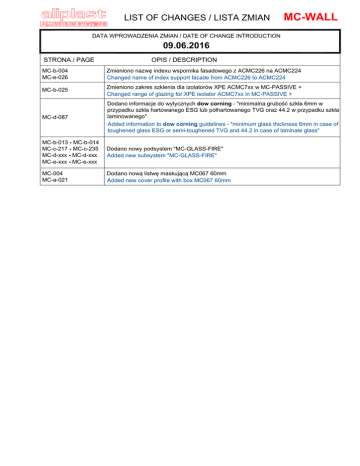 LIST OF CHANGES / LISTA ZMIAN MC-WALL DATA WPROWADZENIA ZMIAN / DATE OF CHANGE INTRODUCTION 09.06.2016 STRONA / PAGE OPIS / DESCRIPTION MC-b-004 MC-e-026 Zmieniono nazwę indexu wspornika fasadowego z ACMC226 na ACMC224 Changed name of index support facade from ACMC226 to ACMC224 MC-b-025 Zmieniono zakres szklenia dla izolatorów XPE ACMC7xx w MC-PASSIVE + Changed range of glazing for XPE isolator ACMC7xx in MC-PASSIVE + MC-d-087 Dodano informacje do wytycznych dow corning - "minimalna grubość szkła 6mm w przypadku szkła hartowanego ESG lub półhartowanego TVG oraz 44.2 w przypadku szkła laminowanego" Added information to dow corning guidelines - "minimum glass thickness 6mm in case of toughened glass ESG or semi-toughened TVG and 44.2 in case of laminate glass" MC-b-013 - MC-b-014 MC-c-217 - MC-c-235 MC-d-xxx - MC-d-xxx MC-e-xxx - MC-e-xxx Dodano nowy podsystem "MC-GLASS-FIRE" Added new subsystem "MC-GLASS-FIRE" MC-004 MC-a-021 Dodano nową listwę maskującą MC067 60mm Added new cover profile with box MC067 60mm