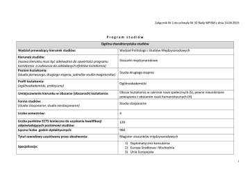 Załącznik Nr 2 do uchwały Nr 32 Rady WPiSM z dnia 14.04.2015 Program studiów Ogólna charakterystyka studiów Wydział prowadzący kierunek studiów: Kierunek studiów: (nazwa kierunku musi być adekwatna do zawartości programu kształcenia a zwłaszcza do zakładanych efektów kształcenia) Poziom kształcenia: (studia pierwszego, drugiego stopnia, jednolite studia magisterskie) Wydział Politologii i Studiów Międzynarodowych Stosunki międzynarodowe Studia drugiego stopnia Profil kształcenia: (ogólnoakademicki, praktyczny) Ogólnoakademicki Umiejscowienie kierunku w obszarze (obszarach) kształcenia: Obszar kształcenia w zakresie nauk społecznych (S), pewne nieuniknione powiązania z obszarem nauk humanistycznych (H) Forma studiów: (studia stacjonarne, studia niestacjonarne) Studia stacjonarne Liczba semestrów: 4 Liczba punktów ECTS konieczna do uzyskania kwalifikacji odpowiadających poziomowi studiów: Łączna liczba godzin dydaktycznych: 120 Tytuł zawodowy uzyskiwany przez absolwenta: Magister stosunków międzynarodowych Specjalizacje: 960 1) Dyplomatyczno-konsularna 2) Europa Środkowa i Wschodnia 3) Unia Europejska 1 4) Międzynarodowe stosunki ekonomiczne i problemy globalne Absolwent studiów magisterskich kierunku stosunki międzynarodowe posiada rozszerzoną – w stosunku do studiów pierwszego stopnia – interdyscyplinarną wiedzę z obszaru stosunków międzynarodowych, zwłaszcza z zakresu międzynarodowej problematyki ekonomicznej, społecznej, politycznej i prawnej. Zna teorię i praktykę stosunków międzynarodowych oraz teorię i praktykę podejmowania decyzji politycznych i gospodarczych. Absolwent posiada również umiejętności analityczne i metodologiczne, pozwalające podejmować pracę na stanowiskach wymagających świadomych, racjonalnych i trafnych ocen i opinii oraz ma wpojone nawyki osobistej odpowiedzialności i inicjatywy. Ogólne cele kształcenia oraz możliwości zatrudnienia i kontynuacji kształcenia przez absolwentów kierunku: Wskazanie związku programu kształcenia z misją i strategią UMK: Ponadto, Absolwent jest przygotowany - w zależności od wybranej specjalizacji - do podjęcia pracy m.in. w instytucjach i przedsiębiorstwach związanych z obrotem międzynarodowym, organizacjach i instytucjach międzynarodowych, jednostkach administracji państwowej związanych z polityką zagraniczną i gospodarczą, placówkach dyplomatycznych i konsularnych. Co więcej, Absolwent rozumie konieczność ustawicznego kształcenia i rozwoju zawodowego oraz jest przygotowany do podejmowania wyzwań badawczych i kontynuacji edukacji na studiach trzeciego stopnia (doktoranckich). Przedstawiany Kierunek studiów stanowi jeden z elementów szerokiej oferty Uniwersytetu, pozwalającej na umacnianie jego pozycji pośród kluczowych polskich uczelni wyższych (pkt B.1.1.*). Co więcej, Program ten wpisuje się w ideę Procesu Bolońskiego (pkt B.1.4.*), a Studenci mają możliwość uczestnictwa w międzynarodowych programach stypendialnych (pkt B.1.2. i B.1.3.*). Program przyczynia się również do rozszerzania centralnie tworzonej oferty zajęć fakultatywnych (pkt B.3.1.*). 2 *Strategia Rozwoju Uniwersytetu Mikołaja Kopernika w Toruniu na lata 20112020 (Uchwała Senatu UMK nr 59 z 2011 roku). Przedstawiany Program studiów dla kierunku Stosunki międzynarodowe (s2 stacjonarne) był wielokrotnie udoskonalany. Po pierwsze, zmiany konsultowano z pracownikami naukowo-dydaktycznymi prowadzącymi Wskazanie, czy w procesie definiowania efektów kształcenia oraz zajęcia na tym kierunku, w tym wchodzącymi w skład minimum kadrowego. w procesie przygotowania i udoskonalania programu studiów Ponadto, przy wprowadzaniu zmian pod uwagę brano, i tu po drugie, opinie uwzględniono opinie interesariuszy, w tym w szczególności studentów (wszystkich roczników) wyrażane w ankietach w systemie USOS studentów, absolwentów, pracodawców: oraz w trakcie spotkań z pełnomocnikiem Dziekana ds. dydaktycznych na tym kierunku. Wreszcie, tu po trzecie, uwzględniono uwagi interesariuszy zewnętrznych. Modyfikowany Program za każdym razem zyskać musiał również akceptację Rady Wydziału. Szczegółowe wymagania rekrutacyjne podane zostały na stronie głównej Uniwersytetu. Niezbędnym minimum jest tytuł zawodowy licencjata Wymagania wstępne (oczekiwane kompetencje kandydata) – (optymalnie stosunków międzynarodowych lub politologii) oraz zwłaszcza w przypadku studiów drugiego stopnia: zainteresowania dotyczące szeroko rozumianych nauk o polityce (zwłaszcza międzynarodowej). Moduły kształcenia wraz z zakładanymi efekty kształcenia Moduły kształcenia Moduł kształcenia I: podstawowy Liczba punktów ECTS Charakter zajęć obligatoryjny/ fakultatywny Ekonomia rozwoju 3 obligatoryjny Przynależność do obszaru kształcenia (w przypadku przyporządkowania kierunku do więcej niż jednego obszaru kształcenia) S Globalizacja i regionalizacja 4 obligatoryjny S Przedmioty Zakładane efekty kształcenia WIEDZA: Zna na poziomie rozszerzonym terminologię używaną w dziedzinach nauki, w ramach których Sposoby weryfikacji zakładanych efektów kształcenia osiąganych przez studenta Obecność na zajęciach, dyskusja, kolokwia, prezentacje multimedialne, zaliczenie na ocenę, 3 są prowadzone badania nad stosunkami międzynarodowymi . Zna dorobek współczesnej ekonomii w zakresie badania przyczyn i przejawów zacofania ekonomicznospołecznego. Ma uporządkowaną wiedzę o procesach globalizacji i regionalizacji. egzamin UMIEJĘTNOŚCI: Wyszukuje, selekcjonuje, ocenia i przetwarza informacje ze źródeł pisanych i elektronicznych oraz interpretuje je z punktu widzenia problemów stosunków międzynarodowych. Wykorzystuje wiedzę teoretyczną z zakresu dyscyplin dla opisu i analizy problemów międzynarodowych. Potrafi w sposób spójny i przejrzysty wypowiadać się ustnie, w języku polskim i obcym, o zagadnieniach 4 stanowiących przedmiot za