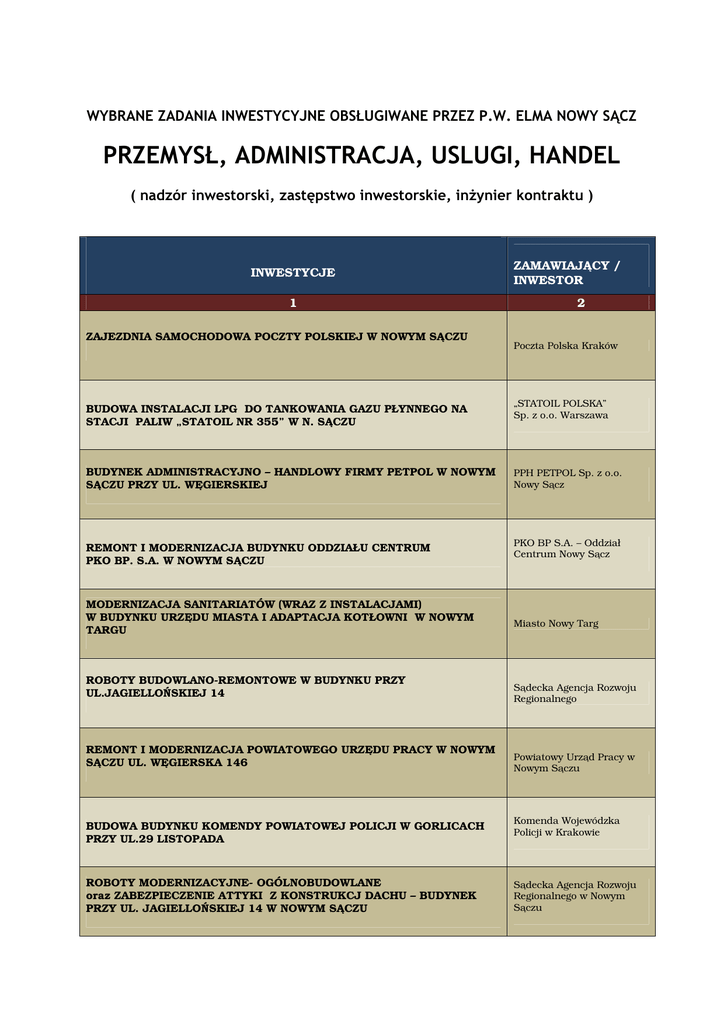 WYBRANE ZADANIA INWESTYCYJNE OBSŁUGIWANE PRZEZ P.W. ELMA NOWY SĄCZ PRZEMYSŁ, ADMINISTRACJA, USLUGI, HANDEL ( nadzór inwestorski, zastępstwo inwestorskie, inżynier kontraktu ) INWESTYCJE 1 ZAJEZDNIA SAMOCHODOWA POCZTY POLSKIEJ W NOWYM SĄCZU ZAMAWIAJĄCY / INWESTOR 2 Poczta Polska Kraków BUDOWA INSTALACJI LPG DO TANKOWANIA GAZU PŁYNNEGO NA STACJI PALIW „STATOIL NR 355” W N. SĄCZU „STATOIL POLSKA” Sp. z o.o. Warszawa BUDYNEK ADMINISTRACYJNO – HANDLOWY FIRMY PETPOL W NOWYM SĄCZU PRZY UL. WĘGIERSKIEJ PPH PETPOL Sp. z o.o. Nowy Sącz REMONT I MODERNIZACJA BUDYNKU ODDZIAŁU CENTRUM PKO BP. S.A. W NOWYM SĄCZU PKO BP S.A. – Oddział Centrum Nowy Sącz MODERNIZACJA SANITARIATÓW (WRAZ Z INSTALACJAMI) W BUDYNKU URZĘDU MIASTA I ADAPTACJA KOTŁOWNI W NOWYM TARGU ROBOTY BUDOWLANO-REMONTOWE W BUDYNKU PRZY UL.JAGIELLOŃSKIEJ 14 REMONT I MODERNIZACJA POWIATOWEGO URZĘDU PRACY W NOWYM SĄCZU UL. WĘGIERSKA 146 Miasto Nowy Targ Sądecka Agencja Rozwoju Regionalnego Powiatowy Urząd Pracy w Nowym Sączu BUDOWA BUDYNKU KOMENDY POWIATOWEJ POLICJI W GORLICACH PRZY UL.29 LISTOPADA Komenda Wojewódzka Policji w Krakowie ROBOTY MODERNIZACYJNE- OGÓLNOBUDOWLANE oraz ZABEZPIECZENIE ATTYKI Z KONSTRUKCJ DACHU – BUDYNEK PRZY UL. JAGIELLOŃSKIEJ 14 W NOWYM SĄCZU Sądecka Agencja Rozwoju Regionalnego w Nowym Sączu BUDYNEK CENTRUM HANDLOWEGO „BIEDRONKA” RZY UL. ZIELONEJ W NOWYM SĄCZU GORTEX IMPORT EXPORT Adam Górski BUDOWA W SALONU SAMOCHODOWEGO FORDA WRAZ Z ROBOTAMI ZEWNĘTRZNYMI PRZY UL. WĘGIERSKIEJ 166 W NOWYM SĄCZU „ WIKAR ” Autoryzowany Diler Forda Nowy Sącz ROZBUDOWA I MODERNIZACJA STRAŻNICY JEDNOSTKI RATOWNICZO GAŚNICZEJ PAŃSTWOWEJ STRAŻY POŻARNEJ W LIMANOWEJ Komenda Powiatowa Straży Pożarnej w Limanowej BUDYNEK KOMISARIATU POLICJI W STARYM SĄCZU Starostwo Powiatowe W Nowy Sączu ROZBUDOWA I NADBUDOWA ISTNIEJĄCEGO BUDYNKU ADMINISTRACYJNEGO DRUKARNI BAAD WRAZ Z INFRASTRUKTURĄ TECHNICZNĄ Drukarnia BAAD Sp. z o.o. Nowy Sącz ADAPTACJA CZĘŚCI STRYCHOWEJ NA POMIESZCZENIA BIUROWE Samorządowe Kolegium Odwoławcze w Nowym Sączu BUDOWA BUDYNKU ADMINISTRACYJNO-SOCJALNEGO Z HALĄ USŁUGOWO-NAPRAWCZĄ TABORU SAMOCHODOWEGO FIRMY NOXPOL WRAZ ZE STACJĄ PALIW PŁYNNYCH PRZY UL. JANA PAWŁA II W NOWYM SĄCZU BUDOWA SIEDZIBY URZĘDU SKARBOWEGO W NOWYM TARGU BUDOWA SALONU SPRZEDAŻY SAMOCHODÓW MERCEDES WRAZ Z SERWISEM SAMOCHODÓW OSOBOWYCH, DOSTAWCZYCH i CIĘŻAROWYCH MERCEDES-BENZ W NOWYM SĄCZU - ETAP I, WRAZ Z NIEZBĘDNĄ INFRASTRUKTURĄ TECHNICZNĄ I OBSŁUGĄ KOMUNIKACYJNĄ ROZBUDOWA BUDYNKU PRODUKCYJNEGO DRUKARNI „BAAD” w NOWYM SĄCZU PRZY UL. ELEKTRODOWEJ 45 C - HALA PRODUKCYJNA, NADBUDOWA CZĘŚCI ADMINISTRACYJNEJ, PRZEPOMPOWNIA WÓD OPADOWYCH BUDOWA HALI WARSZTATOWO-PRODUKCYJNEJ WRAZ Z ZAPLECZEM ADMINISTRACYJNO-SOCJALNYM PRZY UL. WĘGIERSKIEJ W NOWYM SĄCZU BUDOWA ZAKŁADU USŁUG PRODUKCYJNYCH – PIEKARNIA CIASTKARNIA W JABŁONCE NOX POL Sp. z o.o. Nowy Sącz IZBA SKARBOWA w KRAKOWIE SOBIESŁAW ZASADA Kraków FLEXERGIS Sp. z o.o. Nowy Sącz Przedsiębiorstwo UsługowoProdukcyjne CERBUD Sp. z o.o. w Nowym Sączu Piekarnio-CukierniaDelikatesy RYSZARD STESKAL Spółka Jawna Jabłonka BUDOWA BUDYNKU BIUTOWO- SOCJALNEGO I HALI PRODUKCYJNEJ ZAKŁADU PRODUKCYJNEGO PLASTWAG WRAZ ZINFRASTRUKTURĄ W MIELCU Plastwag Sp. z o.o. Mielec