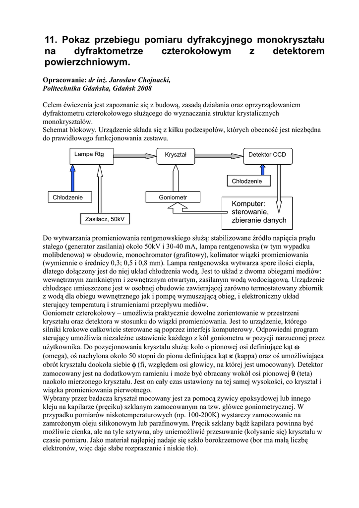 11. Pokaz przebiegu pomiaru dyfrakcyjnego monokryształu na dyfraktometrze czterokołowym z detektorem powierzchniowym. Opracowanie: dr inŜ. Jarosław Chojnacki, Politechnika Gdańska, Gdańsk 2008 Celem ćwiczenia jest zapoznanie się z budową, zasadą działania oraz oprzyrządowaniem dyfraktometru czterokołowego słuŜącego do wyznaczania struktur krystalicznych monokryształów. Schemat blokowy. Urządzenie składa się z kilku podzespołów, których obecność jest niezbędna do prawidłowego funkcjonowania zestawu. Lampa Rtg Kryształ Detektor CCD Chłodzenie Chłodzenie Goniometr Zasilacz, 50kV Komputer: sterowanie, zbieranie danych Do wytwarzania promieniowania rentgenowskiego słuŜą: stabilizowane źródło napięcia prądu stałego (generator zasilania) około 50kV i 30-40 mA, lampa rentgenowska (w tym wypadku molibdenowa) w obudowie, monochromator (grafitowy), kolimator wiązki promieniowania (wymiennie o średnicy 0,3; 0,5 i 0,8 mm). Lampa rentgenowska wytwarza spore ilości ciepła, dlatego dołączony jest do niej układ chłodzenia wodą. Jest to układ z dwoma obiegami mediów: wewnętrznym zamkniętym i zewnętrznym otwartym, zasilanym wodą wodociągową. Urządzenie chłodzące umieszczone jest w osobnej obudowie zawierającej zarówno termostatowany zbiornik z wodą dla obiegu wewnętrznego jak i pompę wymuszającą obieg, i elektroniczny układ sterujący temperaturą i strumieniami przepływu mediów. Goniometr czterokołowy – umoŜliwia praktycznie dowolne zorientowanie w przestrzeni kryształu oraz detektora w stosunku do wiązki promieniowania. Jest to urządzenie, którego silniki krokowe całkowicie sterowane są poprzez interfejs komputerowy. Odpowiedni program sterujący umoŜliwia niezaleŜne ustawienie kaŜdego z kół goniometru w pozycji narzuconej przez uŜytkownika. Do pozycjonowania kryształu słuŜą: koło o pionowej osi definiujące kąt ω (omega), oś nachylona około 50 stopni do pionu definiująca kąt κ (kappa) oraz oś umoŜliwiająca obrót kryształu dookoła siebie φ (fi, względem osi głowicy, na której jest umocowany). Detektor zamocowany jest na dodatkowym ramieniu i moŜe być obracany wokół osi pionowej θ (teta) naokoło mierzonego kryształu. Jest on cały czas ustawiony na tej samej wysokości, co kryształ i wiązka promieniowania pierwotnego. Wybrany przez badacza kryształ mocowany jest za pomocą Ŝywicy epoksydowej lub innego kleju na kapilarze (pręciku) szklanym zamocowanym na tzw. główce goniometrycznej. W przypadku pomiarów niskotemperaturowych (np. 100-200K) wystarczy zamocowanie na zamroŜonym oleju silikonowym lub parafinowym. Pręcik szklany bądź kapilara powinna być moŜliwie cienka, ale na tyle sztywna, aby uniemoŜliwić przesuwanie (kołysanie się) kryształu w czasie pomiaru. Jako materiał najlepiej nadaje się szkło borokrzemowe (bor ma małą liczbę elektronów, więc daje słabe rozpraszanie i niskie tło). Odpowiednie pokrętła na główce goniometrycznej umoŜliwiają przesuwanie kryształu zarówno w pionie jak i w poziomie. Dla prawidłowego przeprowadzenia pomiaru kryształ musi znajdować się w środku geometrycznym goniometru tak, aby zmiana ustawienia obiektu w stosunku do wiązki nie spowodowała "wyjścia" kryształu z wiązki promieniowania. Proces ustawienia kryształu w odpowiednią pozycję nazywa się centrowaniem kryształu. Kolejnym etapem przeprowadzania eksperymentu dyfrakcyjnego jest krótkie, pobieŜne przeskanowanie części sieci odwrotnej. Robi się je w celu oceny jakości kryształu, wstępnego wyznaczenia parametrów komórki elementarnej i rozstrzygnięcia, czy nie mamy do czynienia ze strukturą juŜ znaną. Procedurę tę (wstępnego pomiaru) nazywamy z angielska "peak hunting". Po poznaniu przybliŜonego, fragmentarycznego obrazu dyfrakcyjnego i ocenie jakości kryształu jako zadowalającej, przystępujemy do właściwego pomiaru. W tym celu rejestrujemy fotograficzny (filmowy) obraz kryształu z wszystkich stron w celu oceny rozmiarów i ewentualnie późniejszej korekcji absorpcji (jeśli jej wpływ jest istotny). Następnie decydujemy o parametrach pomiaru takich jak np. sposób skanowania i jego szerokość kątową, czas naświetlania pojedynczej ramki, fragment sfery Ewalda, który ma być mierzony itp. NaleŜy tu dodać, Ŝe ze względu na występującą symetrię sieci odwrotnej, czasami wystarczy zmierzenie intensywności refleksów z ¼ sfery Ewalda, czasami z 1/8 lub jeszcze mniejszego fragmentu. Po zmierzeniu odpowiedniej liczby refleksów odpowiedni program indeksuje refleksy, dokonuje przeliczenia intensywności refleksów na kwadraty czynników struktury – wprowadzając odpowiednie poprawki na polaryzację Lorentza oraz uwzględniając obecność tła nie wynikającego z dyfrakcji. Proces ten nazywamy redukcją danych (ang. data reduction). Czasami naleŜy dodatkowo wprowadzić poprawki wynikające z absorpcji. NaleŜy wówczas uwzględnić wymiaru i kształt kryształu. Mając zbiór kwadratów czynników struktury (popularnie zwany plikiem hkl) moŜna przystąpić do rozwiązania struktury i jej udokładnienia. To pierwsze pojęcie odnosi się do podania wstępnej struktury próbnej, natomiast to drugie polega na znalezieniu takich współrzędnych atomów, aby suma kwadratów odchyleń czynników struktury zmierzonych i obliczonych osiągnęła minimum. Inaczej mówiąc, pierwsze zagadnienie polega na rozwiązaniu problemu fazowego (nie znamy znaku liczby podniesionej do kwadratu, w przypadku liczb zespolonych – kąta fazowego) a drugie jest typowym zadaniem optymalizacyjnym - wykorzystaniem metody najmniejszych kwadratów. Uwagi dotyczące centrowania kryształu. Środek geometryczny przyrządu najprościej jest ustalić poprzez obrót kryształu o 180º. Wówczas krawędź zewnętrzna znajdzie się w odległości 2r od początkowego połoŜenia. Środek kryształu naleŜy więc umieścić pośrodku odległości przebytej przez k