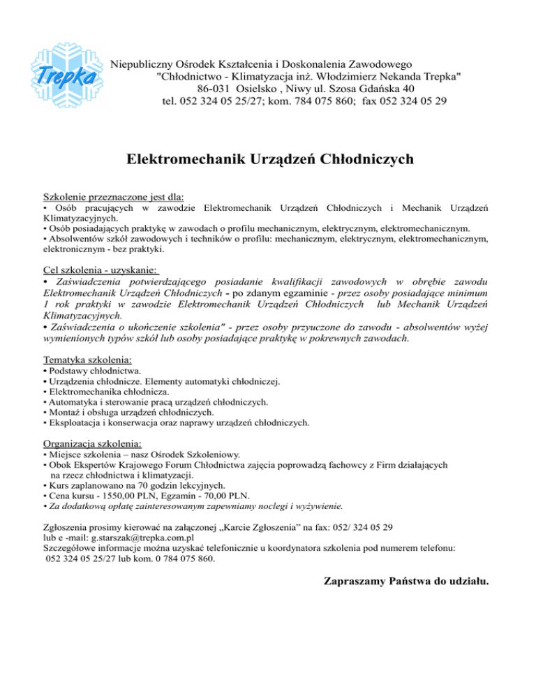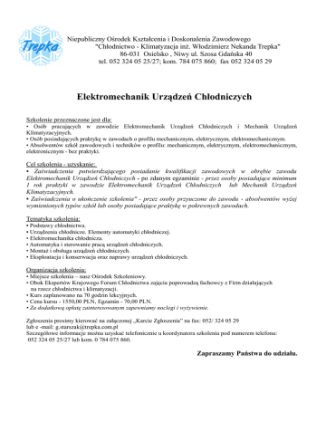 Niepubliczny Ośrodek Kształcenia i Doskonalenia Zawodowego "Chłodnictwo - Klimatyzacja inż. Włodzimierz Nekanda Trepka" 86-031 Osielsko , Niwy ul. Szosa Gdańska 40 tel. 052 324 05 25/27; kom. 784 075 860; fax 052 324 05 29 Elektromechanik Urządzeń Chłodniczych Szkolenie przeznaczone jest dla: • Osób pracujących w zawodzie Elektromechanik Urządzeń Chłodniczych i Mechanik Urządzeń Klimatyzacyjnych. • Osób posiadających praktykę w zawodach o profilu mechanicznym, elektrycznym, elektromechanicznym. • Absolwentów szkół zawodowych i techników o profilu: mechanicznym, elektrycznym, elektromechanicznym, elektronicznym - bez praktyki. Cel szkolenia - uzyskanie: • Zaświadczenia potwierdzającego posiadanie kwalifikacji zawodowych w obrębie zawodu Elektromechanik Urządzeń Chłodniczych - po zdanym egzaminie - przez osoby posiadające minimum 1 rok praktyki w zawodzie Elektromechanik Urządzeń Chłodniczych lub Mechanik Urządzeń Klimatyzacyjnych. • Zaświadczenia o ukończenie szkolenia" - przez osoby przyuczone do zawodu - absolwentów wyżej wymienionych typów szkół lub osoby posiadające praktykę w pokrewnych zawodach. Tematyka szkolenia: • Podstawy chłodnictwa. • Urządzenia chłodnicze. Elementy automatyki chłodniczej. • Elektromechanika chłodnicza. • Automatyka i sterowanie pracą urządzeń chłodniczych. • Montaż i obsługa urządzeń chłodniczych. • Eksploatacja i konserwacja oraz naprawy urządzeń chłodniczych. Organizacja szkolenia: • Miejsce szkolenia – nasz Ośrodek Szkoleniowy. • Obok Ekspertów Krajowego Forum Chłodnictwa zajęcia poprowadzą fachowcy z Firm działających na rzecz chłodnictwa i klimatyzacji. • Kurs zaplanowano na 70 godzin lekcyjnych. • Cena kursu - 1550,00 PLN, Egzamin - 70,00 PLN. • Za dodatkową opłatę zainteresowanym zapewniamy noclegi i wyżywienie. Zgłoszenia prosimy kierować na załączonej „Karcie Zgłoszenia” na fax: 052/ 324 05 29 lub e -mail: [email protected] Szczegółowe informacje można uzyskać telefonicznie u koordynatora szkolenia pod numerem telefonu: 052 324 05 25/27 lub kom. 0 784 075 860. Zapraszamy Państwa do udziału.