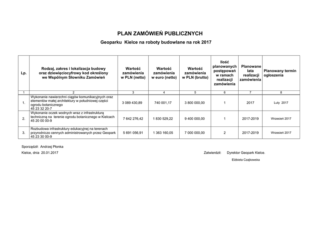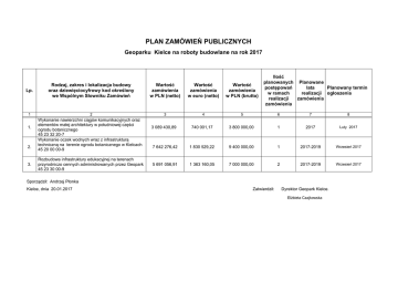 PLAN ZAMÓWIEŃ PUBLICZNYCH Geoparku Kielce na roboty budowlane na rok 2017 Lp. Rodzaj, zakres i lokalizacja budowy oraz dziewięciocyfrowy kod określony we Wspólnym Słowniku Zamówień Wartość zamówienia w PLN (netto) Wartość zamówienia w euro (netto) Wartość zamówienia w PLN (brutto) 2 3 4 5 6 7 8 1 1. 2. 3. Ilość planowanych Planowane postępowań lata Planowany termin w ramach realizacji ogłoszenia realizacji zamówienia zamówienia Wykonanie nawierzchni ciągów komunikacyjnych oraz elementów małej architektury w południowej części ogrodu botanicznego 45 23 32 20-7 Wykonanie oczek wodnych wraz z infrastrukturą techniczną na terenie ogrodu botanicznego w Kielcach 45 20 00 00-9 Rozbudowa infrastruktury edukacyjnej na terenach przyrodniczo cennych administrowanych przez Geopark 45 23 30 00-9 3 089 430,89 740 001,17 3 800 000,00 1 2017 Luty 2017 7 642 276,42 1 830 529,22 9 400 000,00 1 2017-2019 Wrzesień 2017 5 691 056,91 1 363 160,05 7 000 000,00 2 2017-2019 Wrzesień 2017 Sporządził: Andrzej Płonka Kielce, dnia 20.01.2017 Zatwierdził: Dyrektor Geopark Kielce. Elżbieta Czajkowska